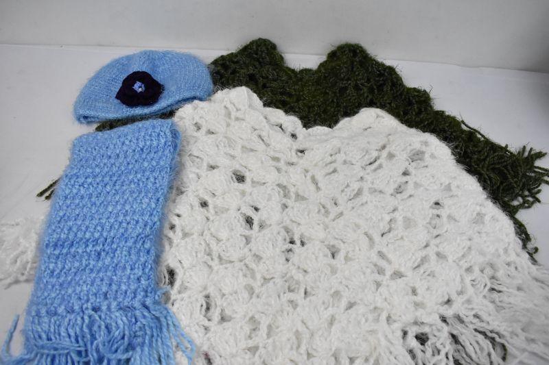 4 pc Winter Wear: Blue Hat & Scarf, White Poncho Shawl, Green Poncho Shawl. So Soft. No Tags - New
