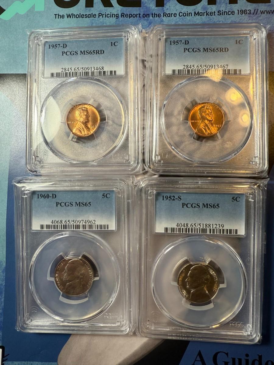 (4) PCGS CERTIFIED 2-1957-D MS65 RED, 1-1960-D MS65, & 1-1952-S MS65 COINS AS PICTURED. $5 DOMESTIC SHIPPING.