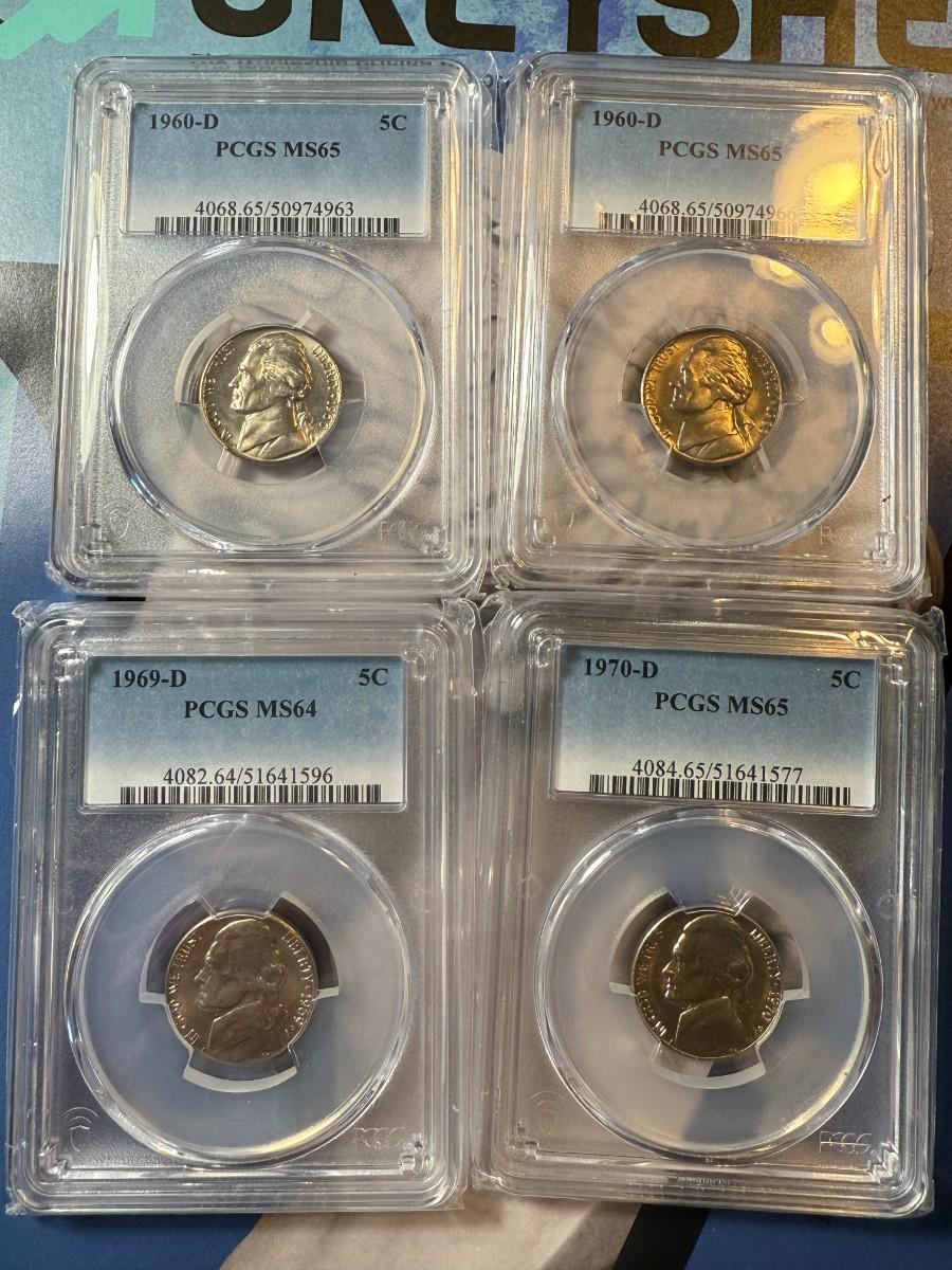 (4) PCGS CERTIFIED 2-1960-D MS65, 1-1969-D MS64, & 1-1970-D MS65 COINS AS PICTURED. $5 DOMESTIC SHIPPING.