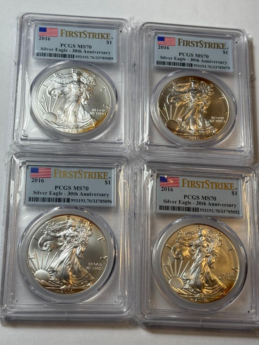 (4) PCGS CERTIFIED FIRST STRIKE 2016 MS70 VERY LIGHTLY TONED RIMS SILVER EAGLE DOLLARS 1-OUNCE 30TH ANNIVERSARY AS PICTURED. $7 DOMESTIC SHIPPING.
