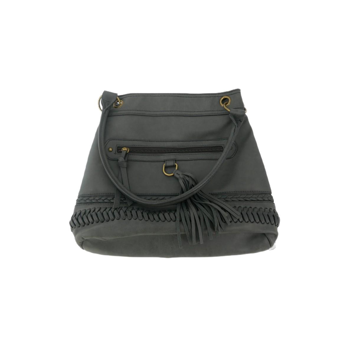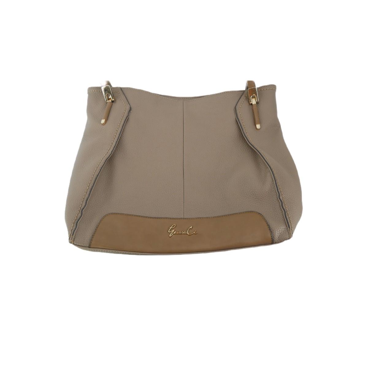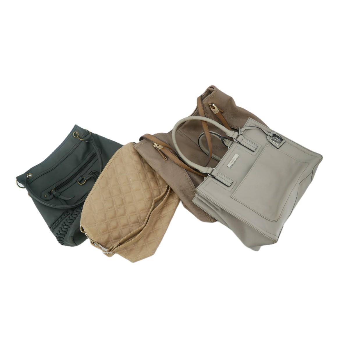 Lot of four assorted purses - medium to large size shoulder bags. Included is a grey Nine West shoulder purse, Gussaci shoulder bag, brown quilted crossbody purse, and dark grey shoulder purse with floral interior. Pre-owned, may have scuffs, marks, and cracking in leather. All in good condition. (F30)
