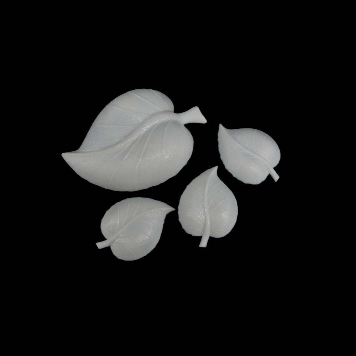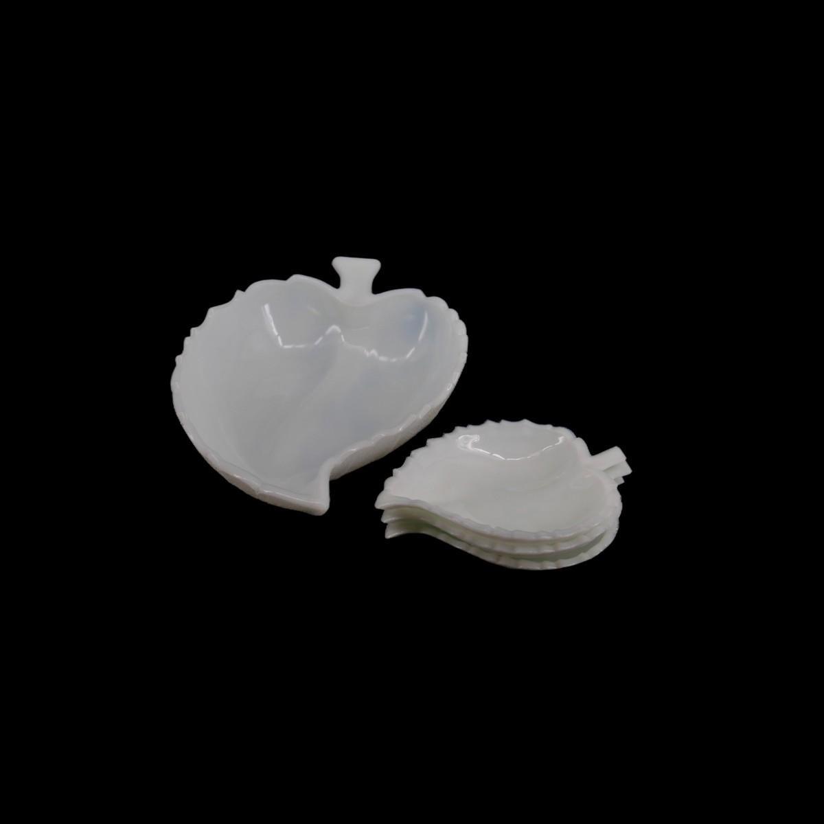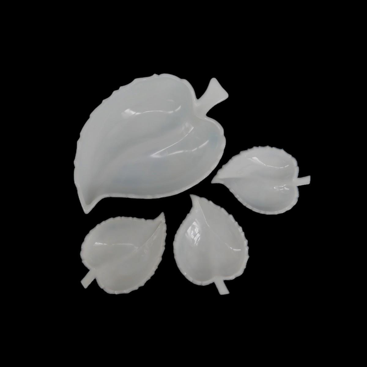Set of white glass leaf designed dishes. One large serving dish and three smaller dishes. Excellent condition, no issues found. Largest measures 7.25" x 11" x 2.5" and smaller three each measure 4.25" x 6 " x 1". Packaged lot weighs 4 lbs. (G53)