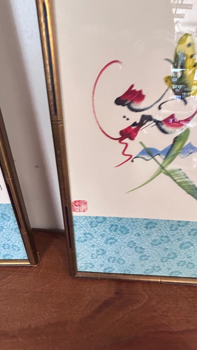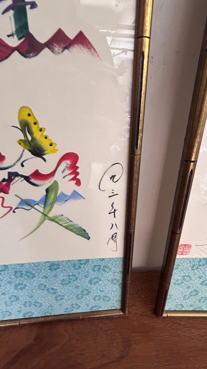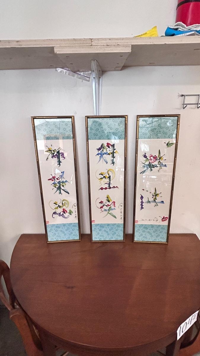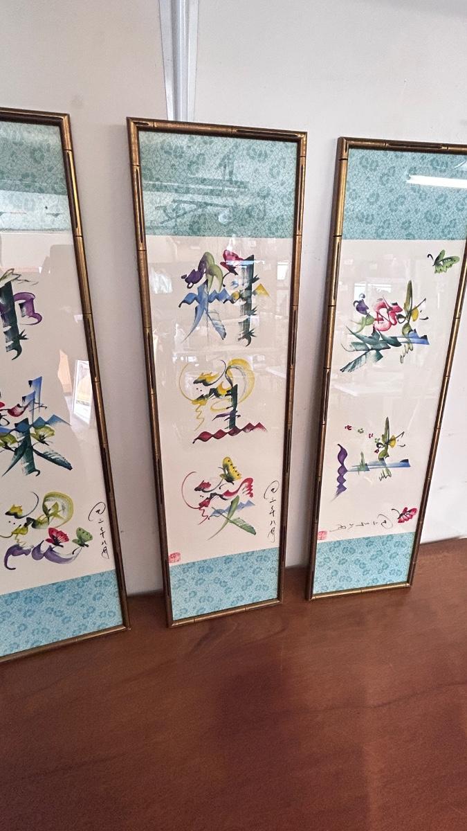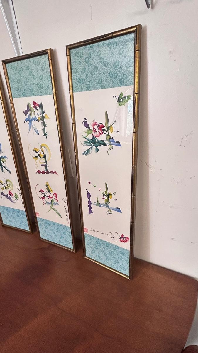 4 PIECE SET OF SIGNED ASIAN ARTWORK ( 4th in separate pic)