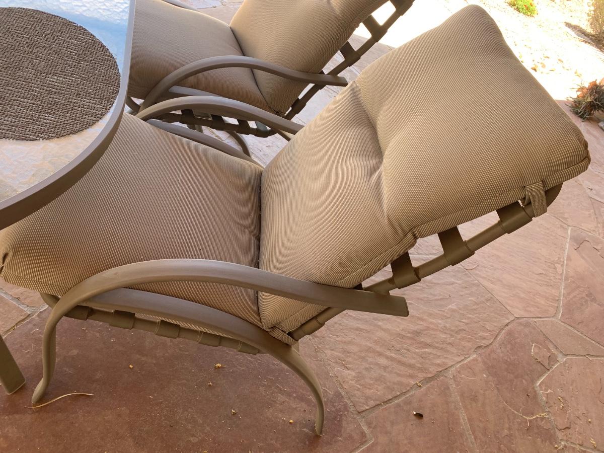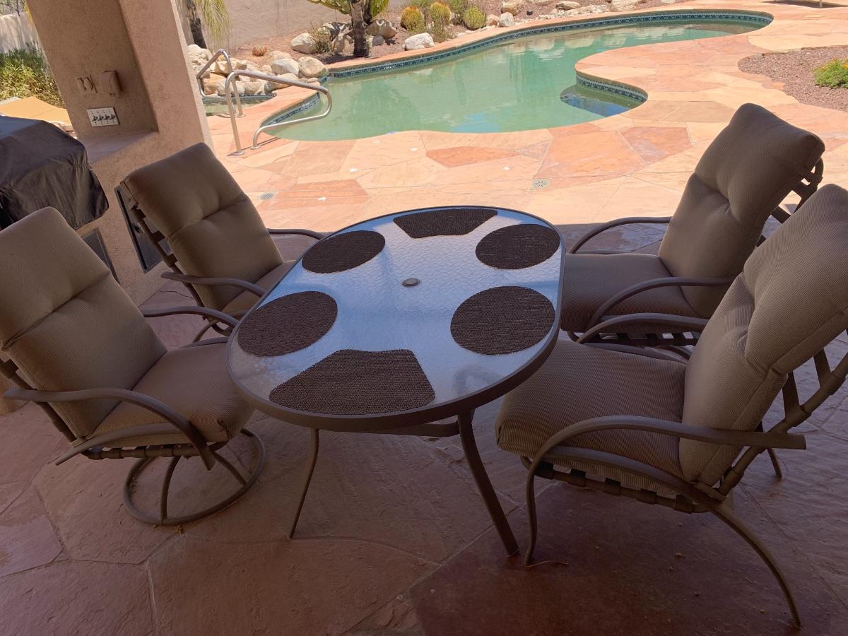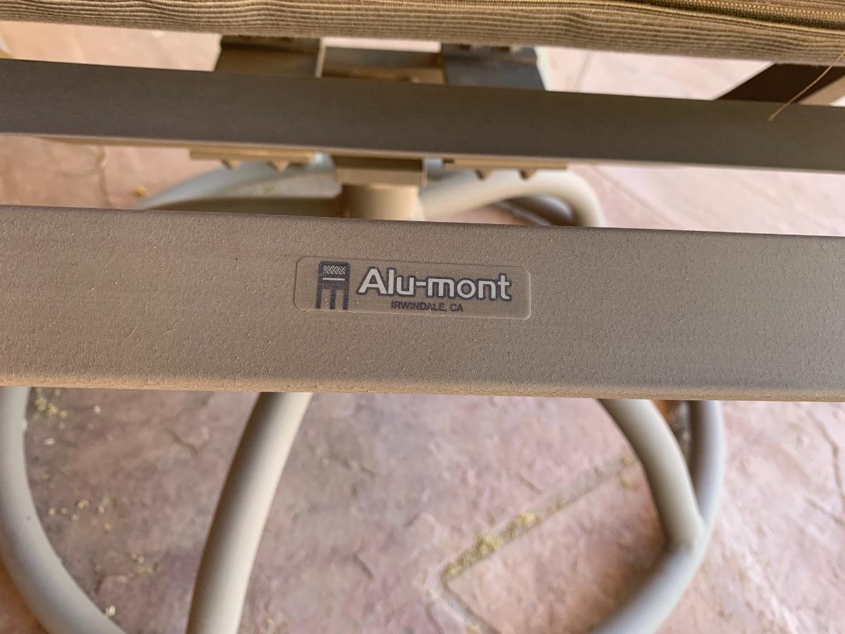ALU-mont patio table tempered glass with 4 chairs and new cushions retailing at $1000