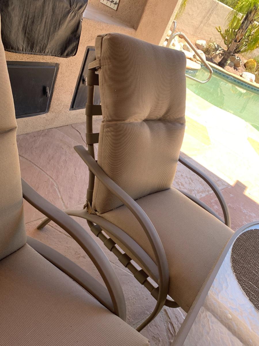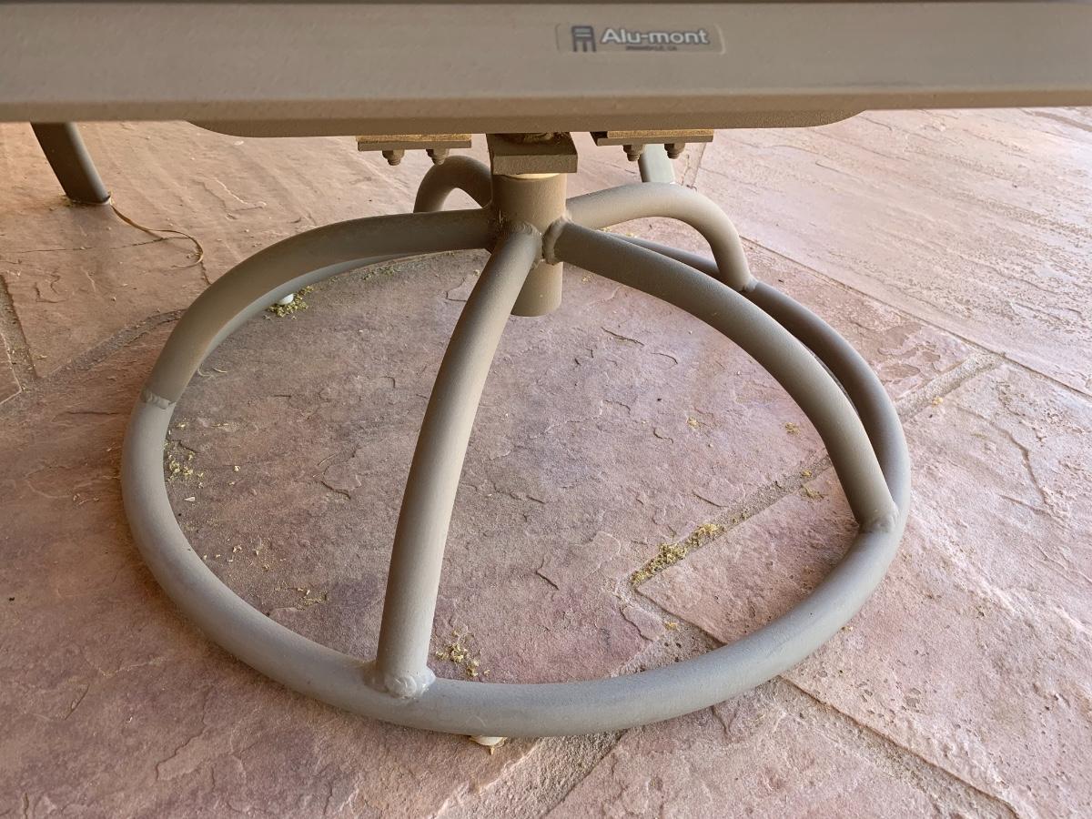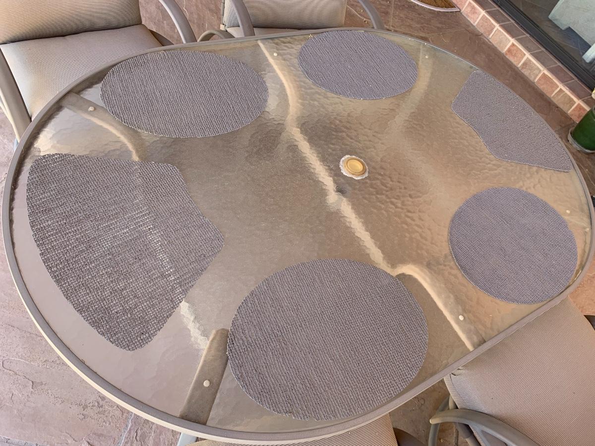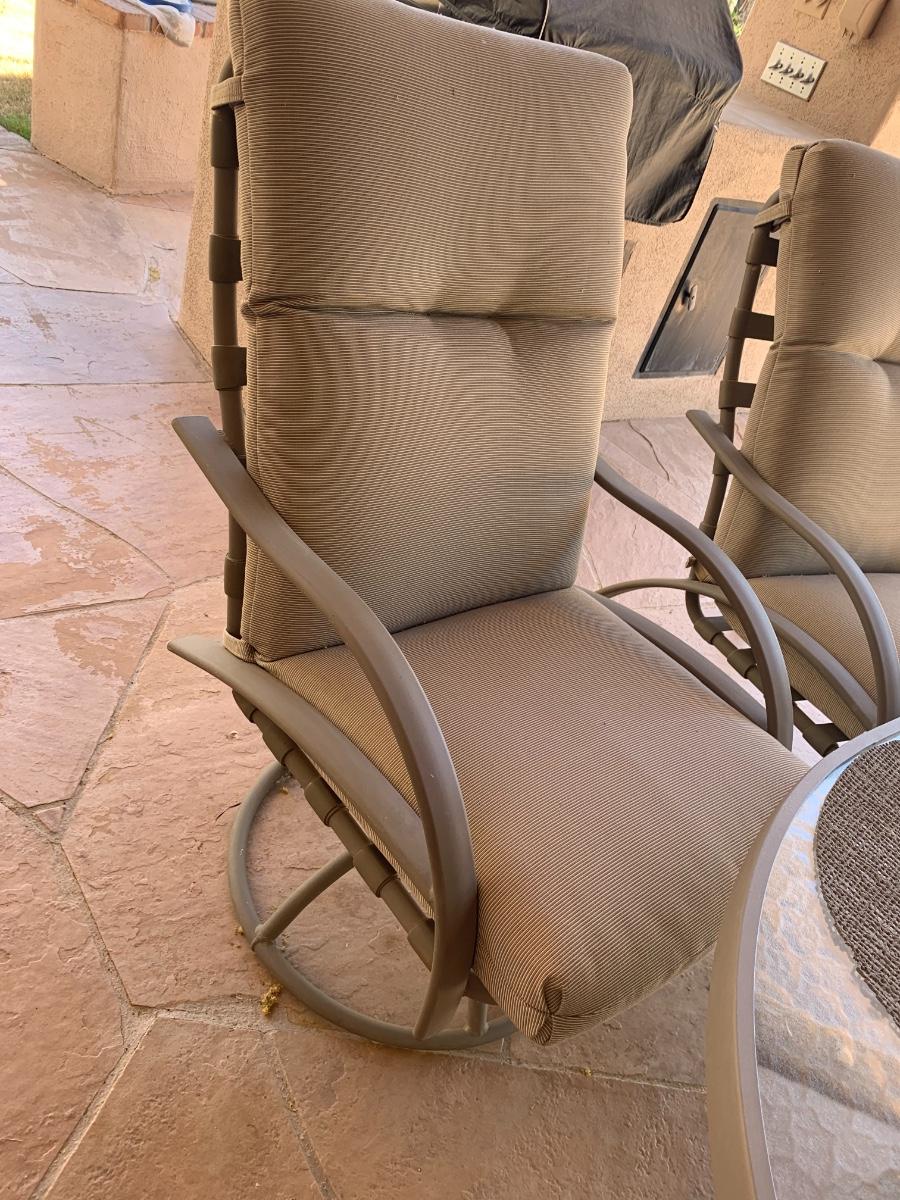 ALU-mont patio table tempered glass with 4 chairs and new cushions retailing at $1000