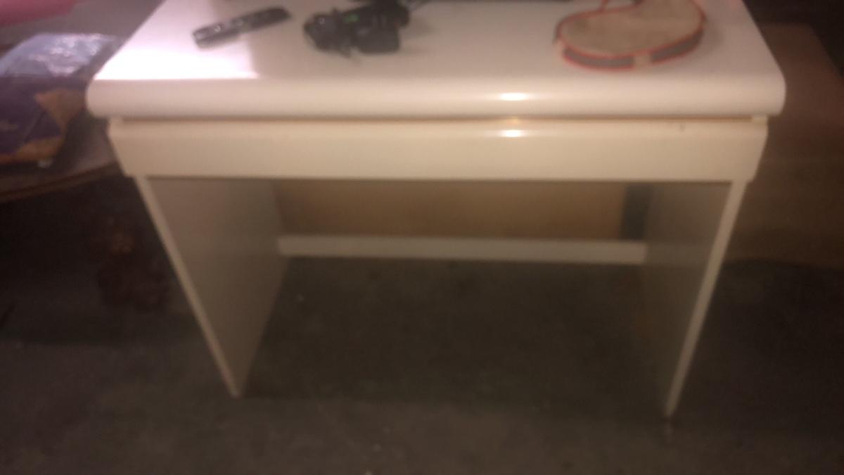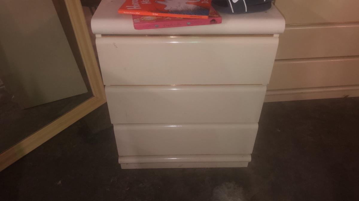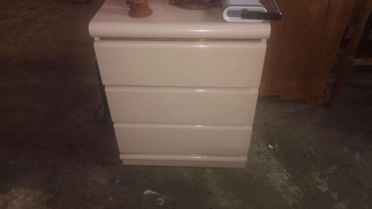 This is a great vintage laminate set. Includes desk (36 x 18x 30), two nightstands (24 x 18 x 29) and entertainment center (37 x 21 x 74). Entertainment center is missing one piece of glass at top