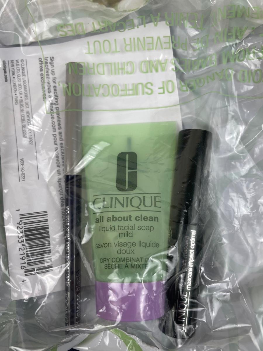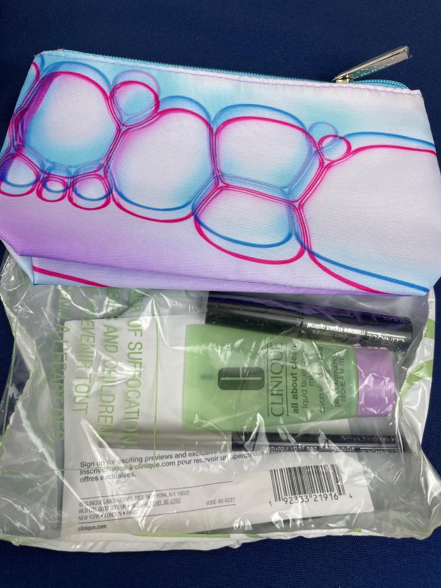 Eyeliner, mascara, facial cleanser and cosmetic bag. Travel sizes.