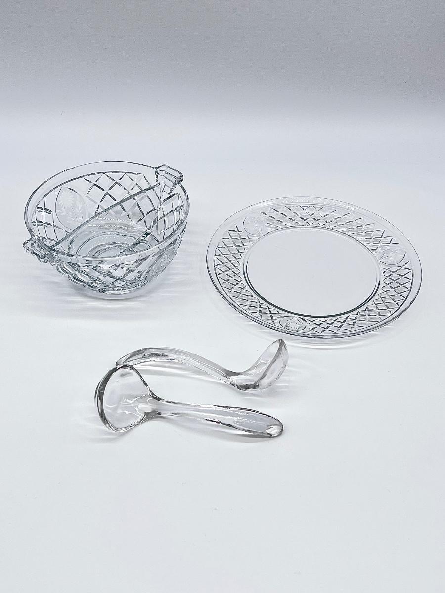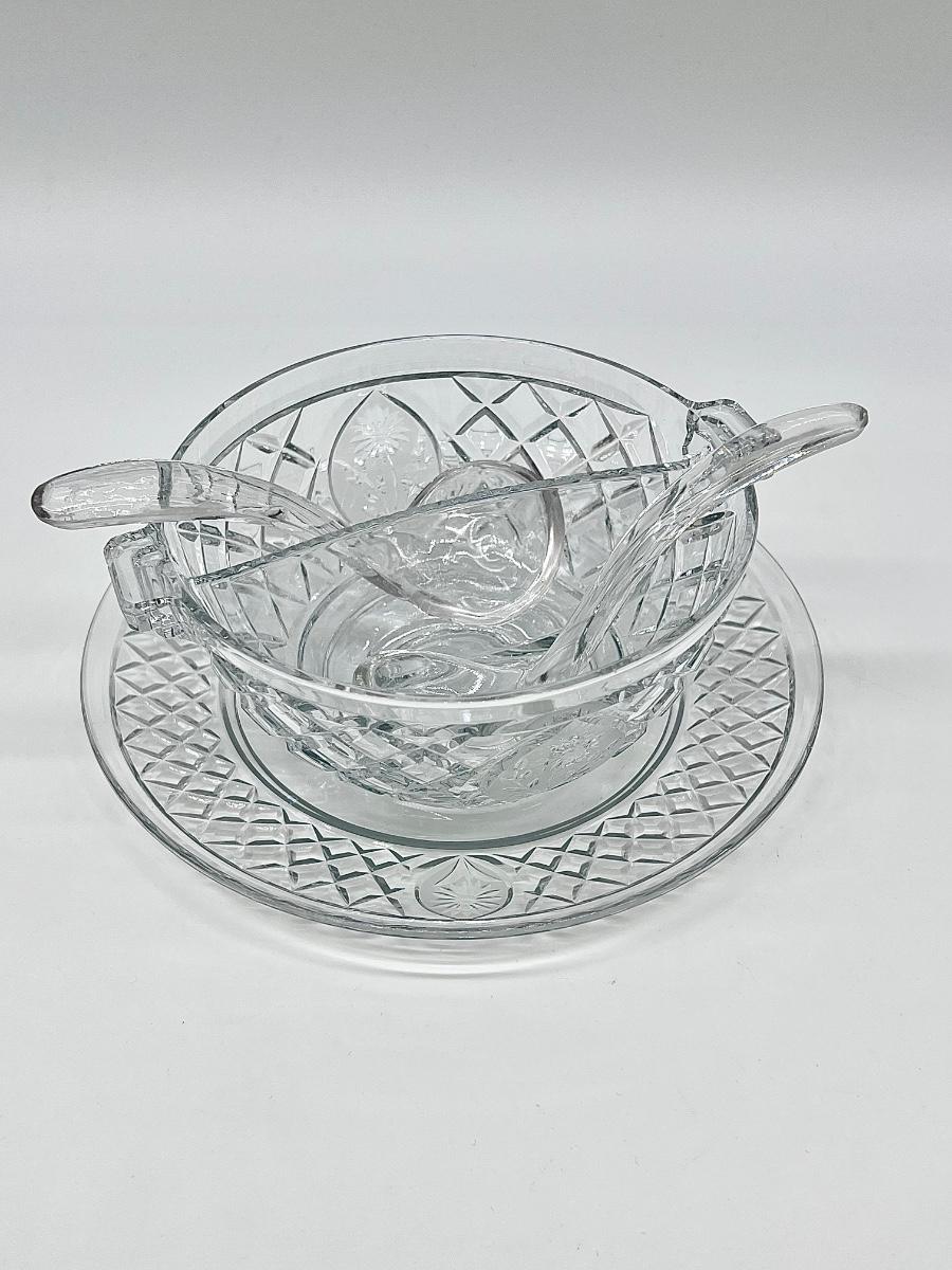Includes Divided Bowl, matching drip tray & 2 spoons ~ drip tray is 7.5" round ~ divided dish is 2.75" H x 5.5" Round