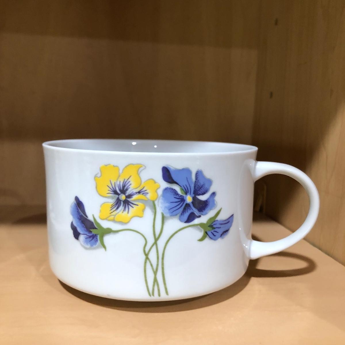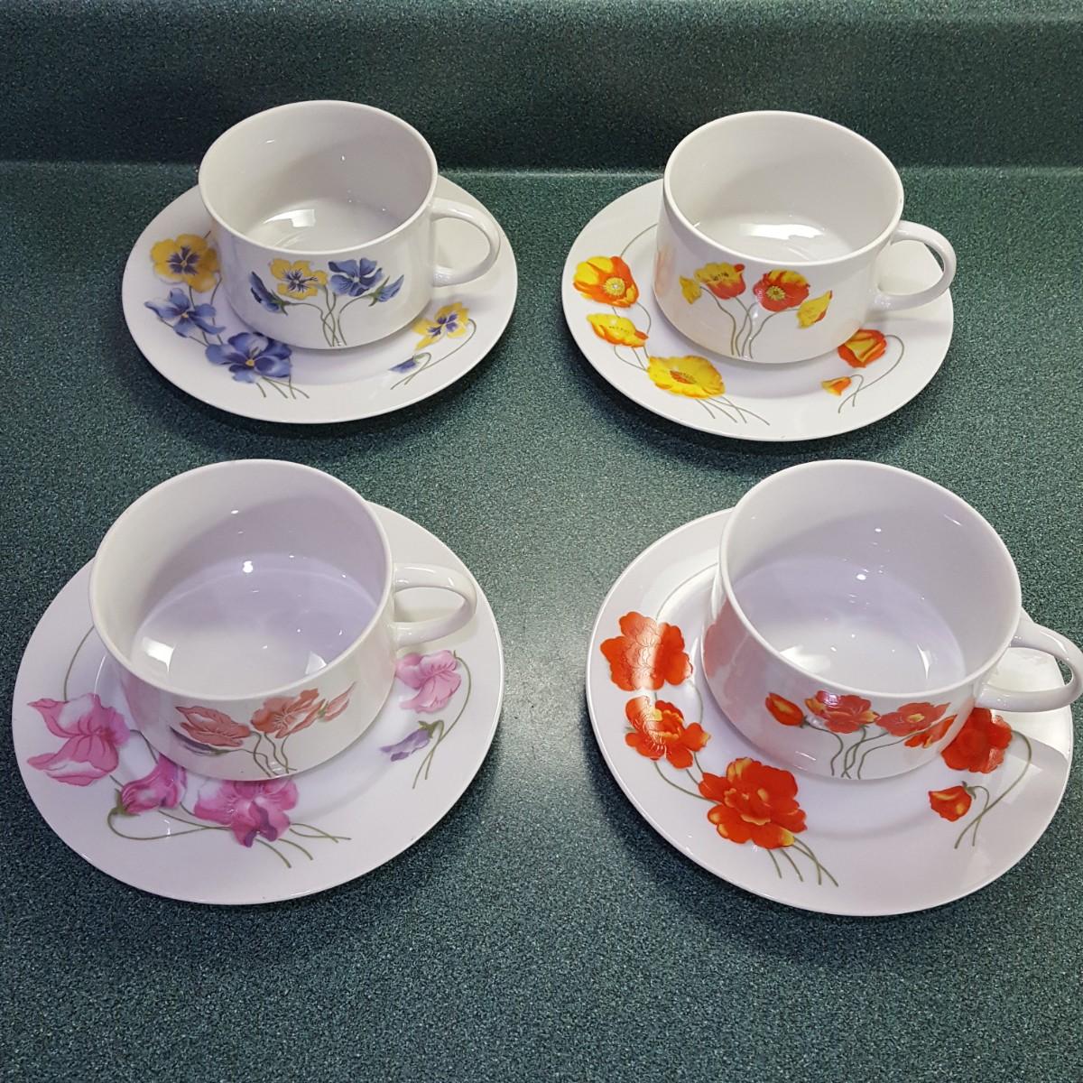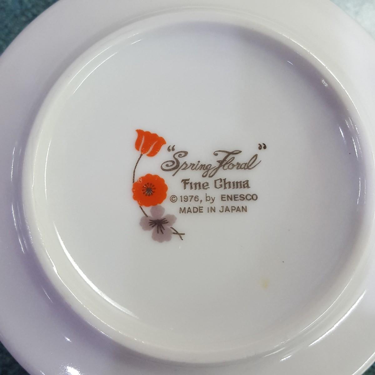 This "Spring Floral" design by Enesco features 4 different floral prints on each cup. The set includes a soup cup with a matching plate. The plates measure 8 inches and the cup measures 6 inches x 3 inches. The cup and plates all appear to be in good condition. Shipping Available.