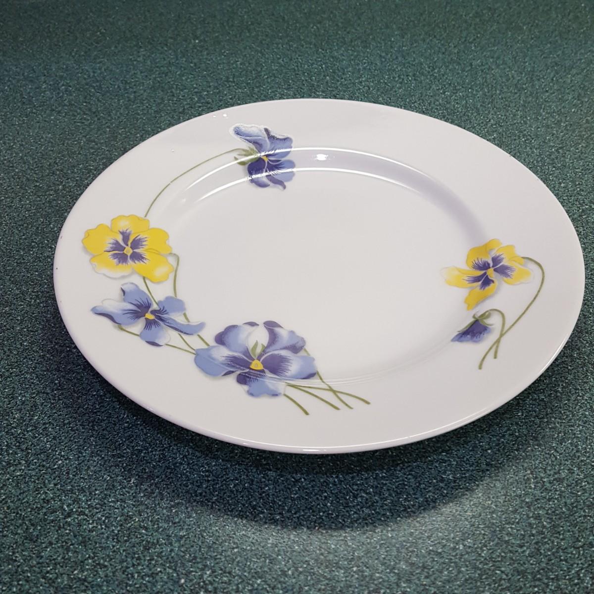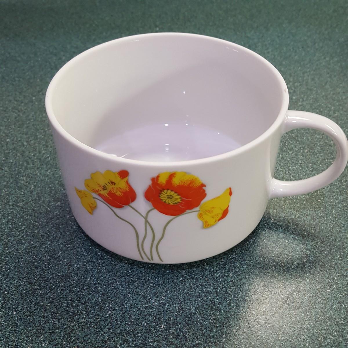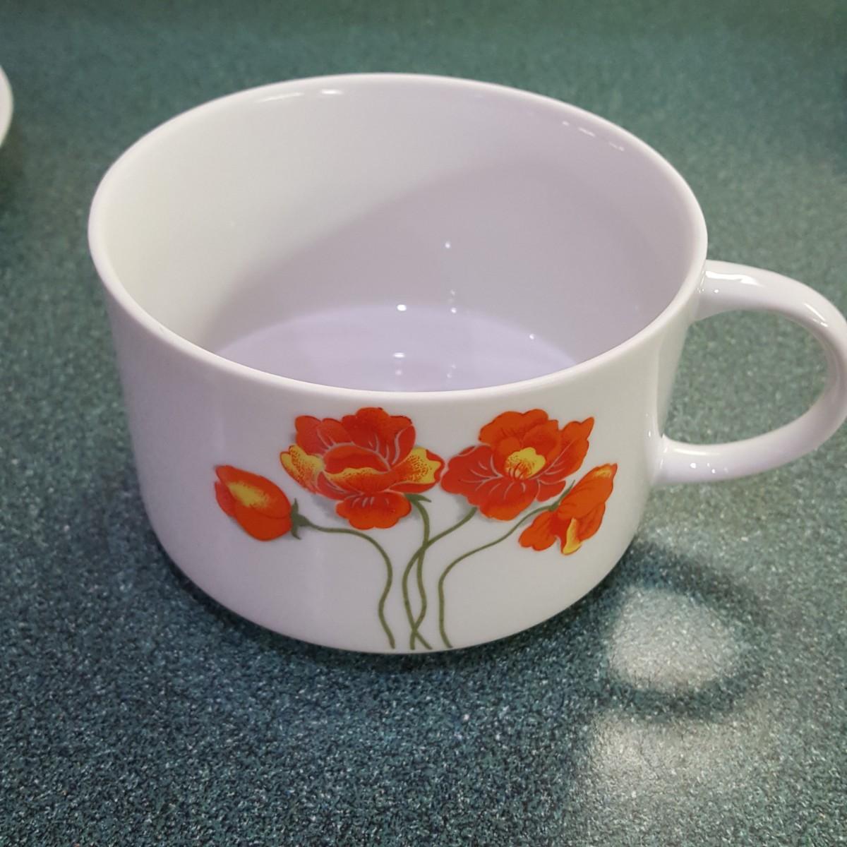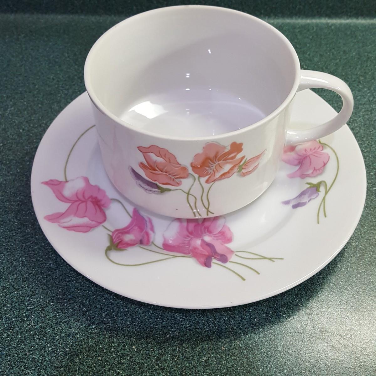 This "Spring Floral" design by Enesco features 4 different floral prints on each cup. The set includes a soup cup with a matching plate. The plates measure 8 inches and the cup measures 6 inches x 3 inches. The cup and plates all appear to be in good condition. Shipping Available.