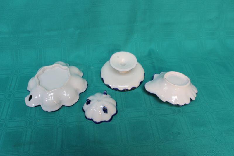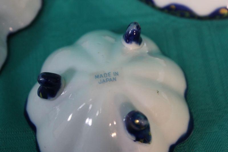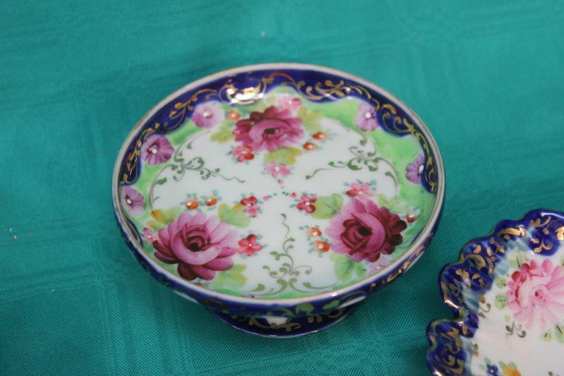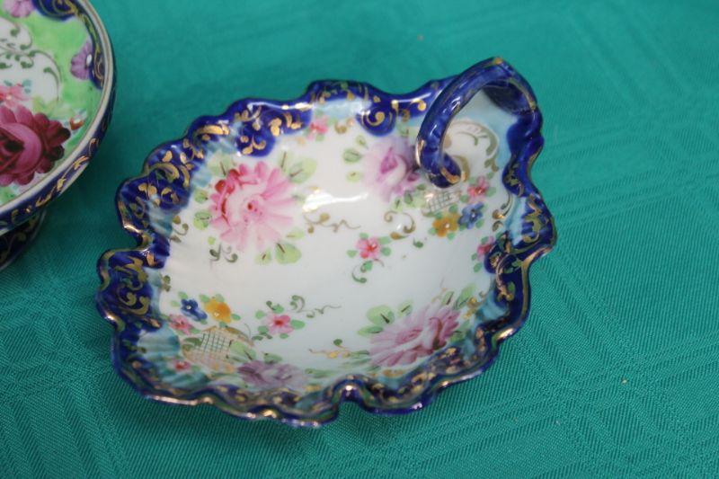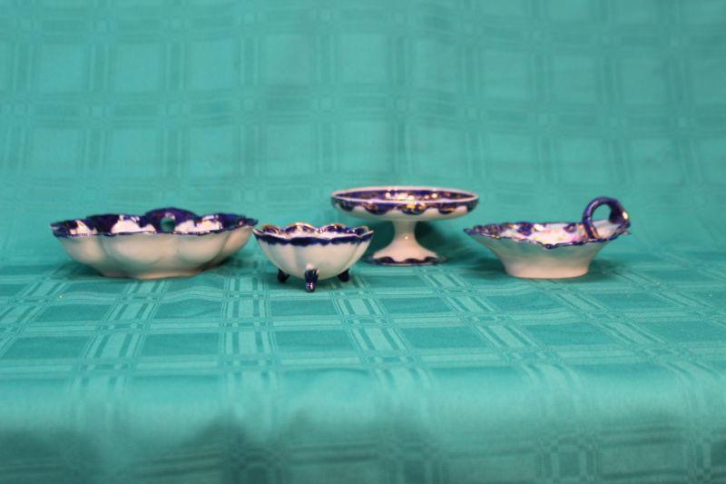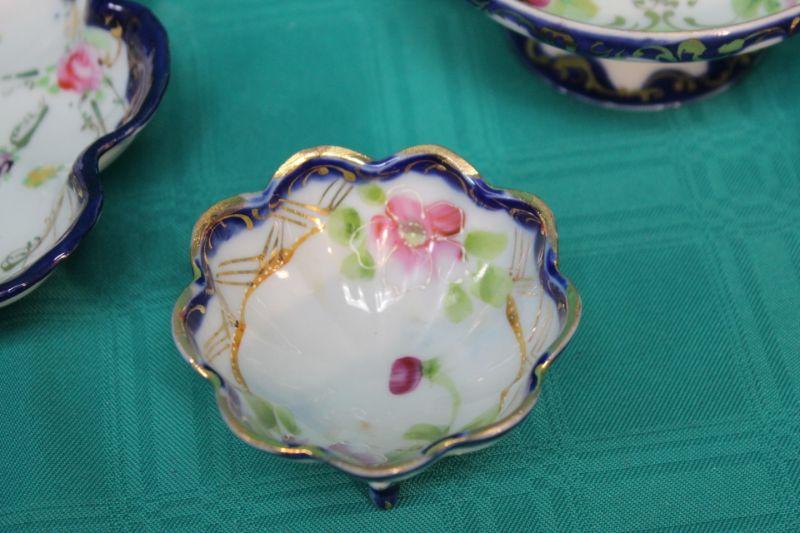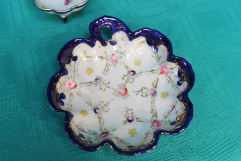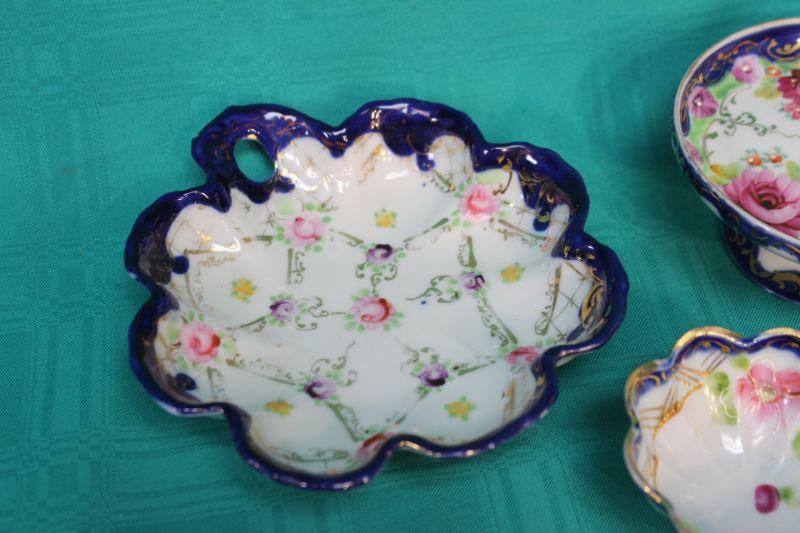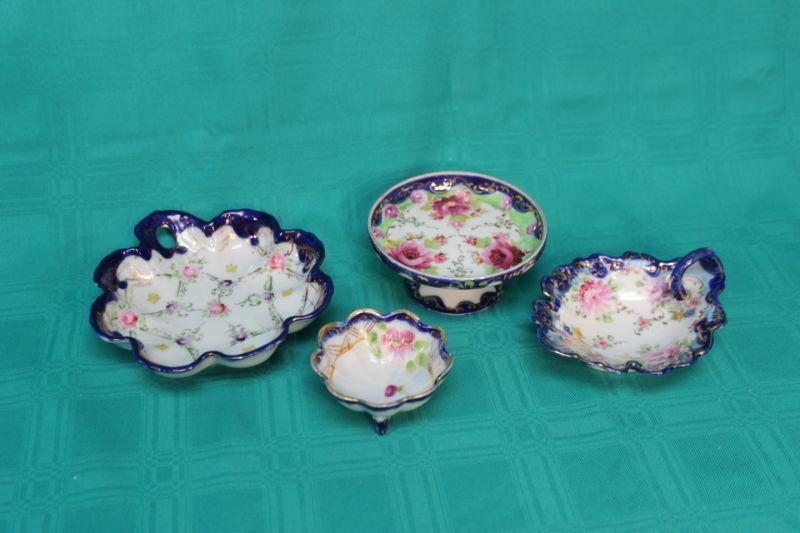 4 piece trinket dish lot. Fine porcelain china. Floral pattern with dark blue edges, gold accents. Similar in pattern, different in shape. No chips. One piece is marked "Made in Japan"