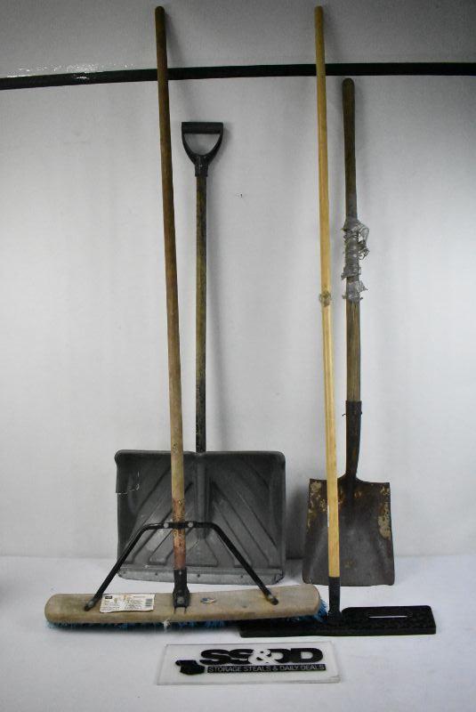 4 Piece Large Tool Lot: Snow Shovel, Shovel, Push Broom, and Heavy Duty Mop