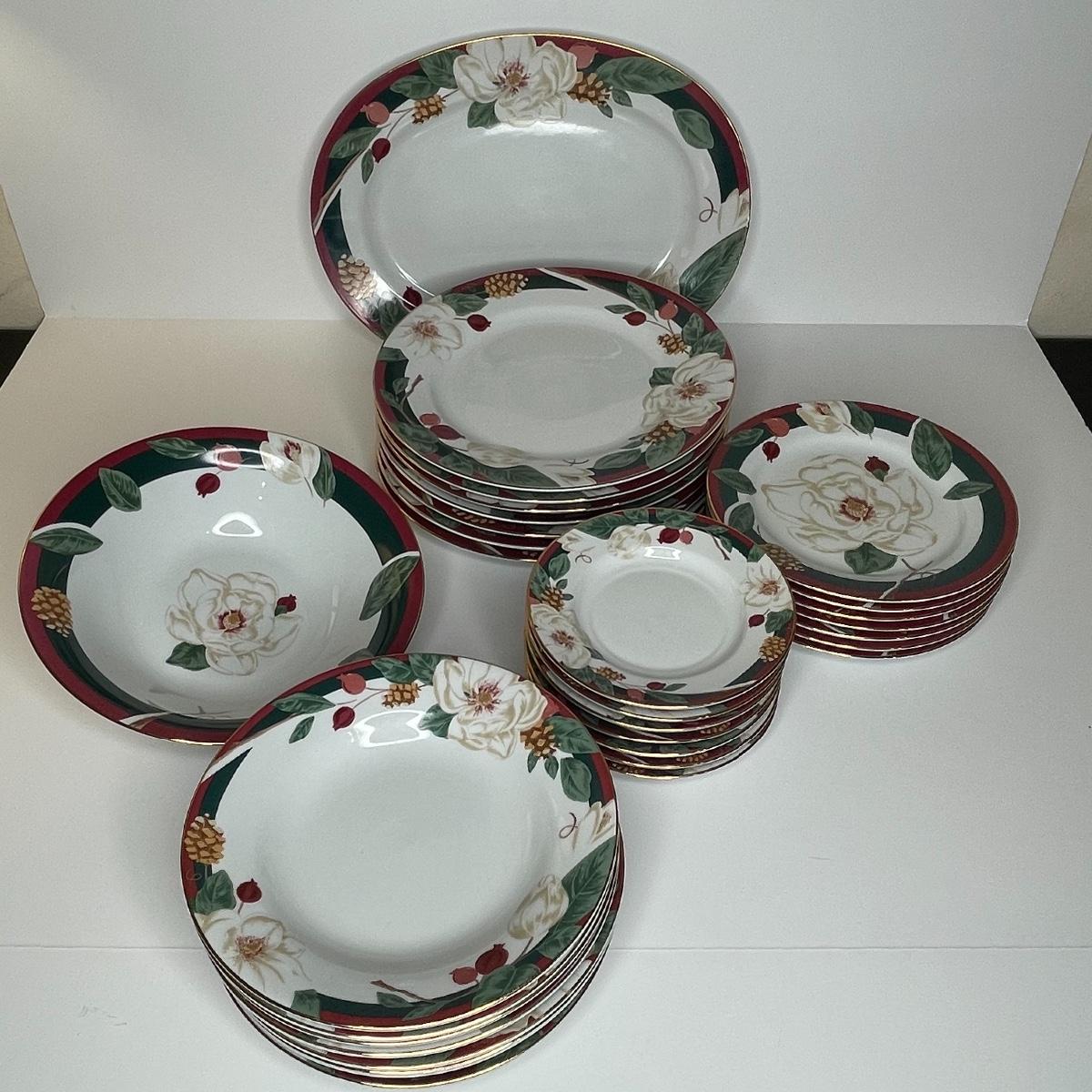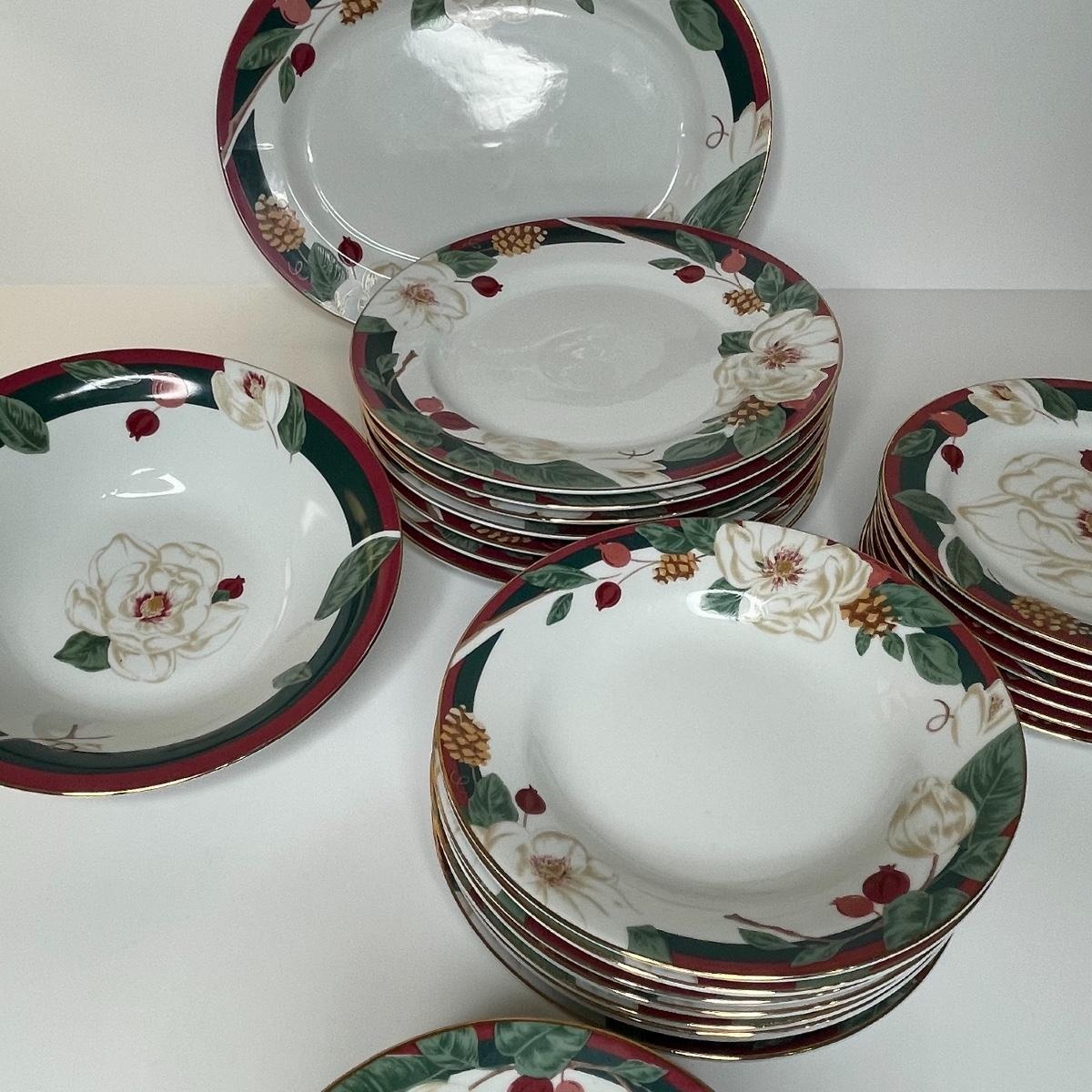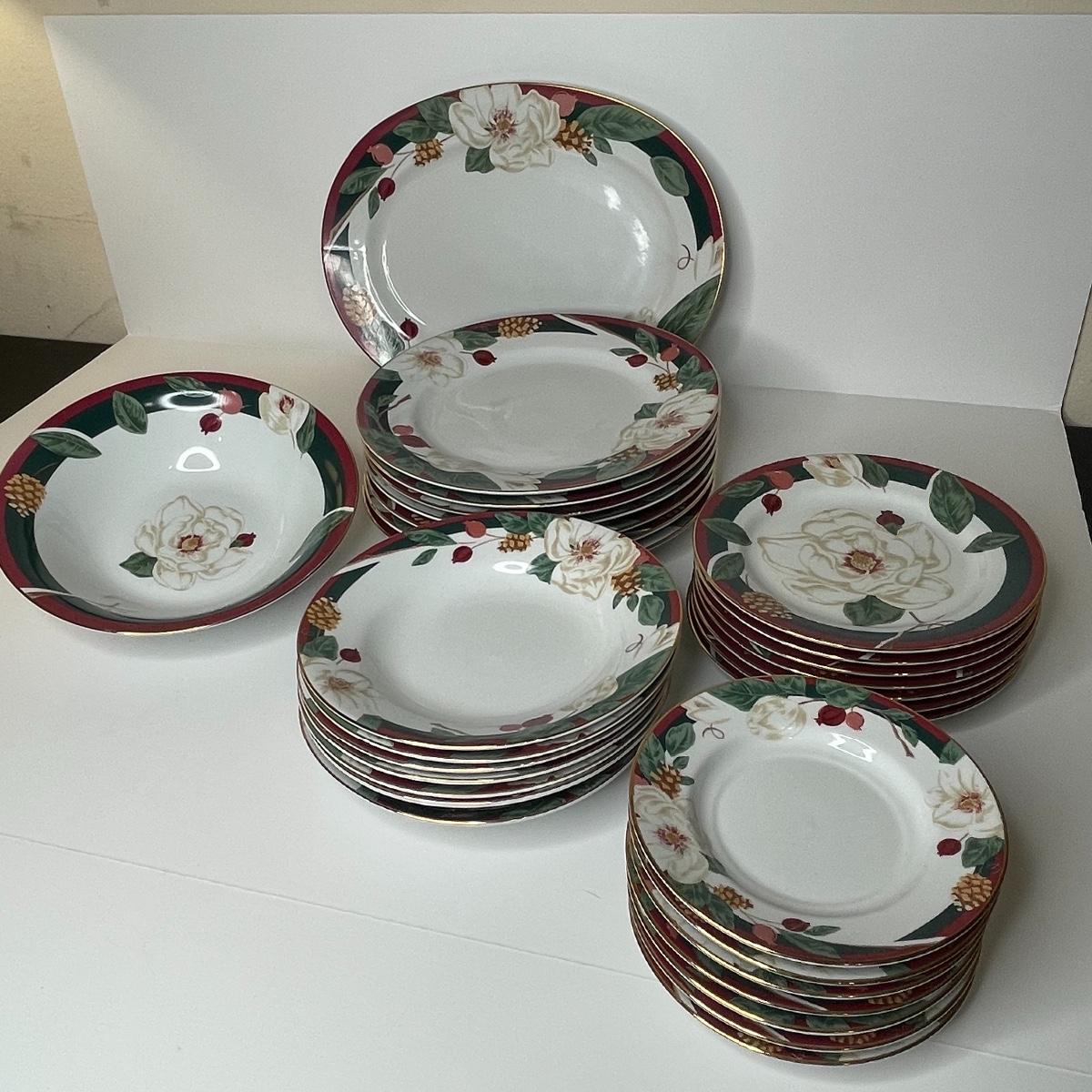 Includes serving platter and bowl. Each place setting includes: dinner plate, cereal/soup bowl, dessert plate, bread/berry plate
