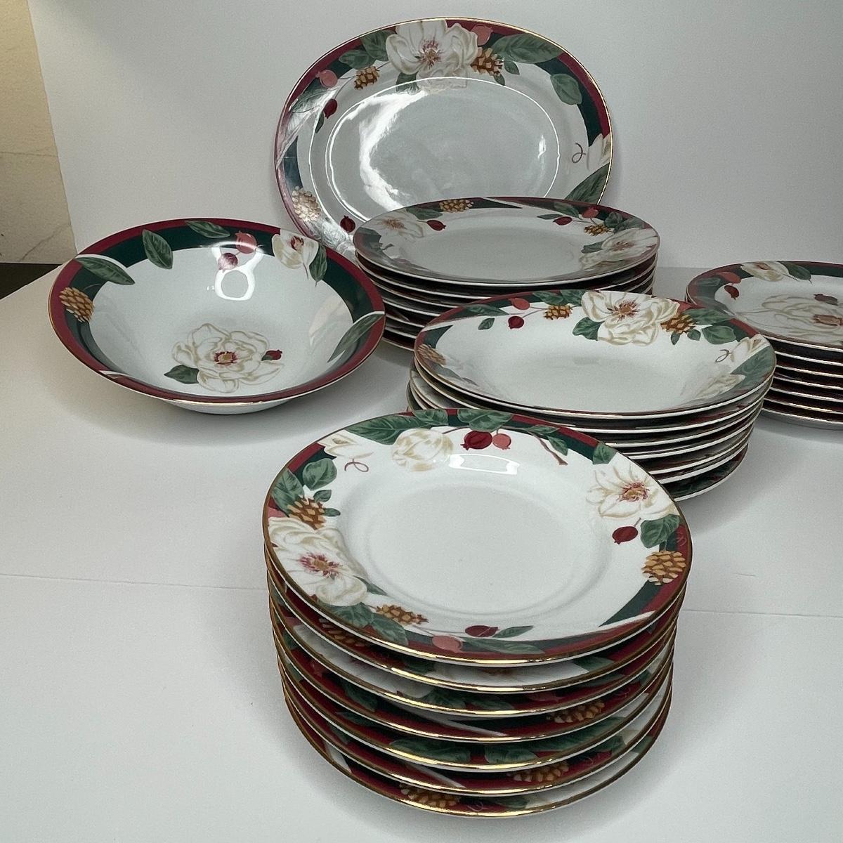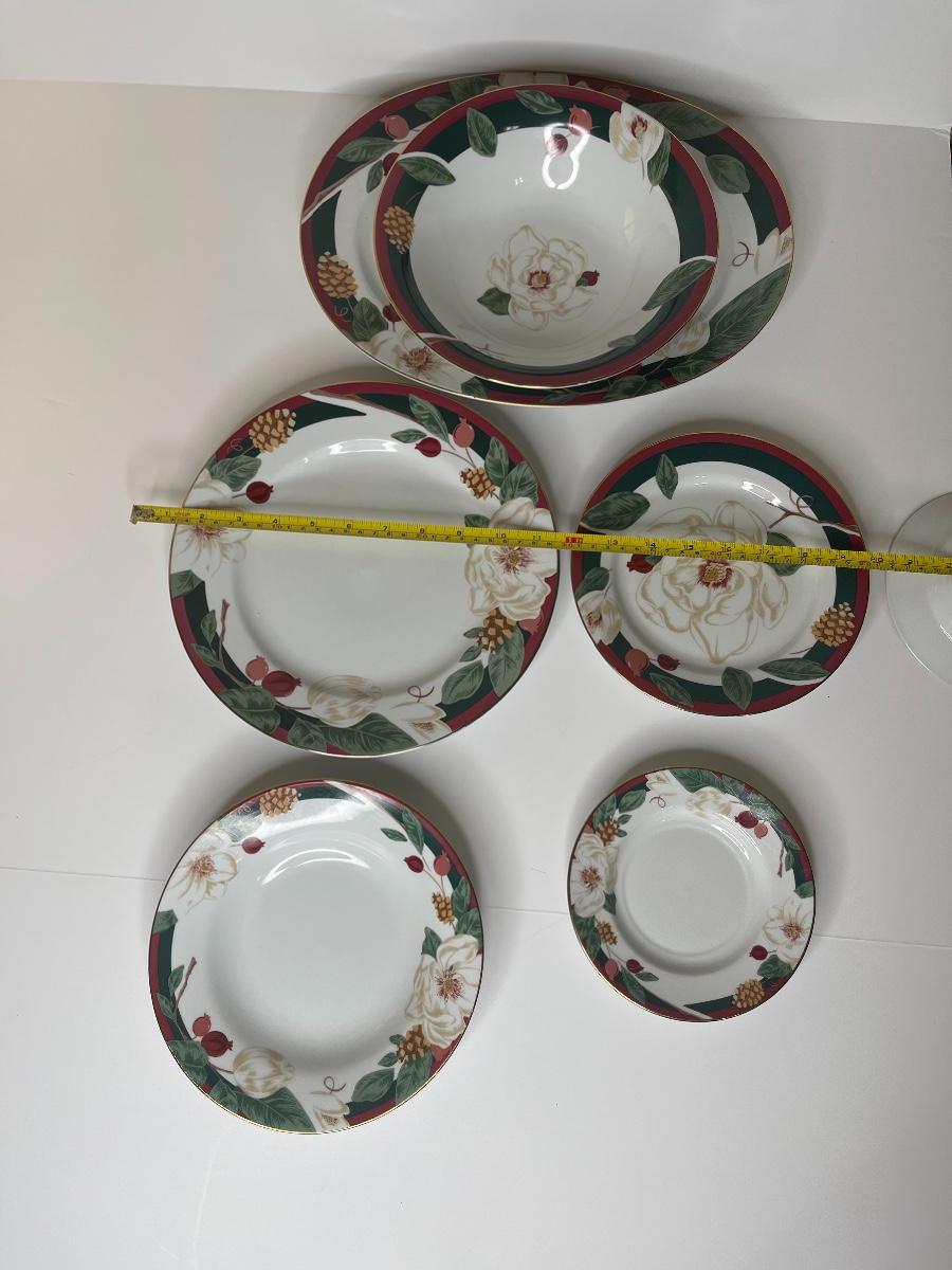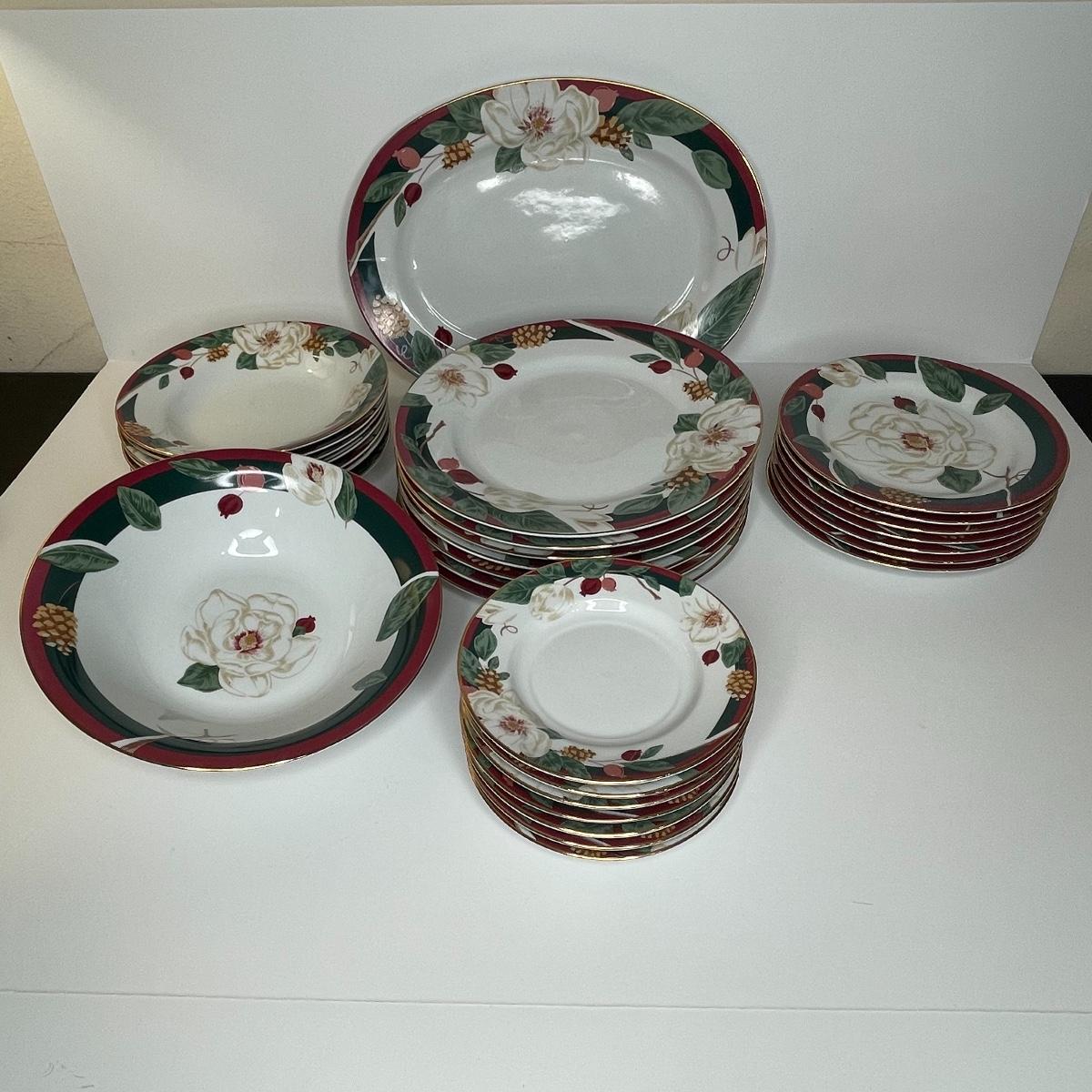 Includes serving platter and bowl. Each place setting includes: dinner plate, cereal/soup bowl, dessert plate, bread/berry plate