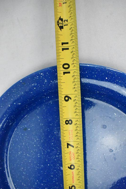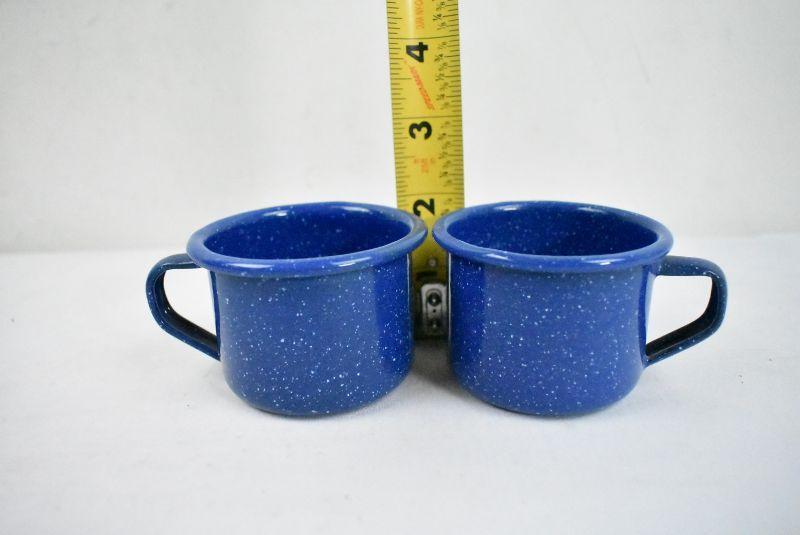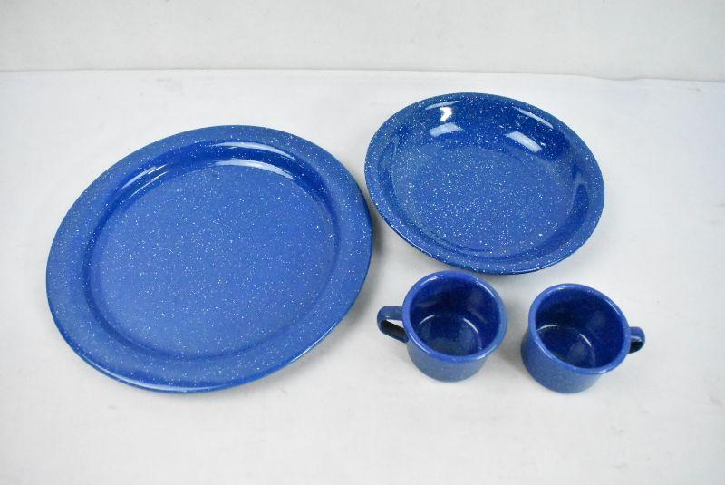 4 Piece Metal Enamel Camping Dishware Blue with White Specks: Plate, Bowl, and 2 Small Cups