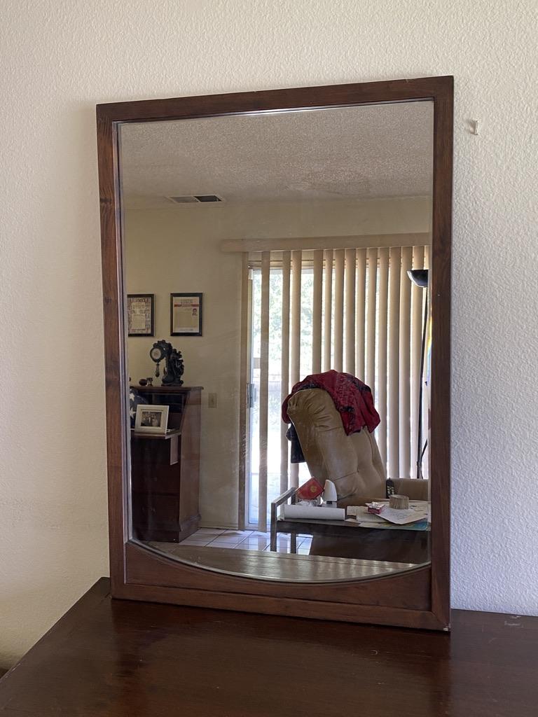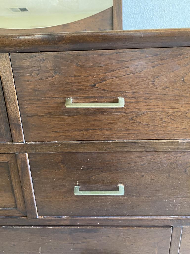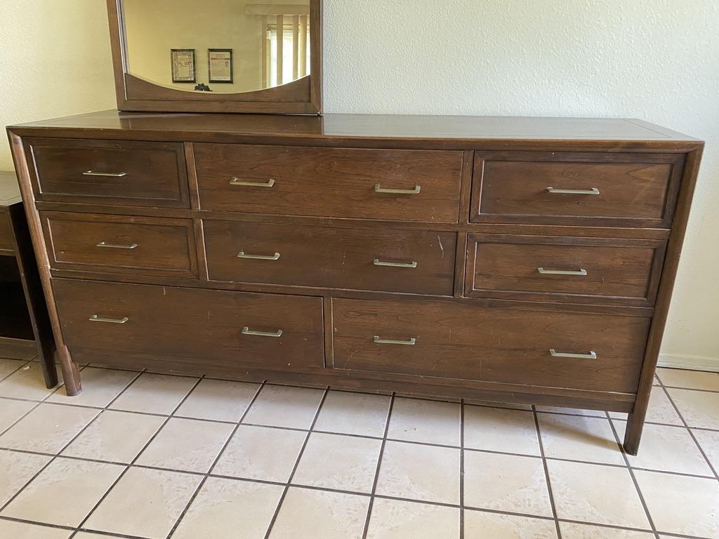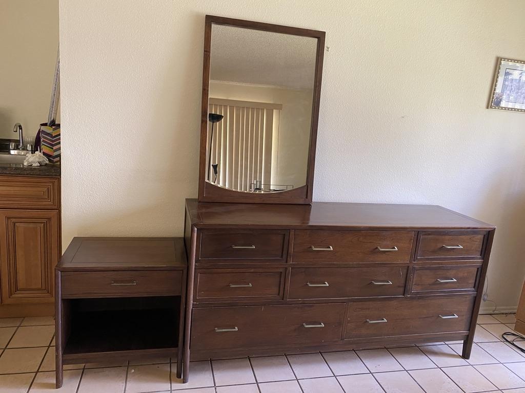Set includes mirror, one night stand, an upright dresser, and a horizontal dresser. Some nicks and scratches on them but in pretty good condition.