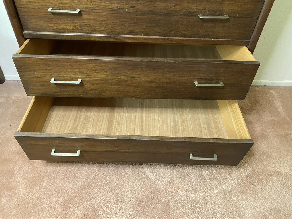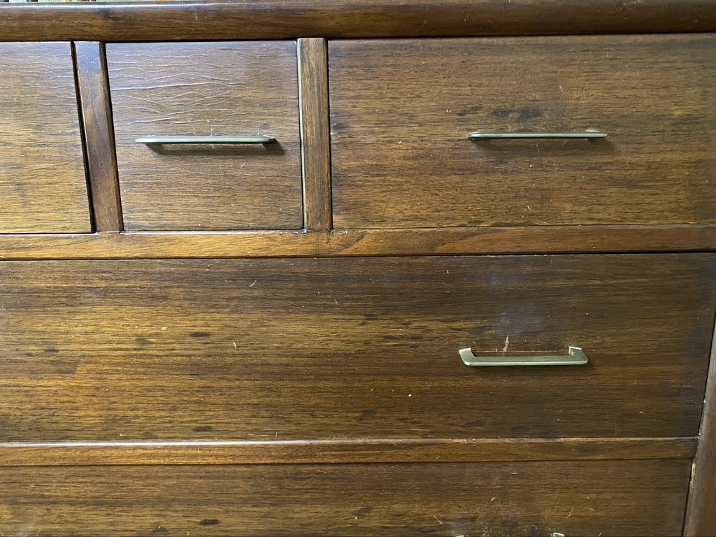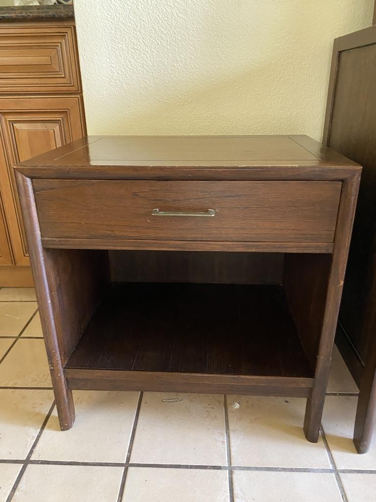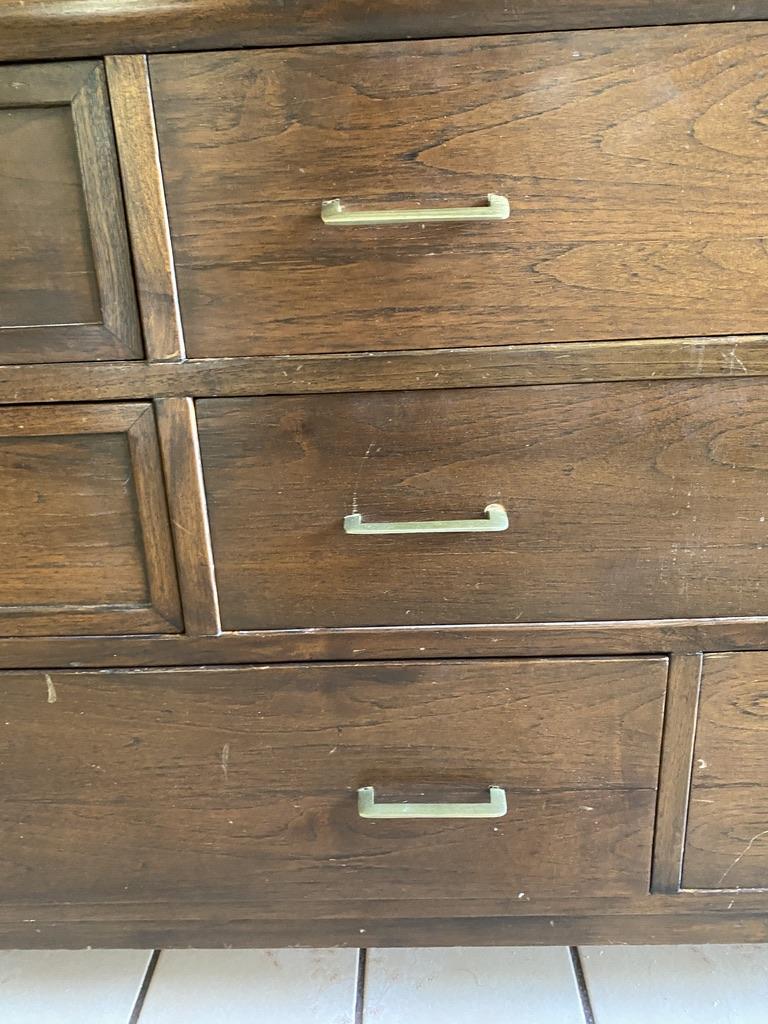 Set includes mirror, one night stand, an upright dresser, and a horizontal dresser. Some nicks and scratches on them but in pretty good condition.