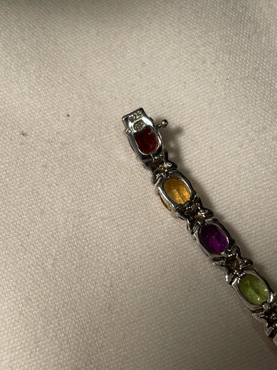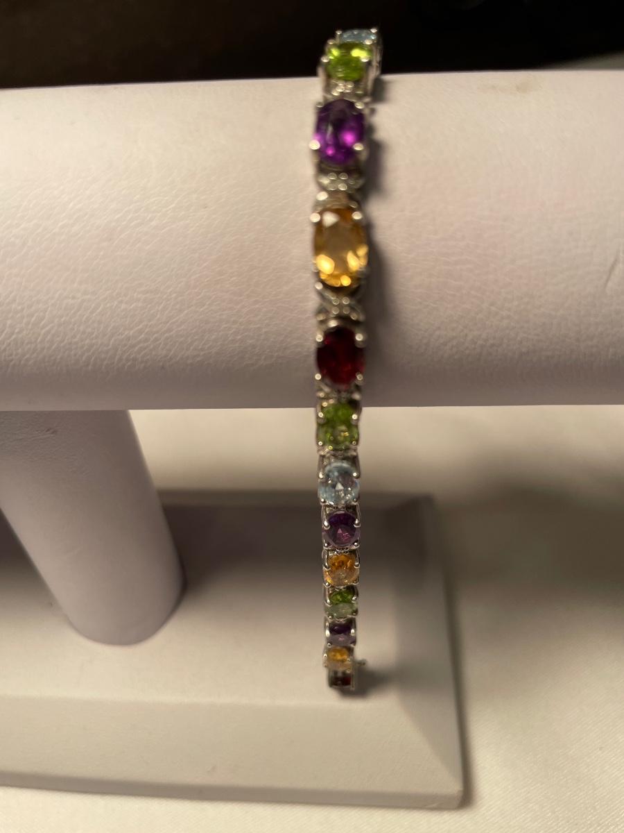 This beautiful set Includes multi colored stone bracelet, ring, pierced earrings and necklace.