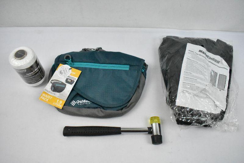 4 Piece Outdoors Lot: Magic Mesh, Waist Pack, Small Hammer, and String - New
