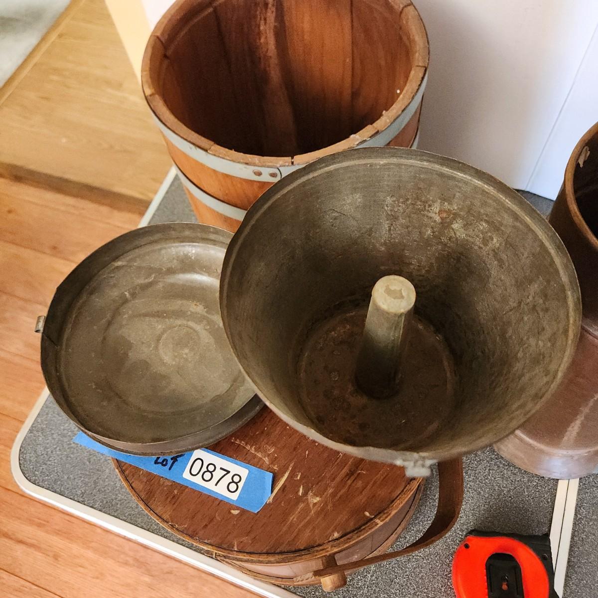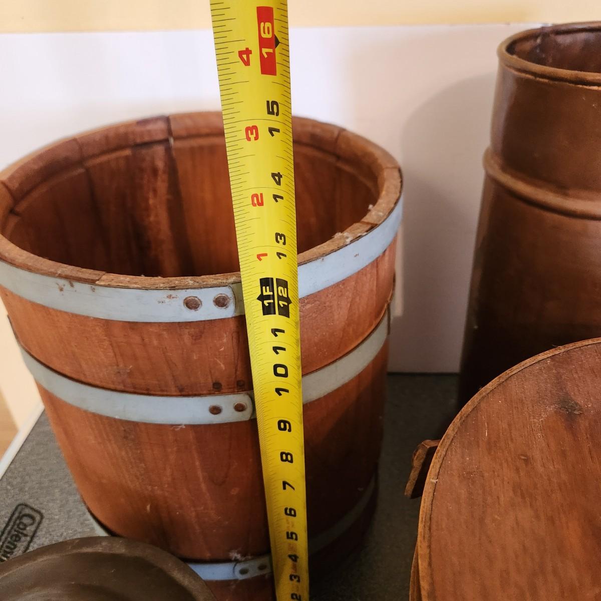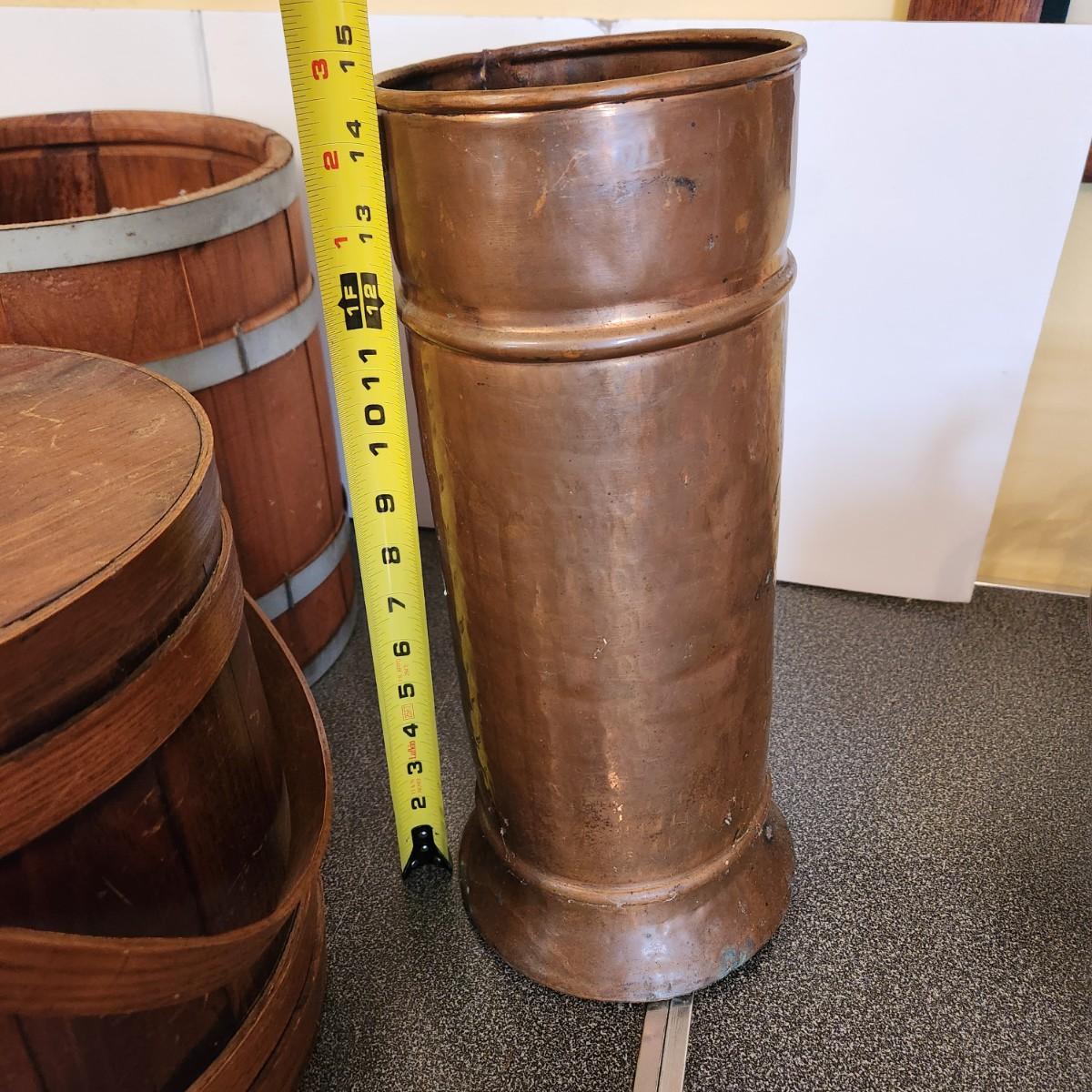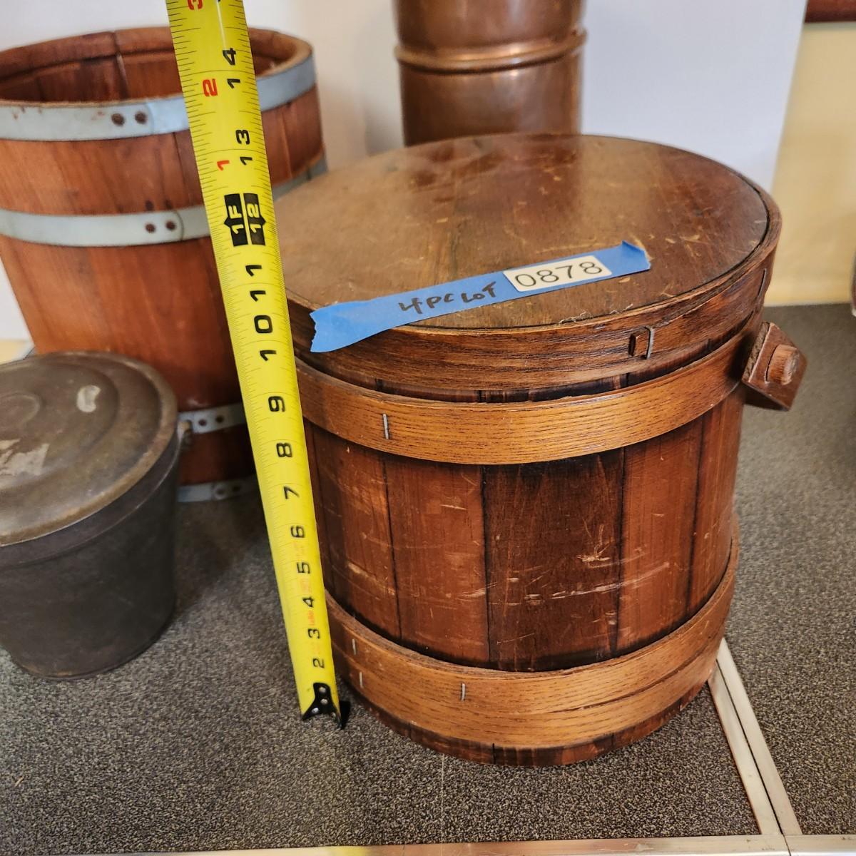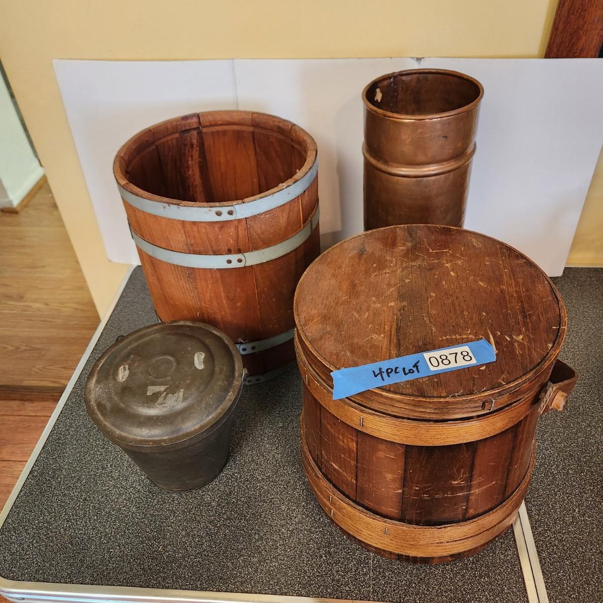 4 Piece Primitive Lot Barrel , Brass Umbrella Cane Holder, Wood Bucket