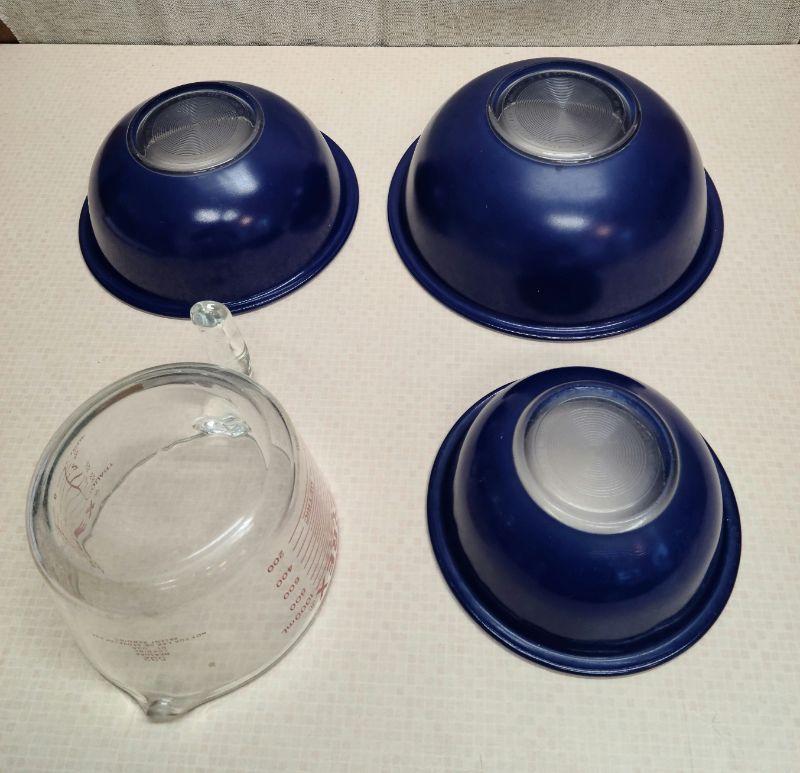 4 piece Pyrex set 3 blue nesting bowls and measuring cup