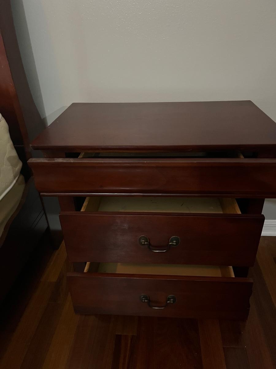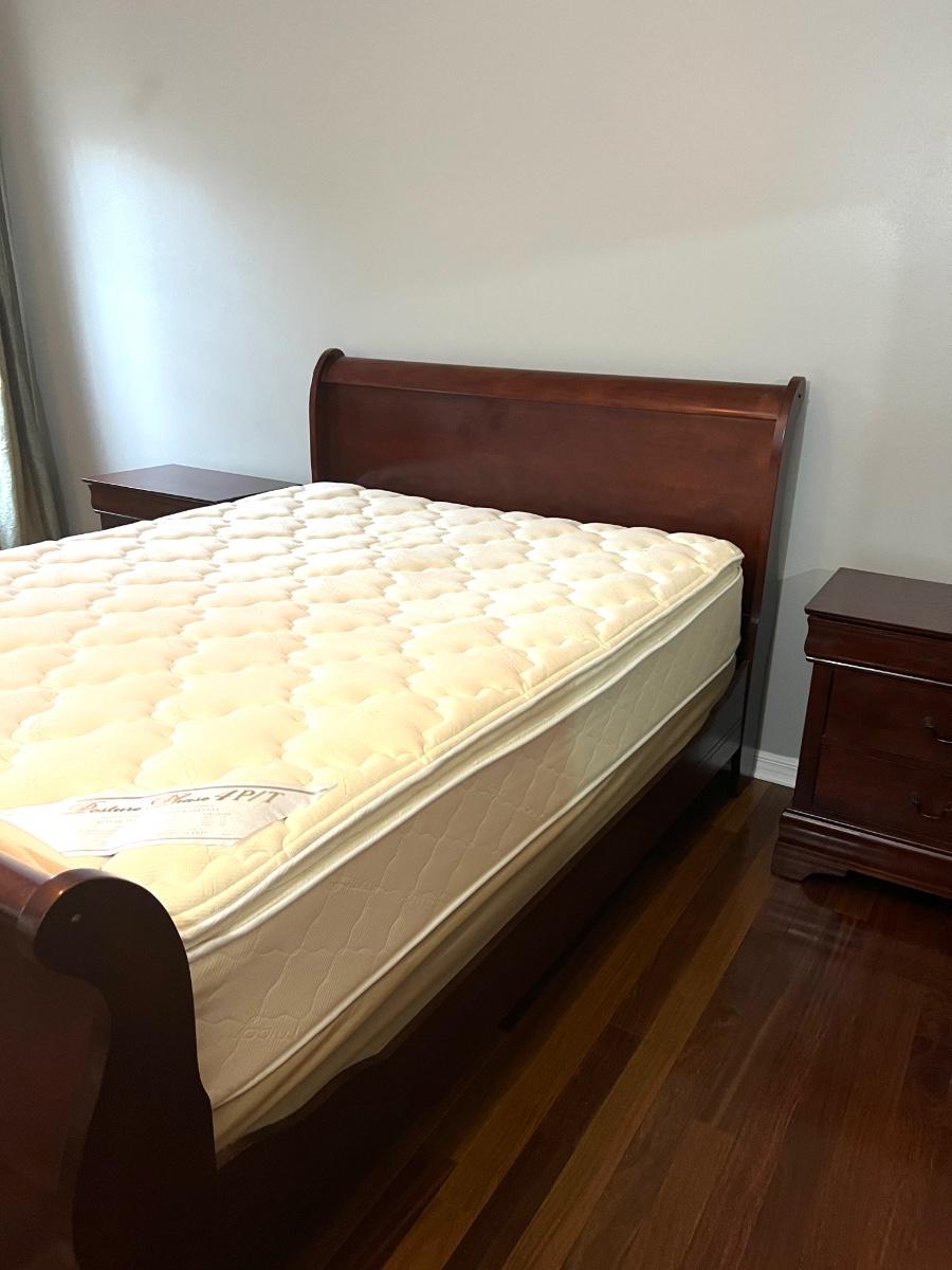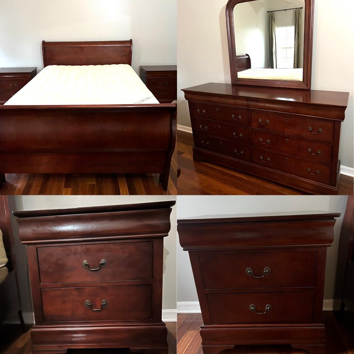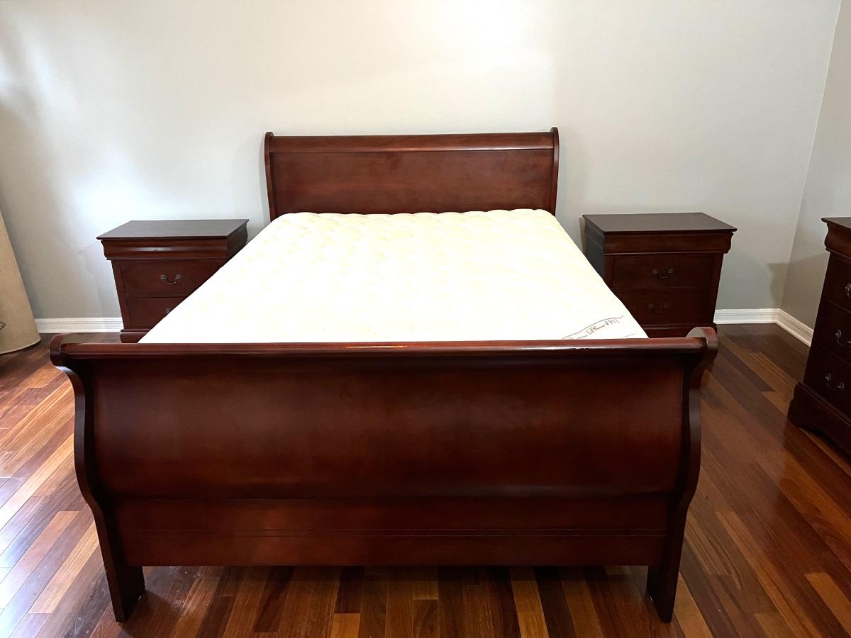 4 Piece QUEEN BEDROOM SUITE Includes Queen Size Cherrywood sleigh bed, 2 Nightstands with 2 drawers and an additional hidden drawer. Dresser and mirror has 6 Drawers with 2 additional hidden drawers. **This item comes from a smoking home. Mattress & Boxspring can be taken with the winning bid or left behind. Mattress has been disinfection with OdoBan. Also, note last picture as dresser has ring mark.
