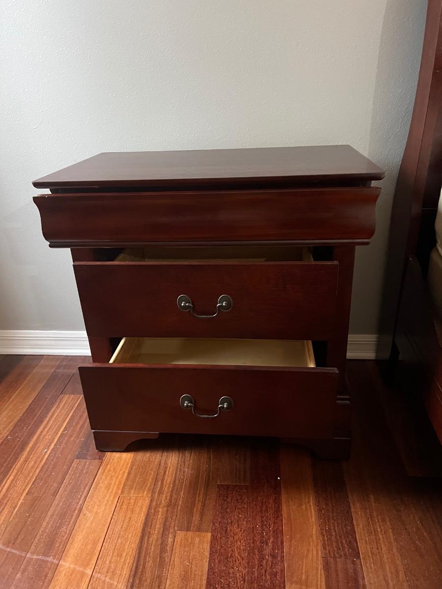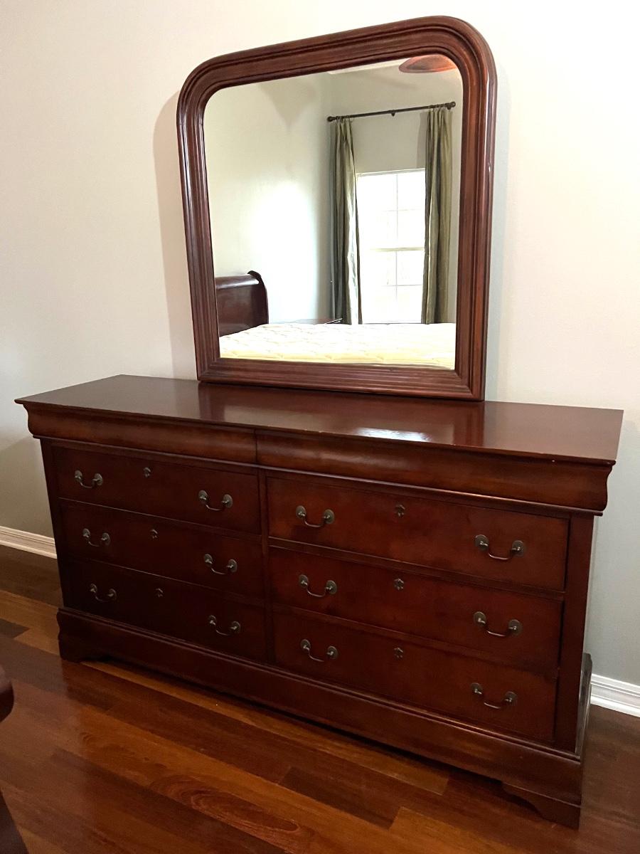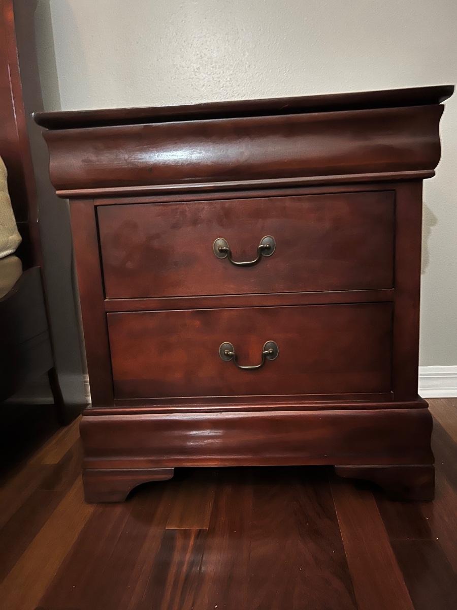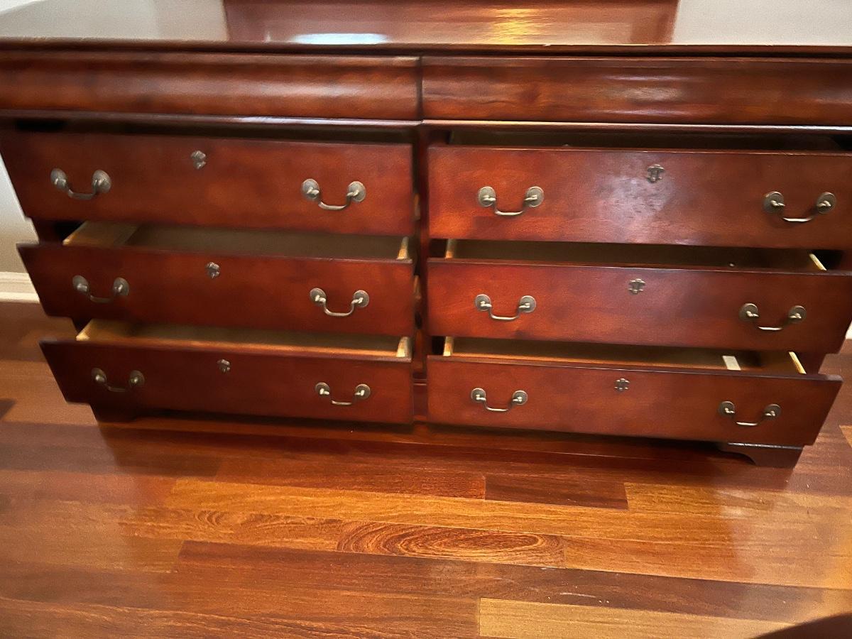 4 Piece QUEEN BEDROOM SUITE Includes Queen Size Cherrywood sleigh bed, 2 Nightstands with 2 drawers and an additional hidden drawer. Dresser and mirror has 6 Drawers with 2 additional hidden drawers. **This item comes from a smoking home. Mattress & Boxspring can be taken with the winning bid or left behind. Mattress has been disinfection with OdoBan. Also, note last picture as dresser has ring mark.