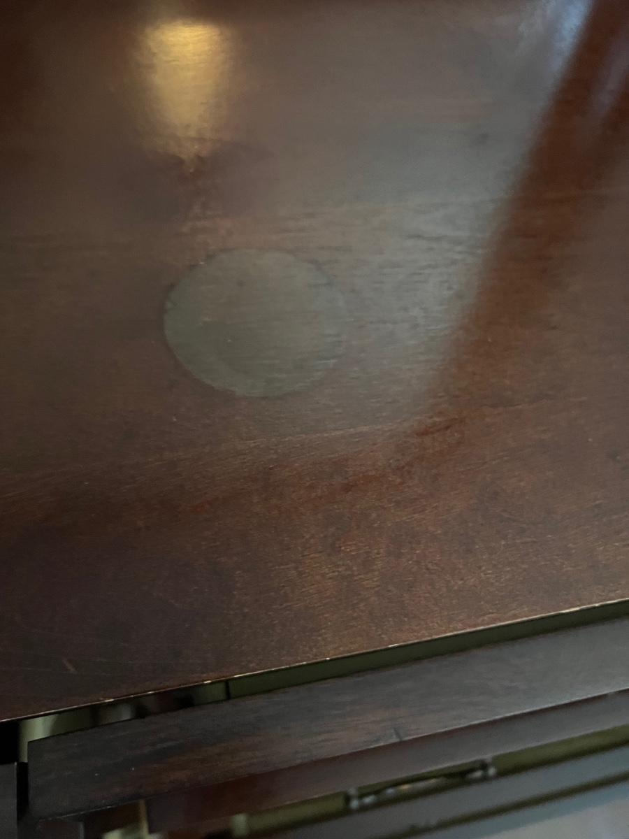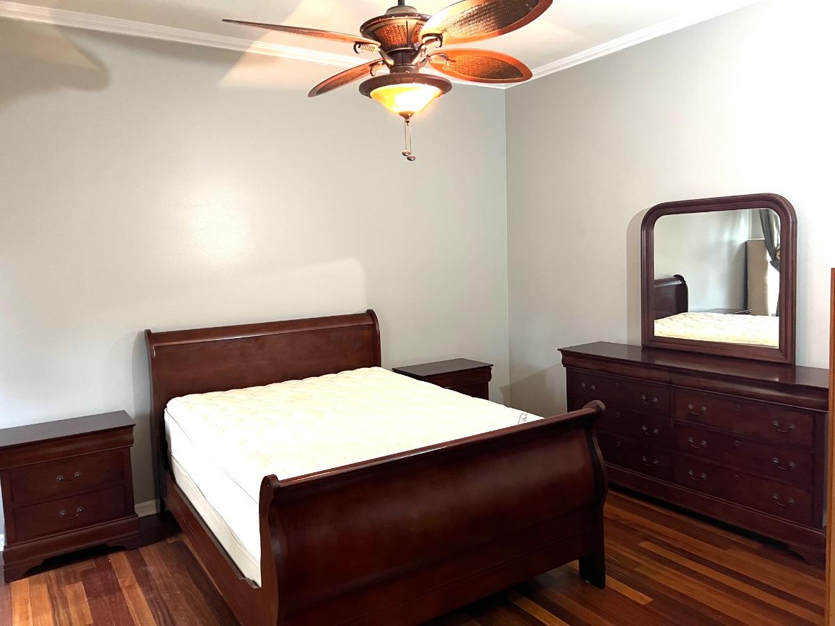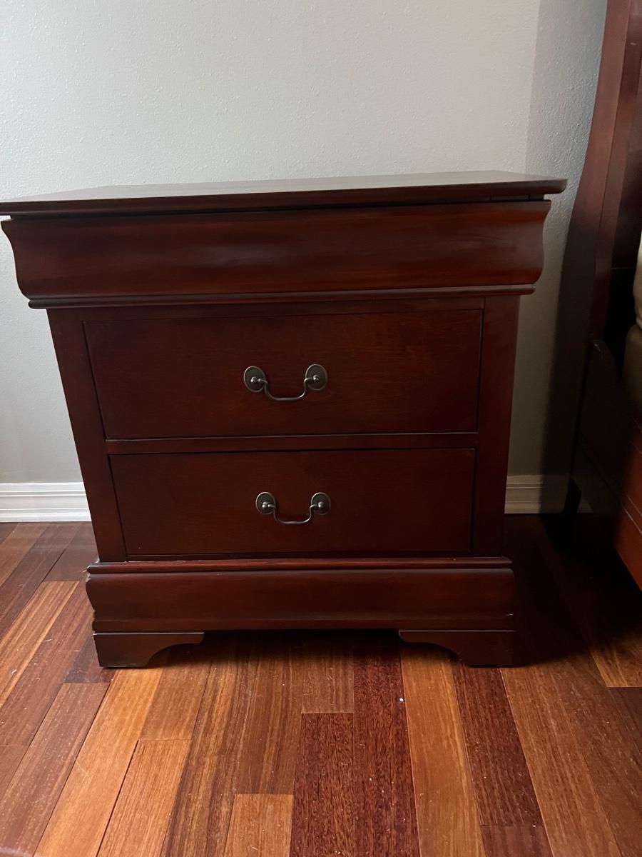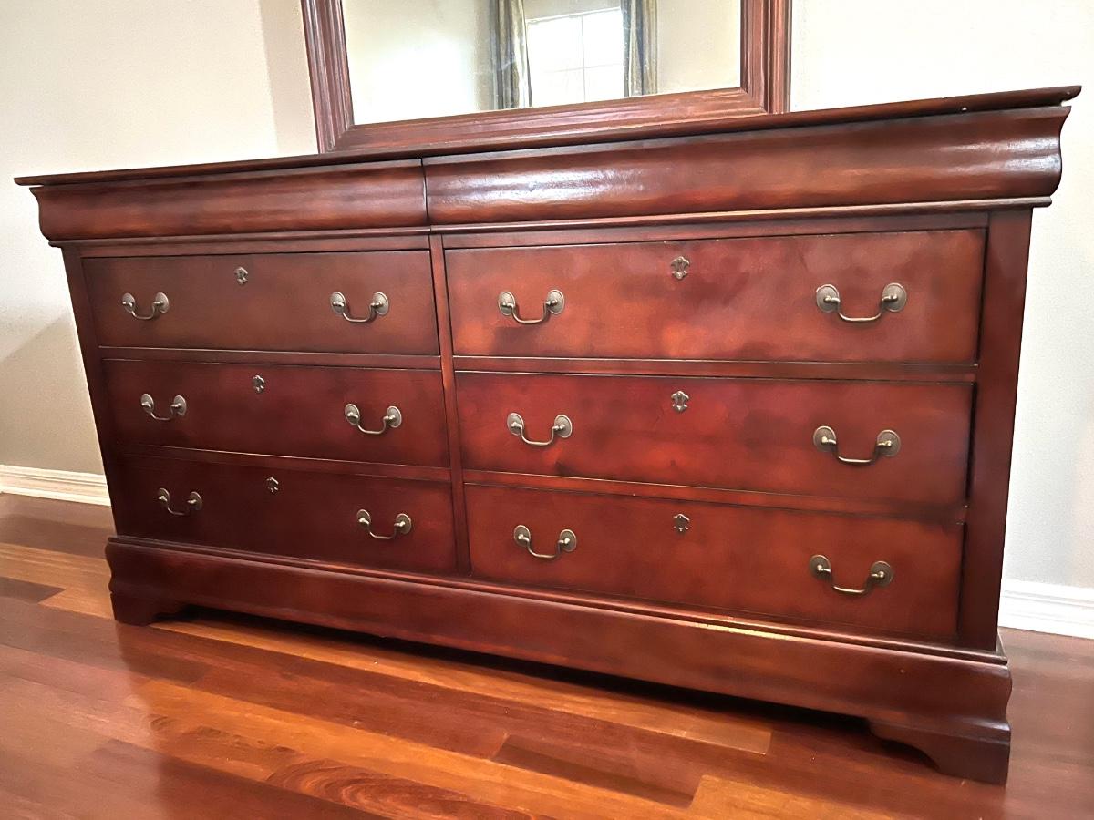 4 Piece QUEEN BEDROOM SUITE Includes Queen Size Cherrywood sleigh bed, 2 Nightstands with 2 drawers and an additional hidden drawer. Dresser and mirror has 6 Drawers with 2 additional hidden drawers. **This item comes from a smoking home. Mattress & Boxspring can be taken with the winning bid or left behind. Mattress has been disinfection with OdoBan. Also, note last picture as dresser has ring mark.