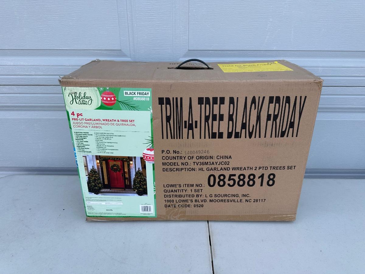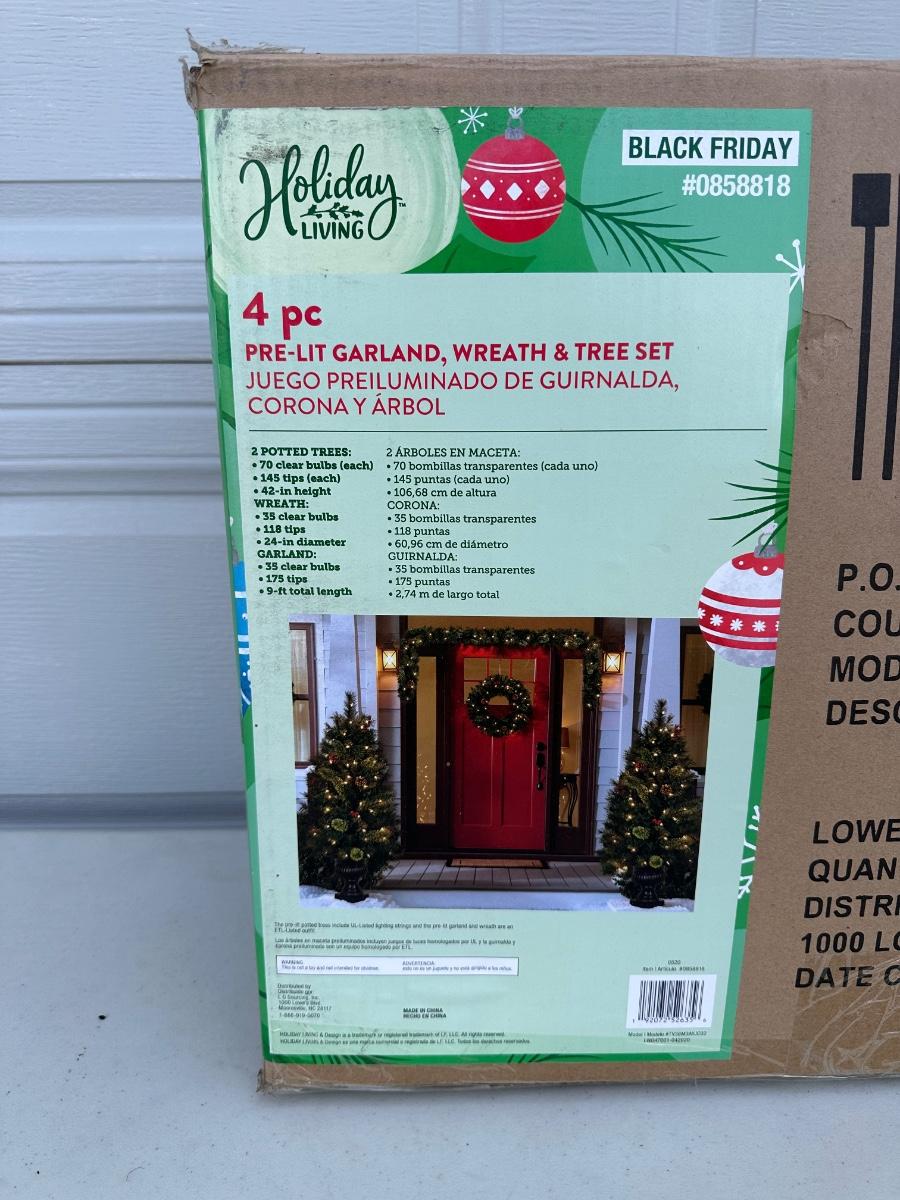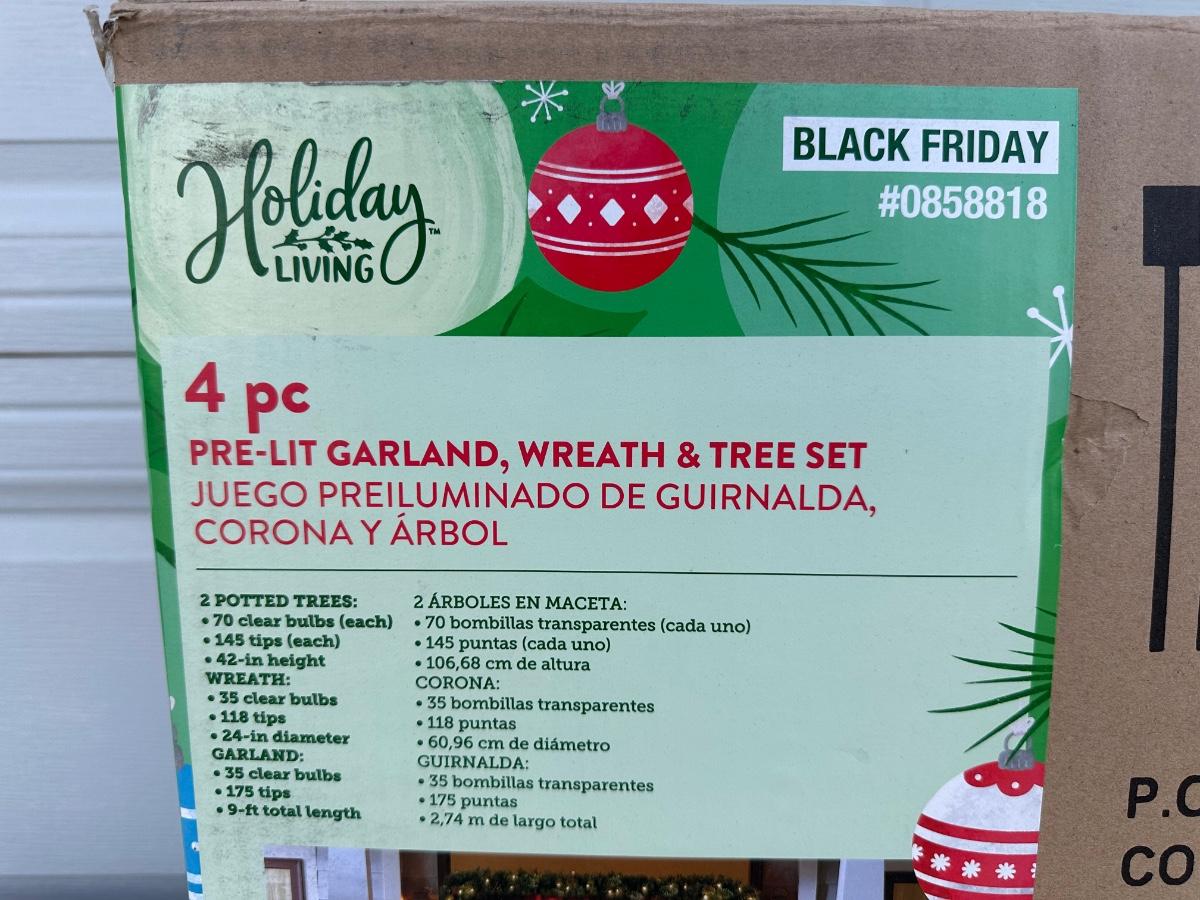4 PIECE SET - PRE-LIT GARLAND, WREATH AND 2 TREES