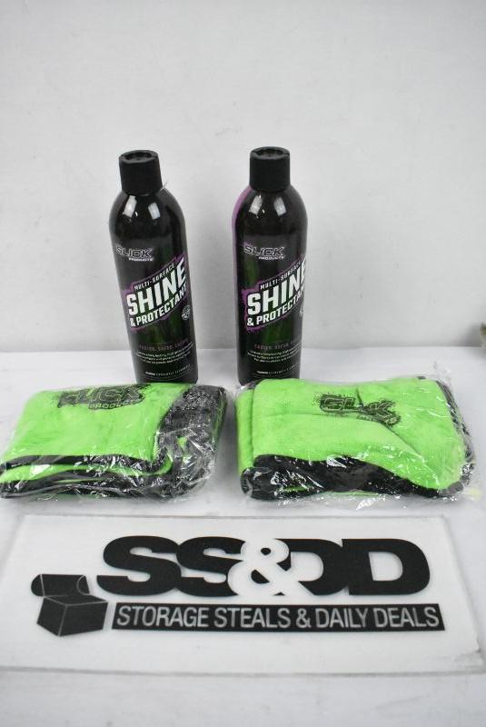 4 Piece Slick Products Car Detailing: 2 Bottles Shine Protectant & 2 Cloths - New