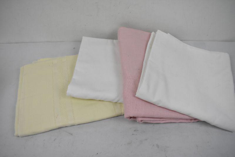 4 Piece Tablecloths: 2 White, 1 Cream, and 1 Pink