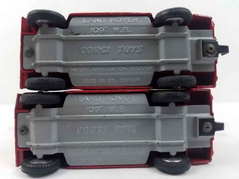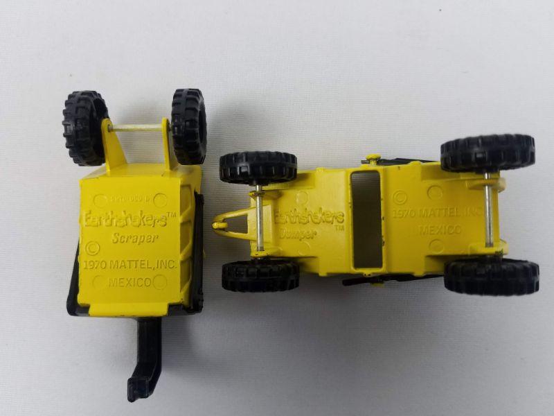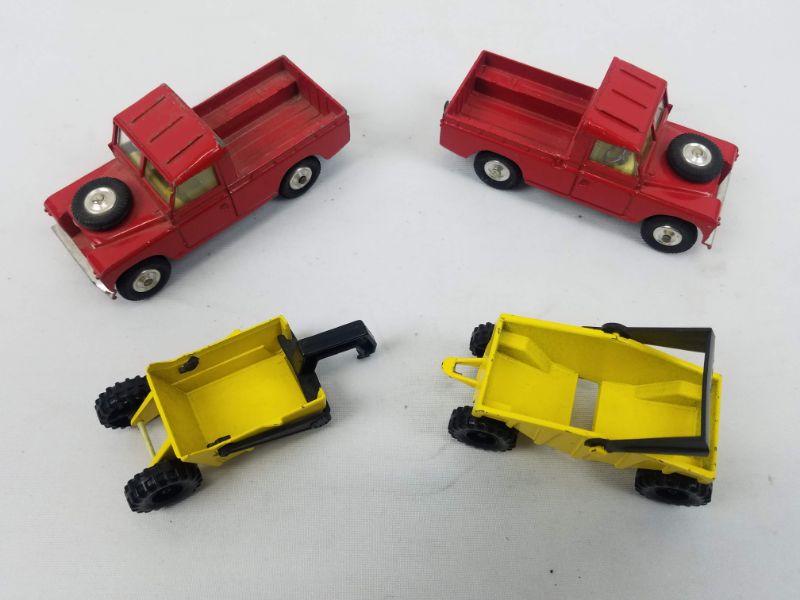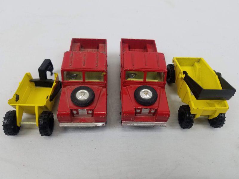 4 piece Vintage DIe Cast: 2 Red Land Rovers by Corgi Toys & 2 Yellow Earthshakers 1970 Mattel: Dumper & Scraper