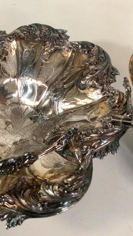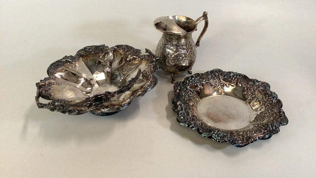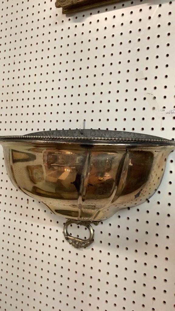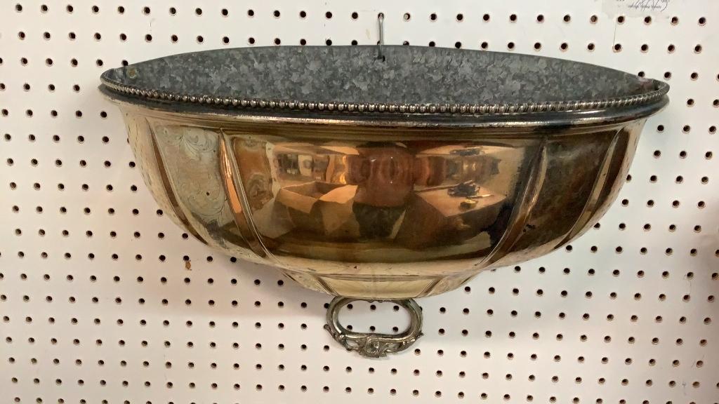 19 inch half meat dome converted wall planter Â…Repousse rimmed 12 inch open bowl by Oneida, ornate silver on copper footed pitcher, brides table basket with fruit and florals * handle needs repair