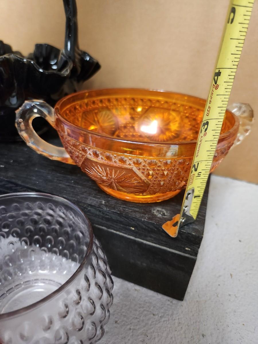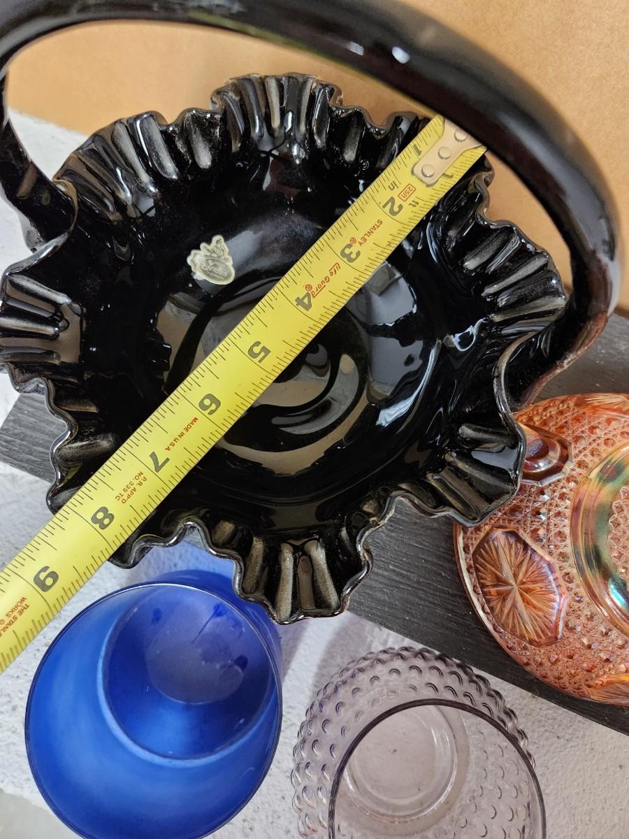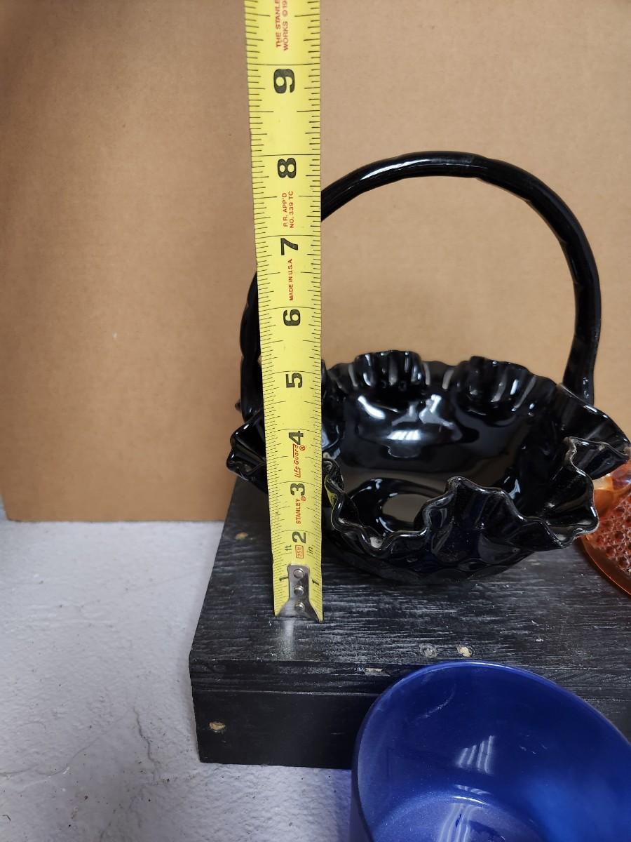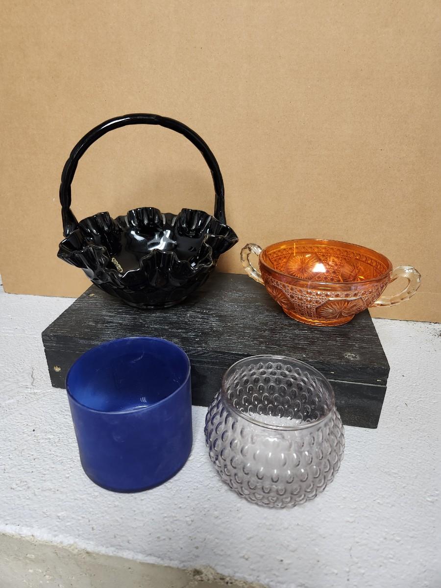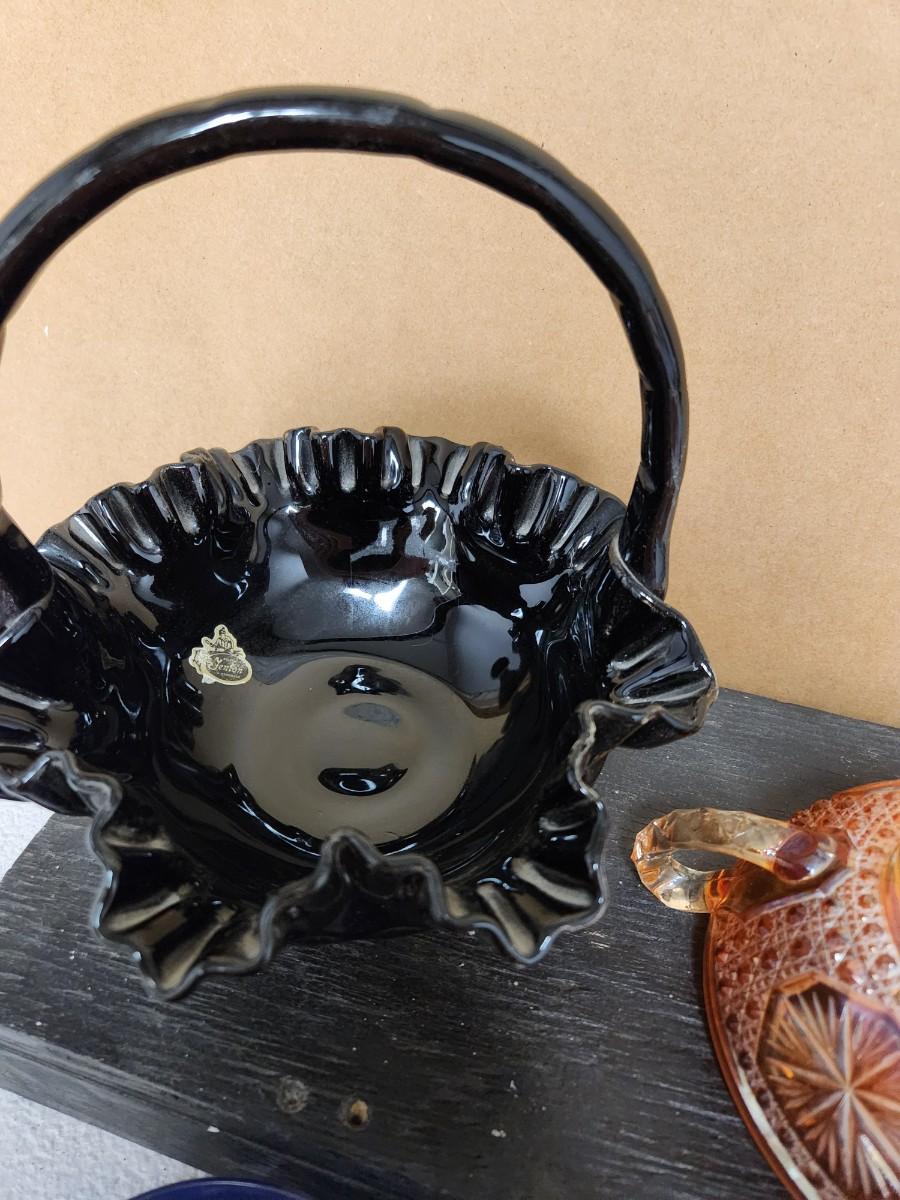 Beautiful black thumbprint Fenton basket with tag. marigold carnival handled bowl. Cobalt vase and clear knobby rose bowl.