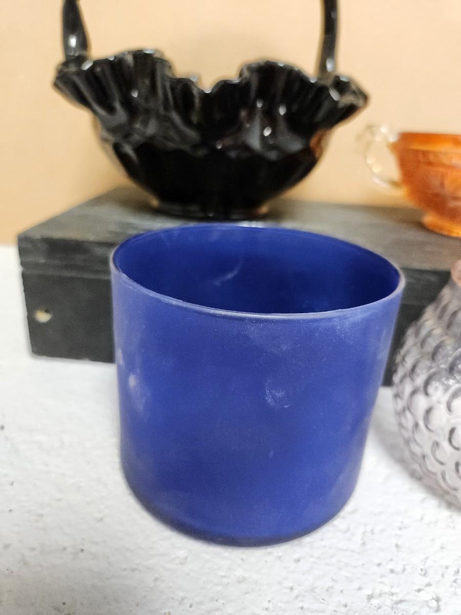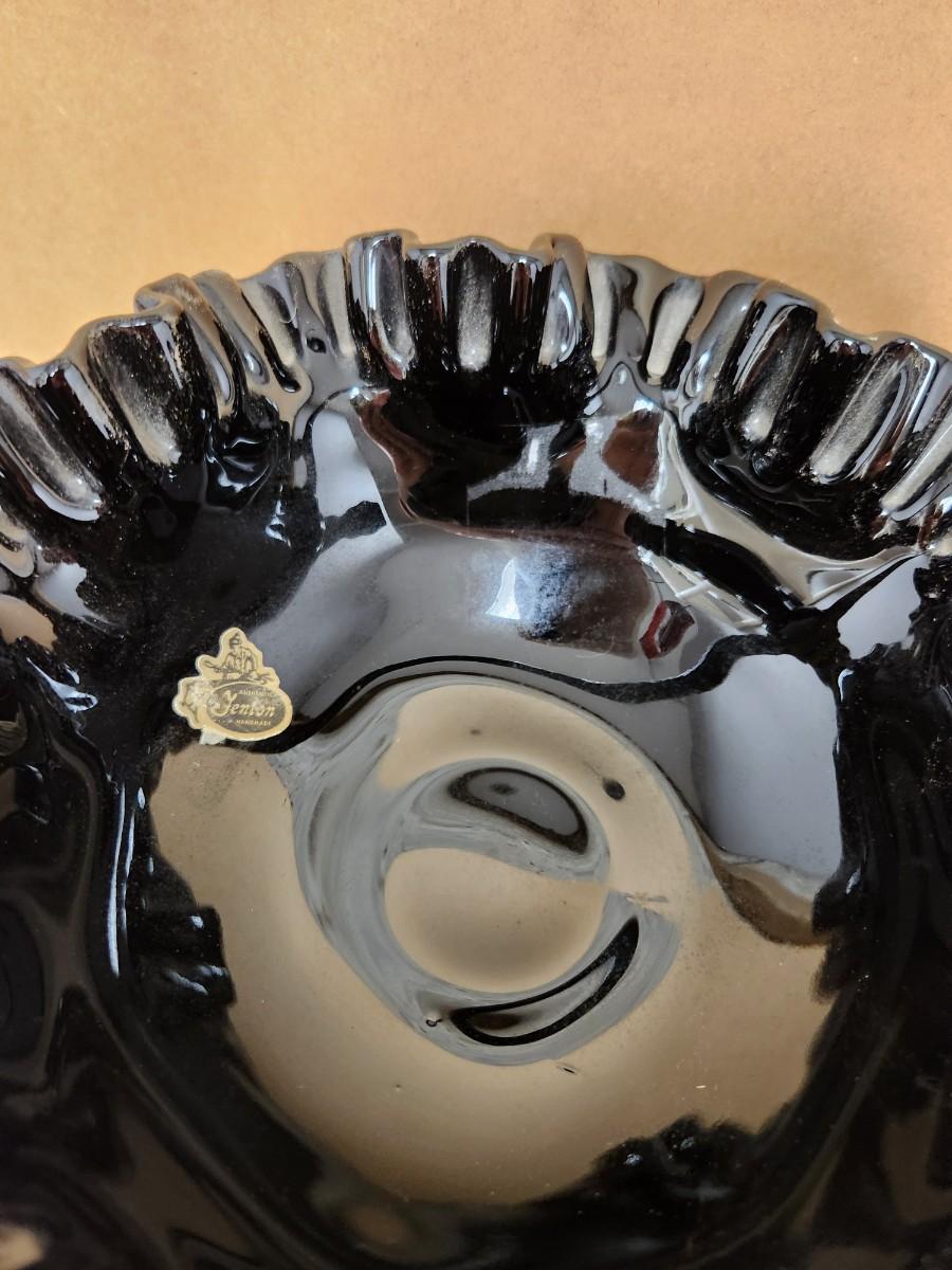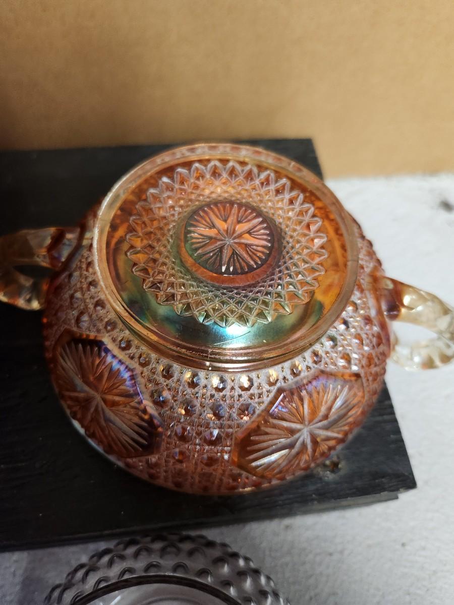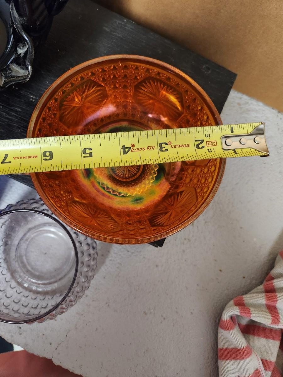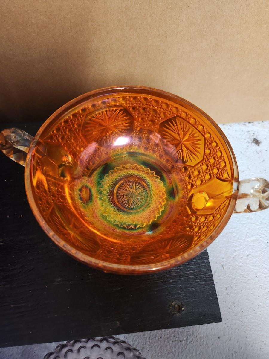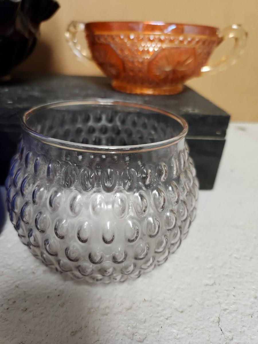 Beautiful black thumbprint Fenton basket with tag. marigold carnival handled bowl. Cobalt vase and clear knobby rose bowl.