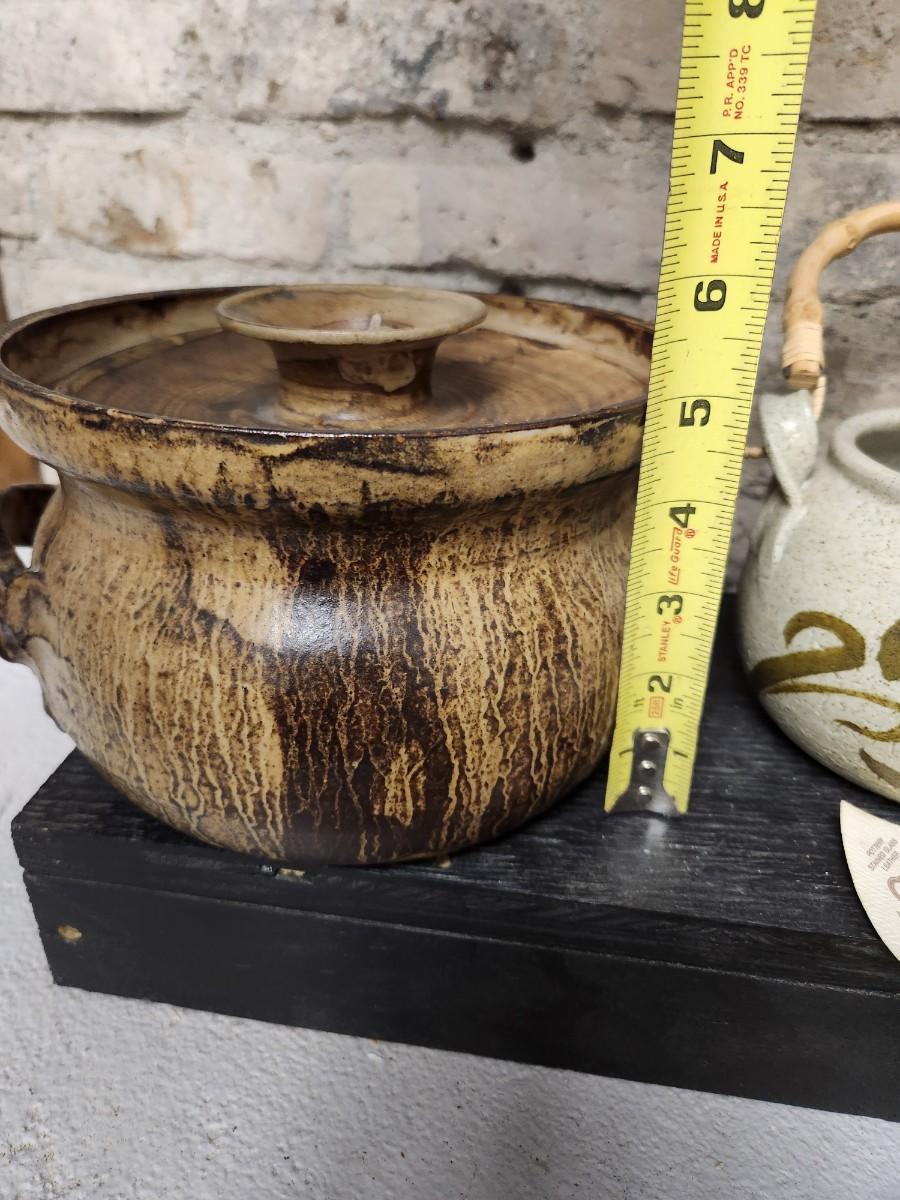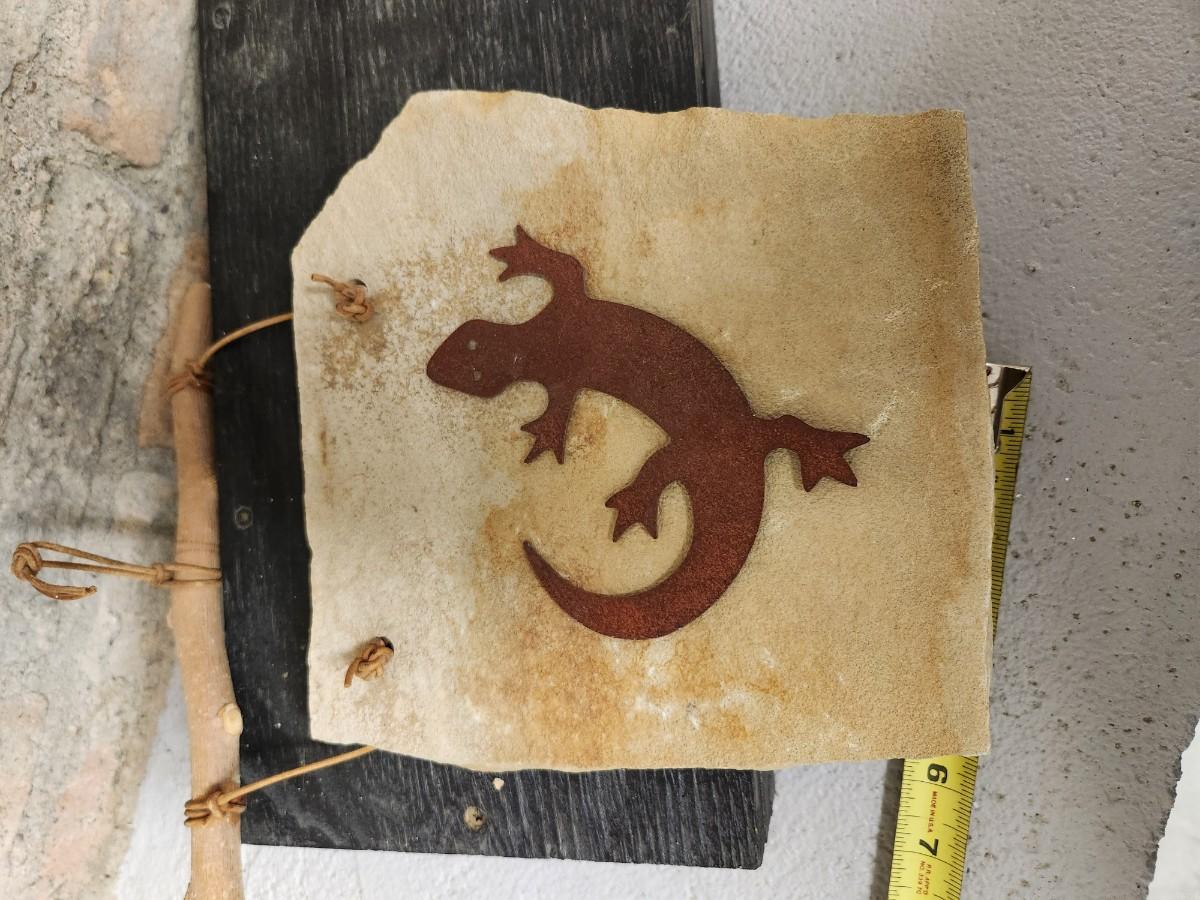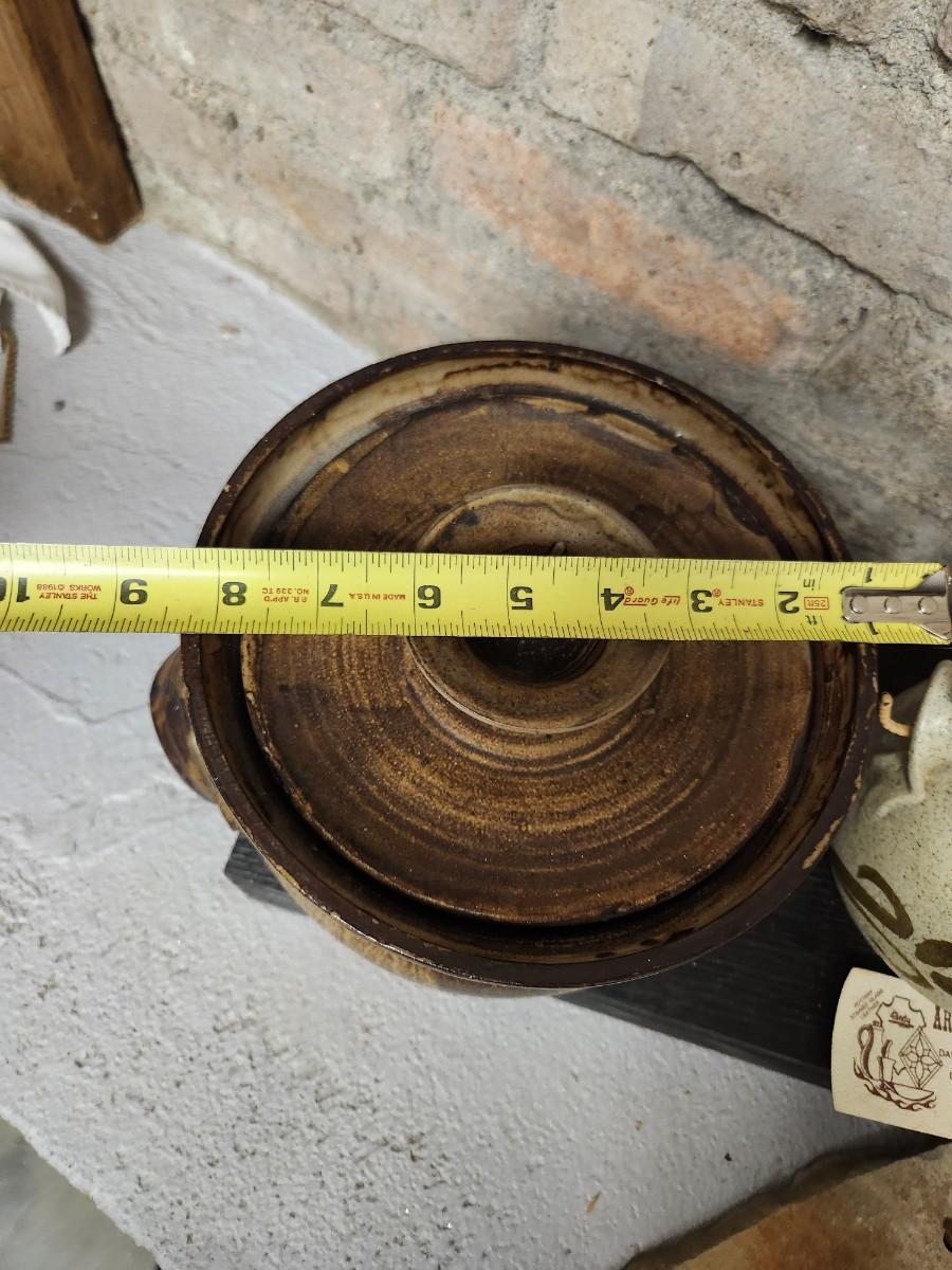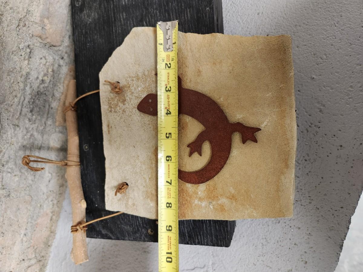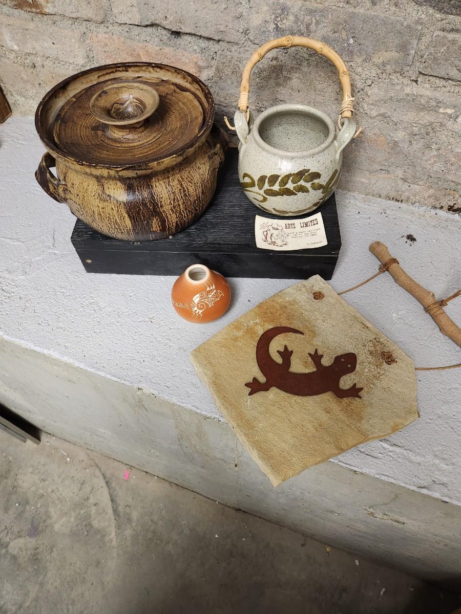 Awesome studio made casserole. Arts Ltd out of Dickinson, ND handled pot. Cute little indigenous pot and a slate tile with metal gecko attached wall hanging