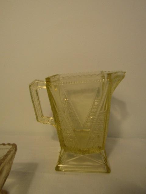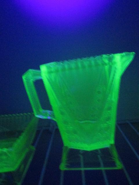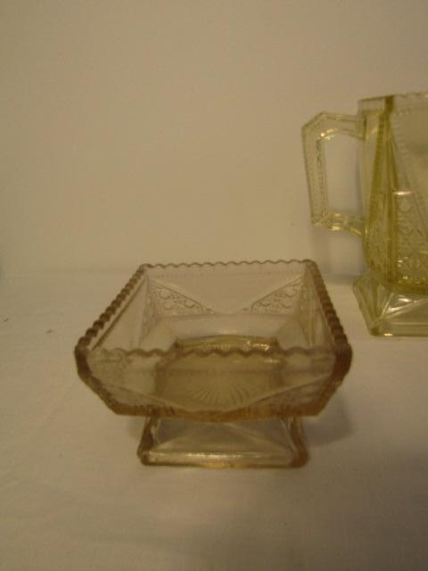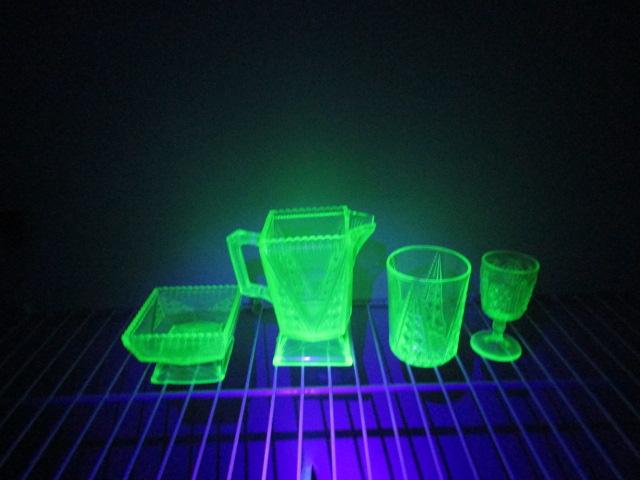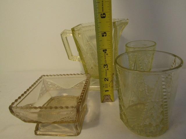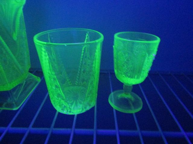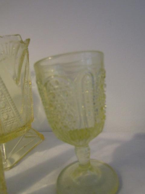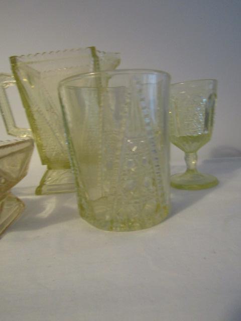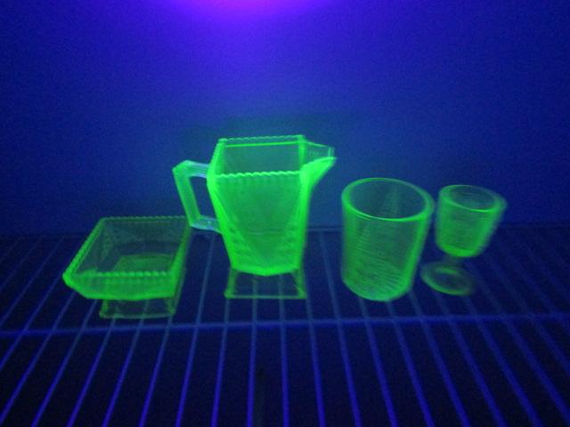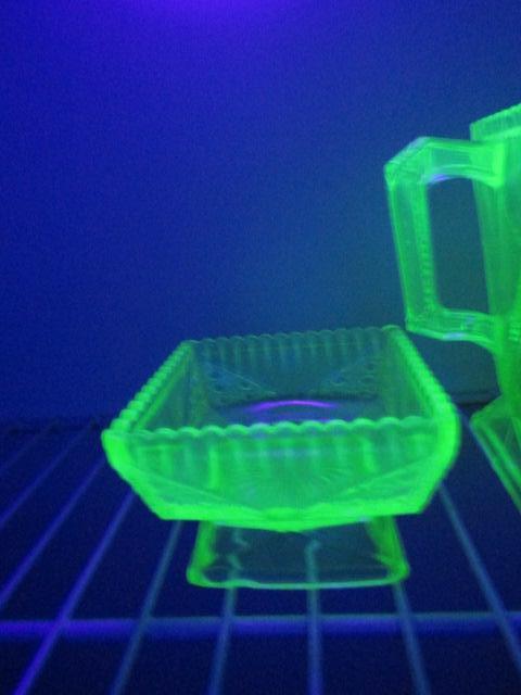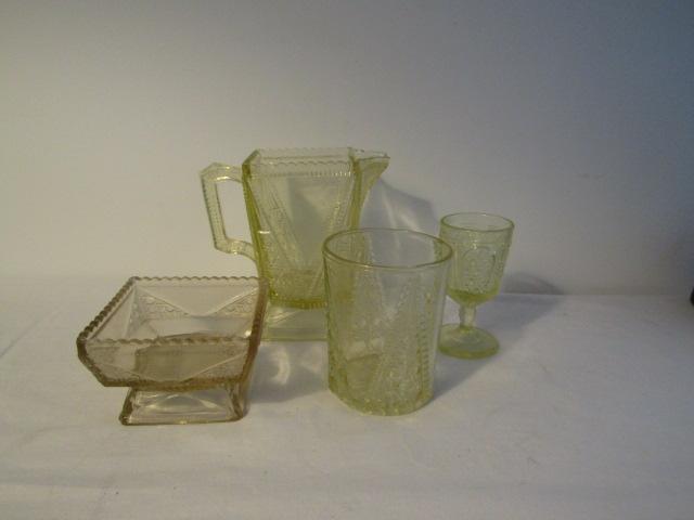 4 Pieces of Uranium Glass (Small Pitcher, Square Dish, Glass, and Stemmed Glass)