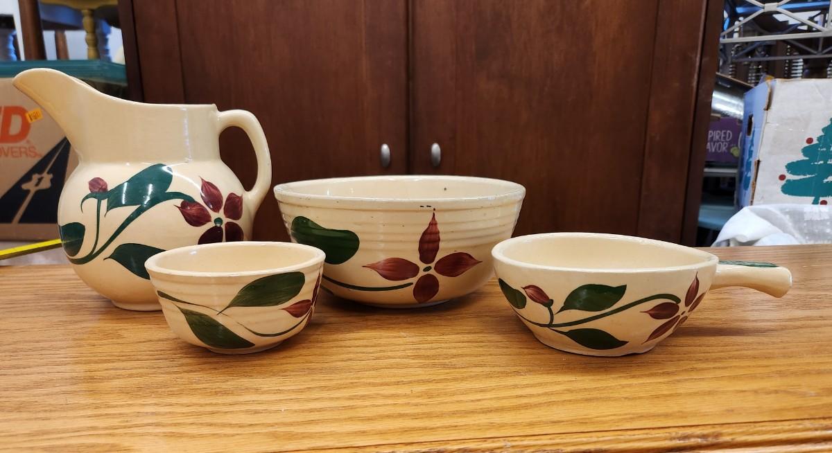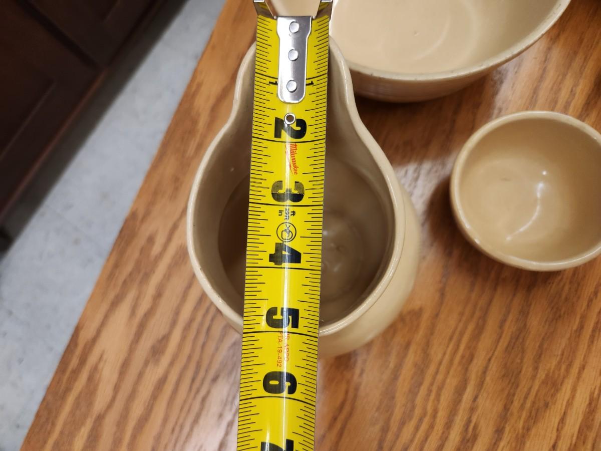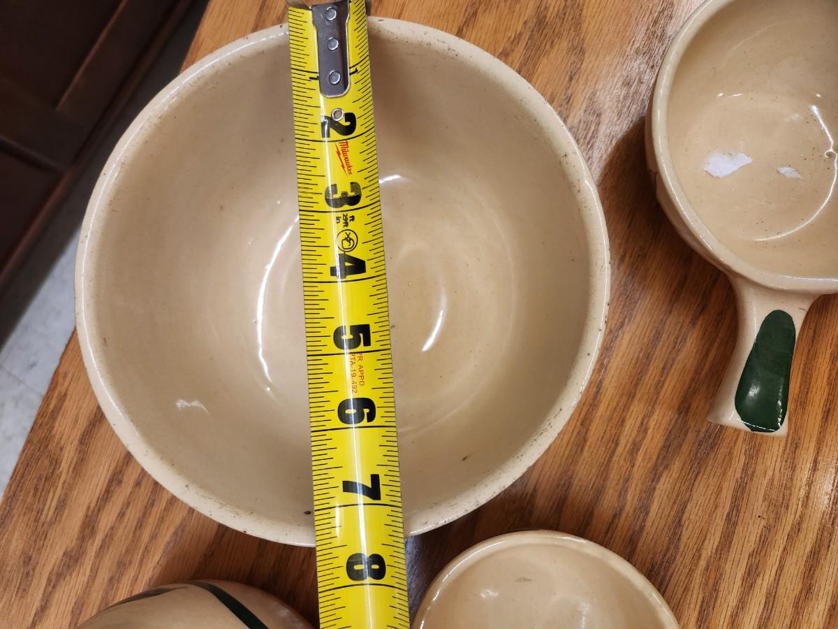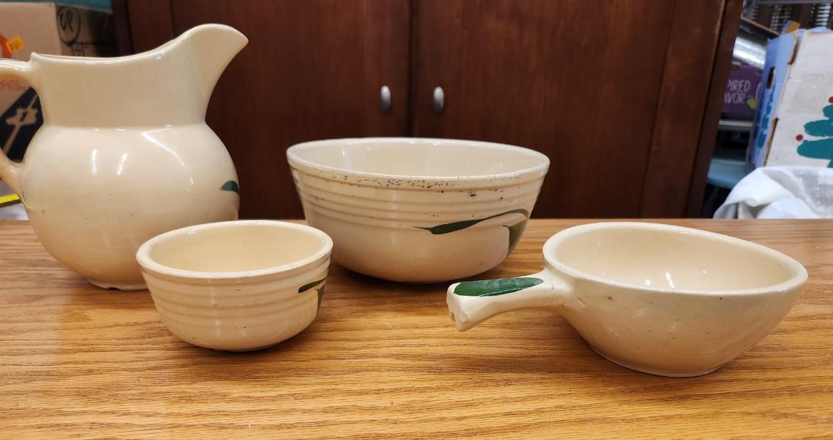 Small lug, milk pitcher, mixing bowl and ramekin.