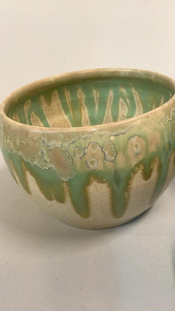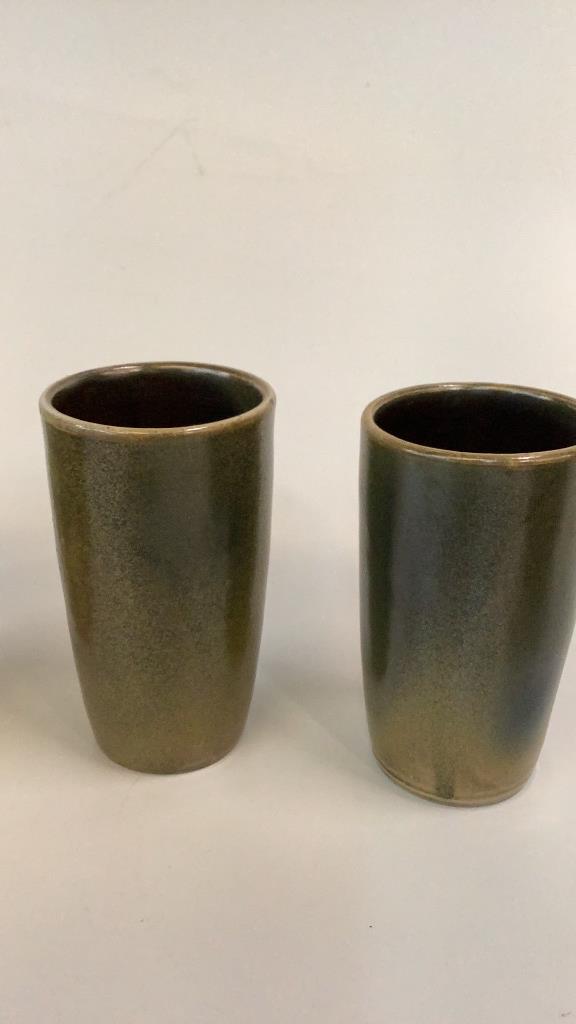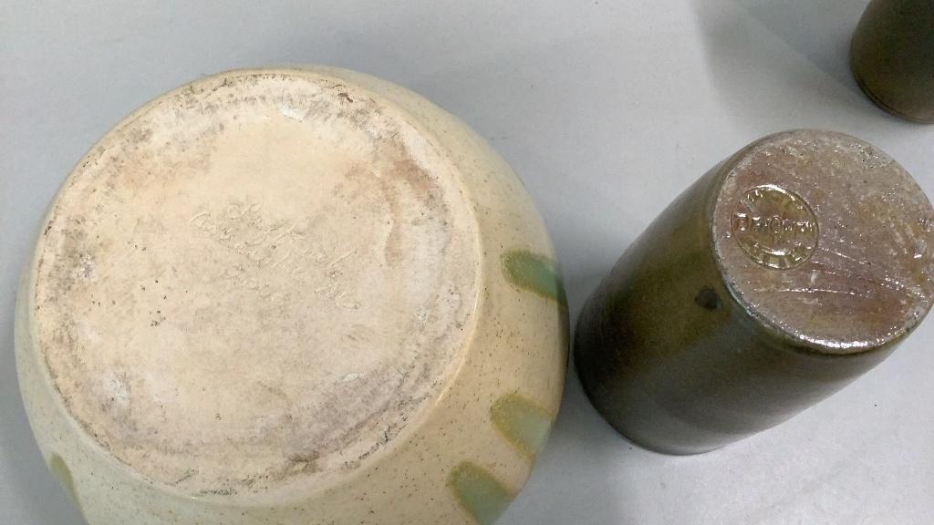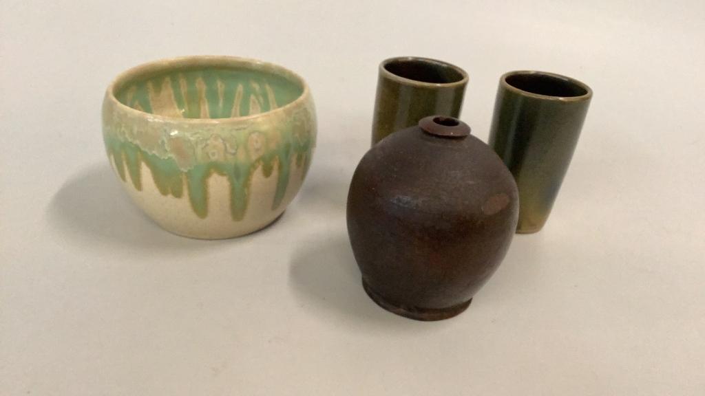 Rodney Leftwich 7 inch bowl, crystalline runs at rimÂ…signed and dated 2000Â…2 Ben Owen III tumblers at 5.5 inchesÂ…brown matte glazed weed pot, unsigned at 6 inchesÂ…