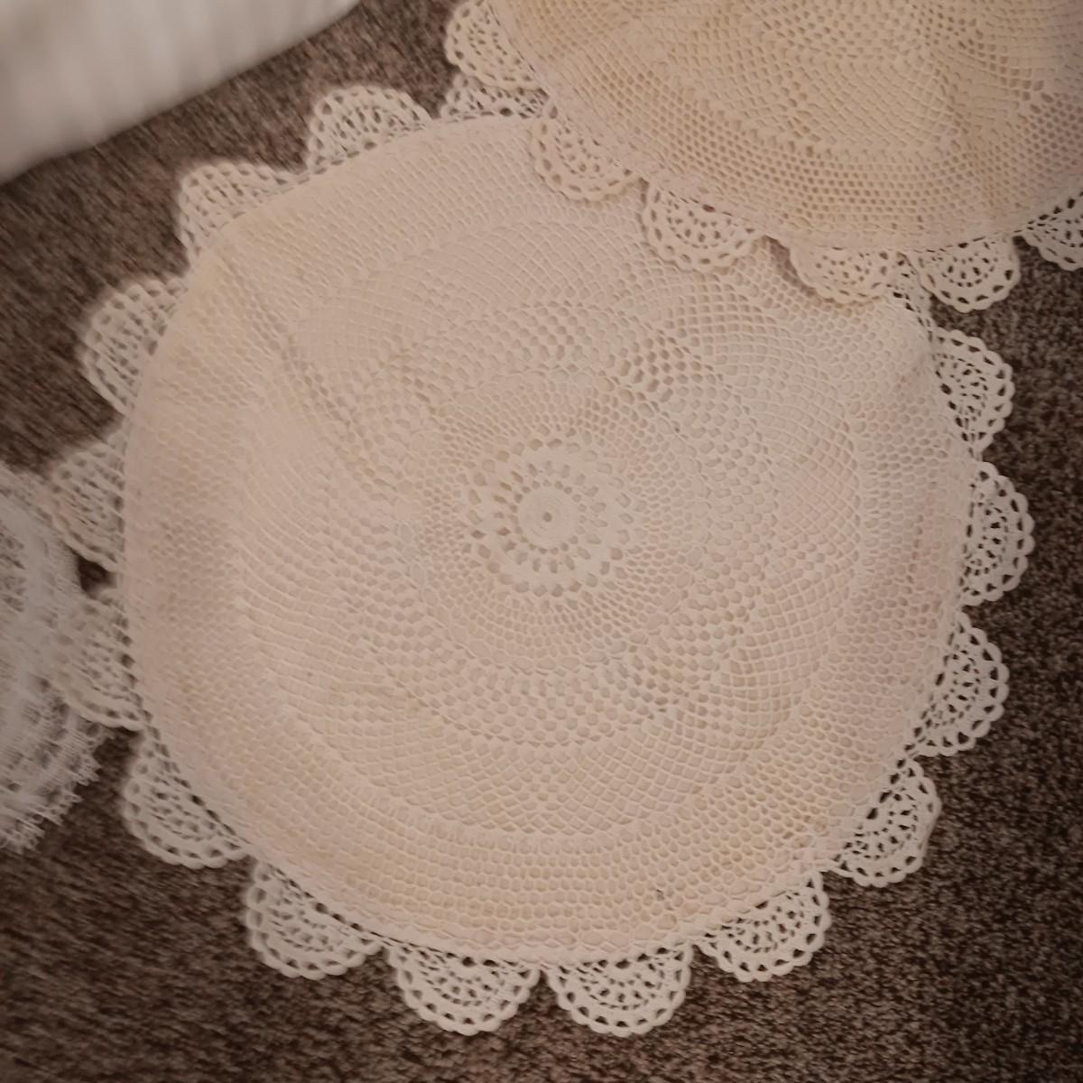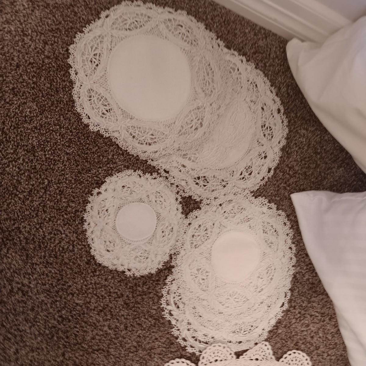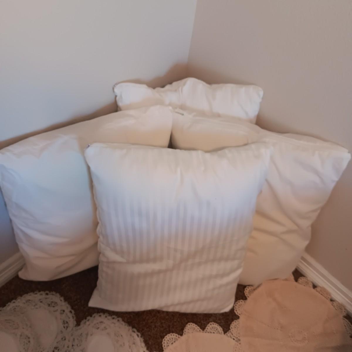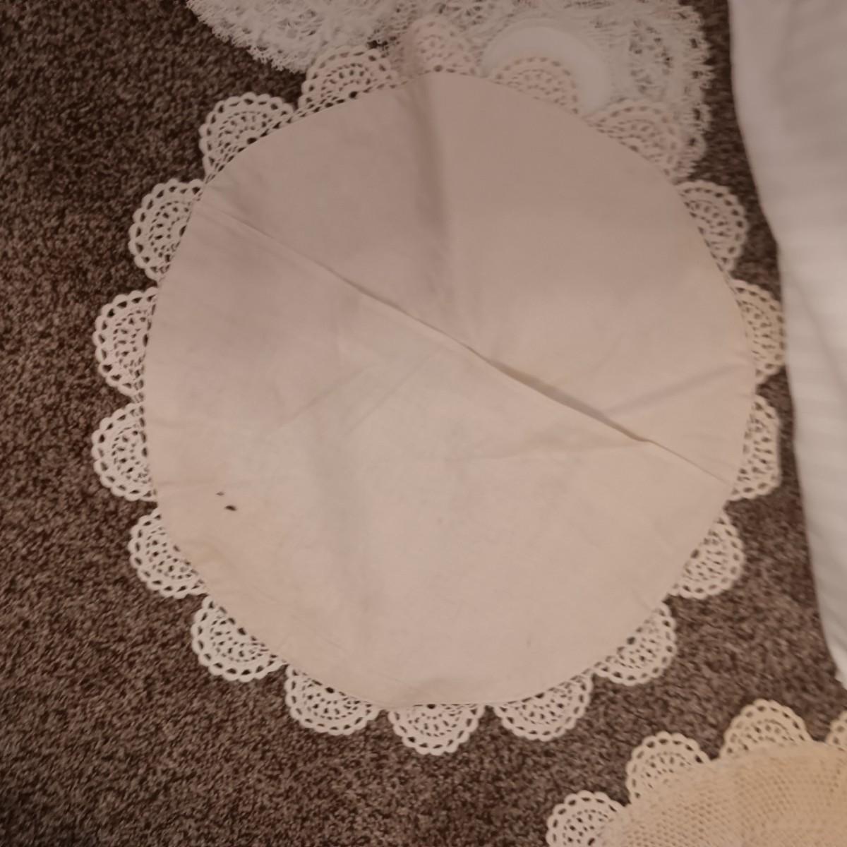 4 PILLOWS, 2 THROW PILLOW COVERS AND DOILIES
