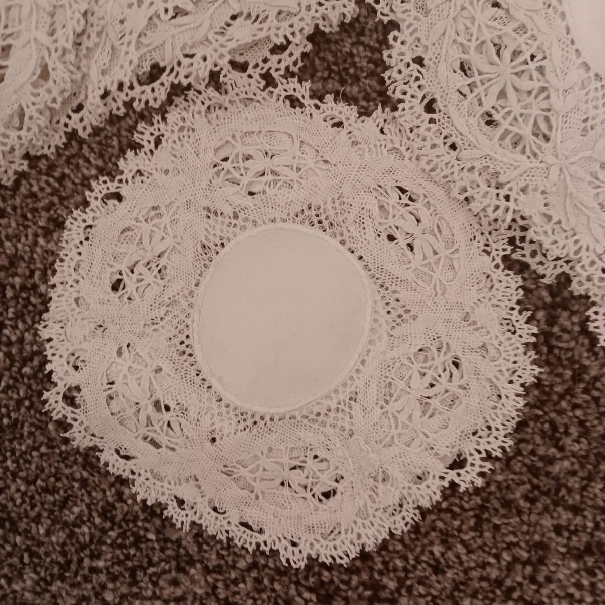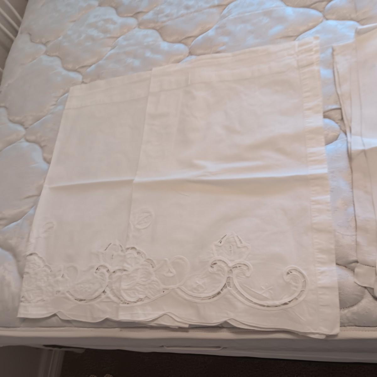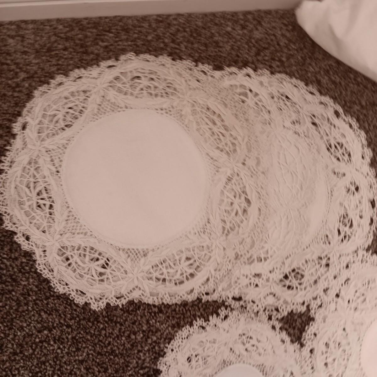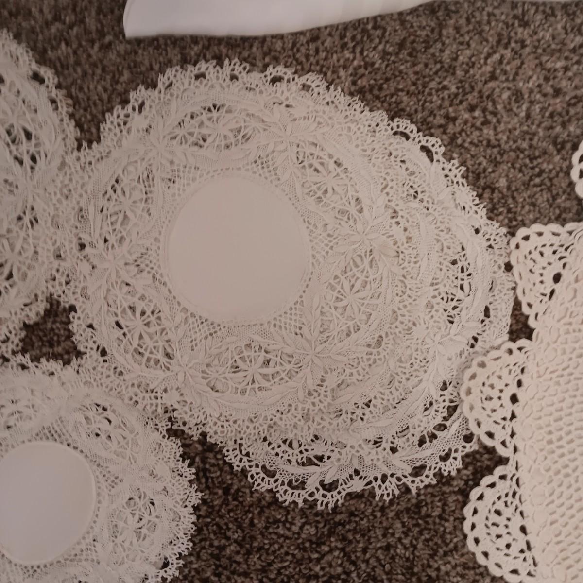 4 PILLOWS, 2 THROW PILLOW COVERS AND DOILIES