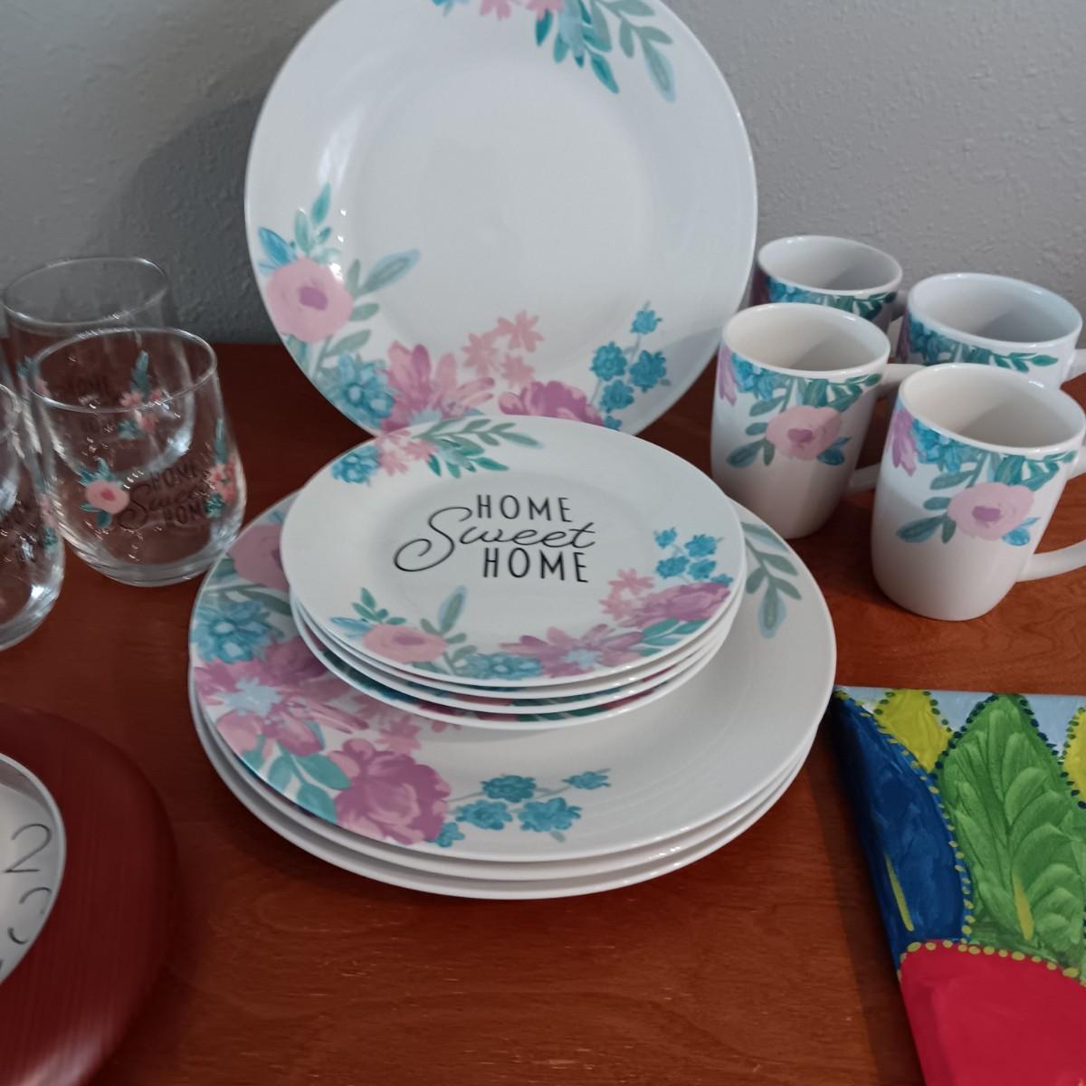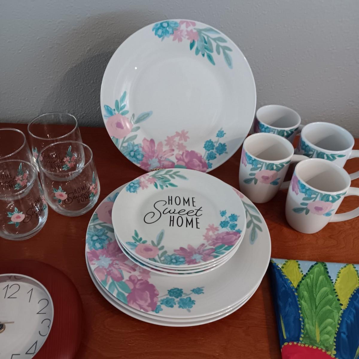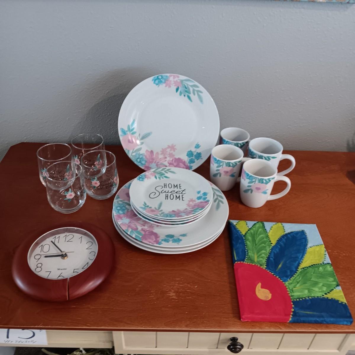 4 PLACE SETTING OF "HOME SWEET HOME" DINNERWARE, MATCHING GLASSES & COFFEE MUGS PLUS WALL CLOCK AND ART