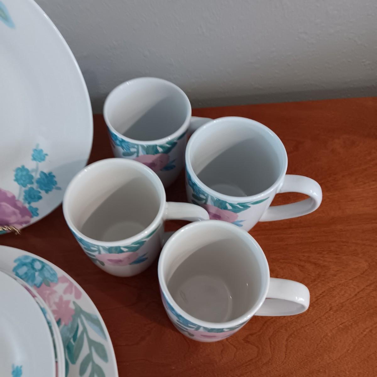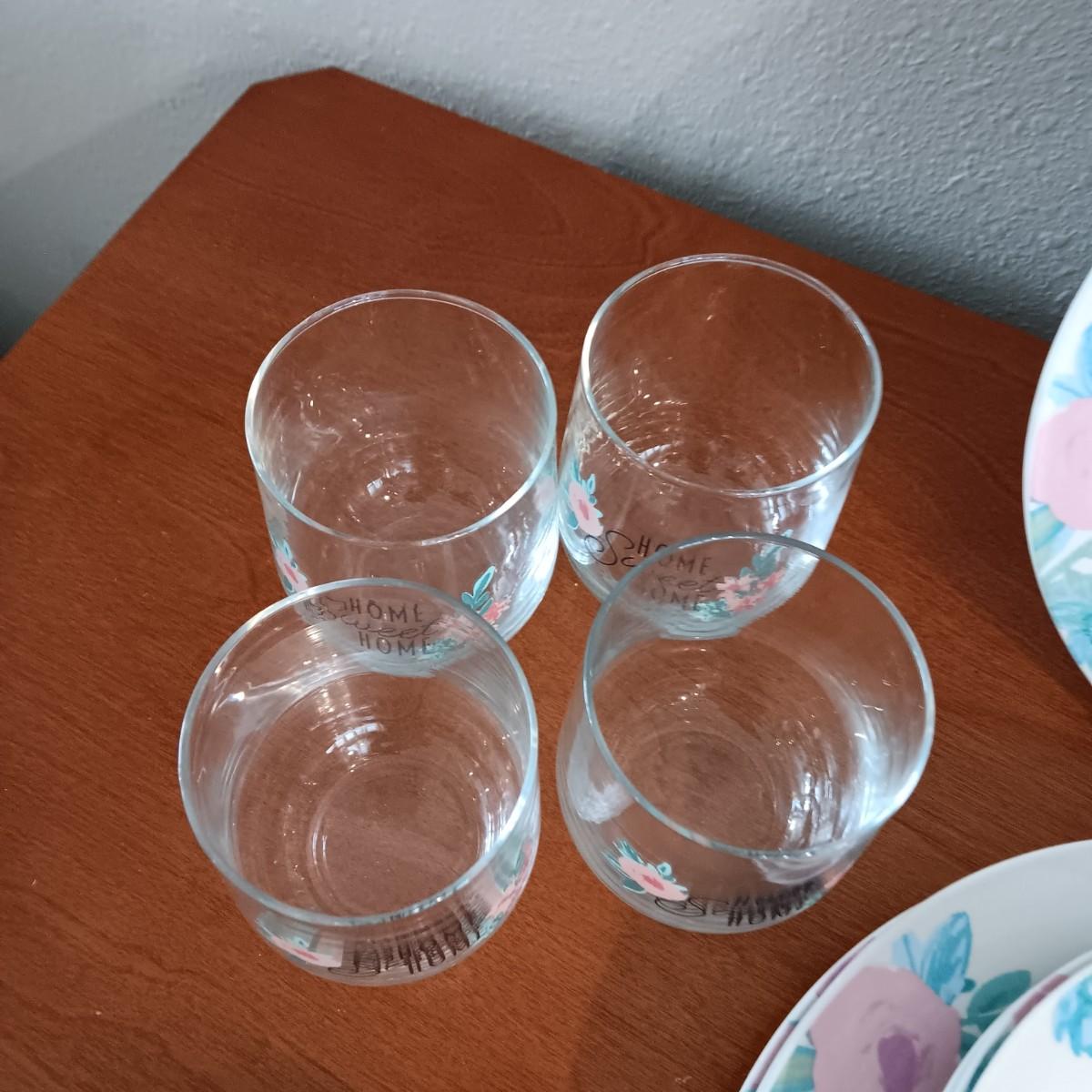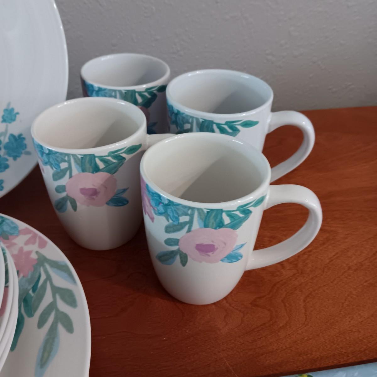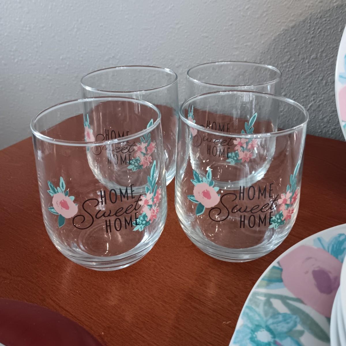 4 PLACE SETTING OF "HOME SWEET HOME" DINNERWARE, MATCHING GLASSES & COFFEE MUGS PLUS WALL CLOCK AND ART