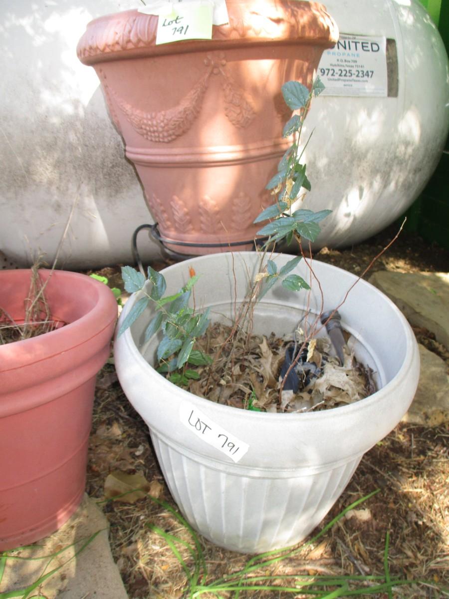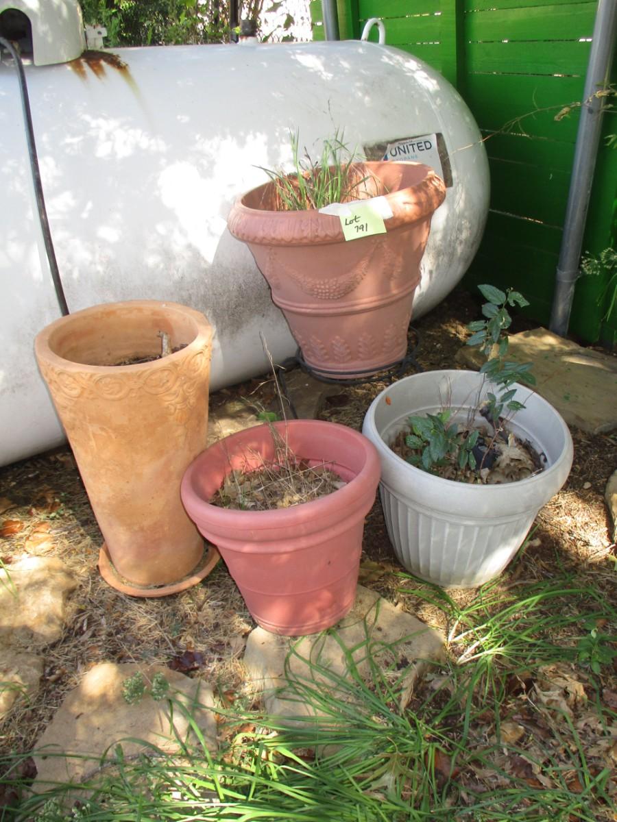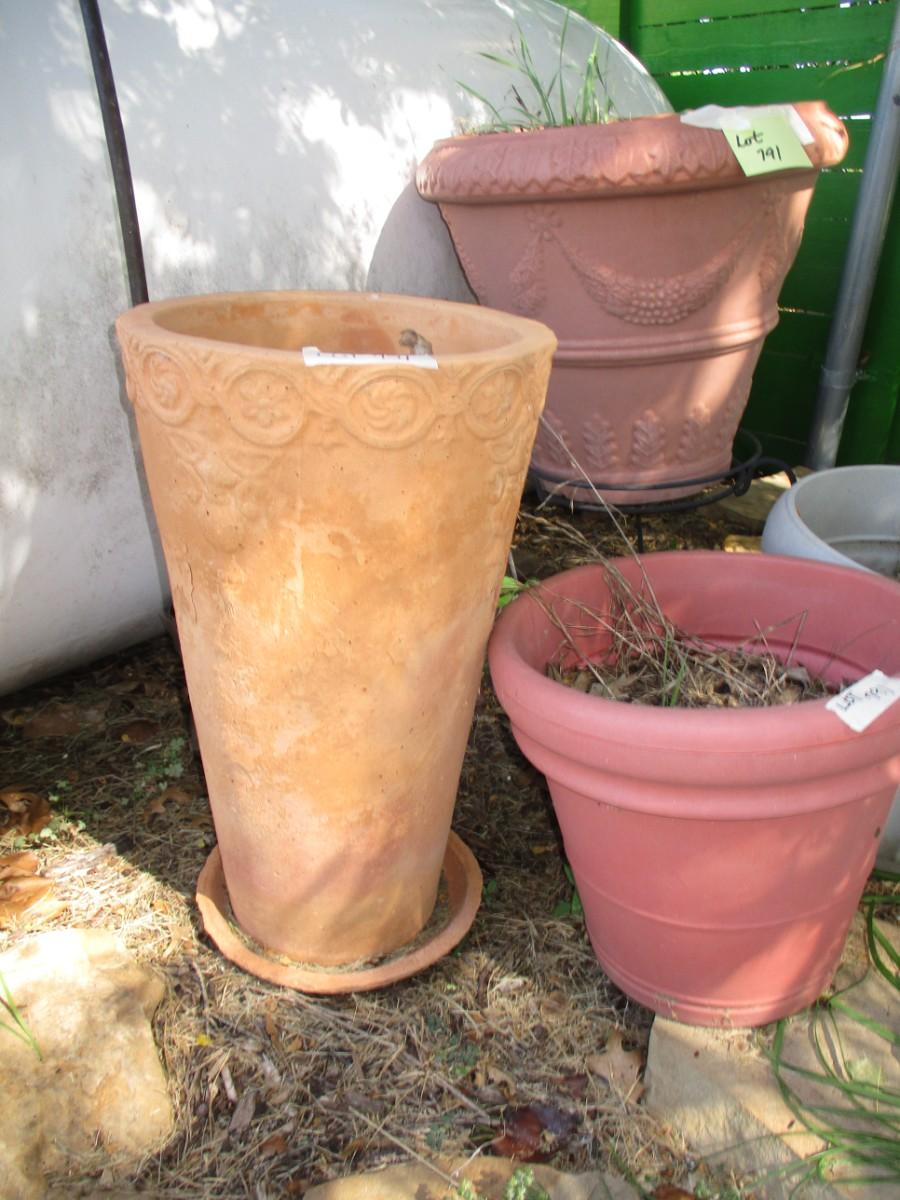 1 Terra Cotta Vase style planter, 3 plastic pots. fair condition
