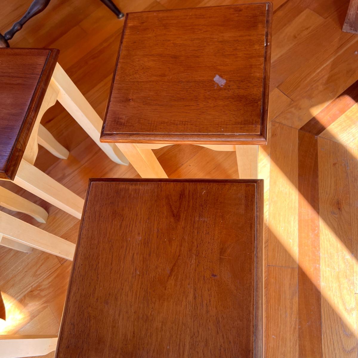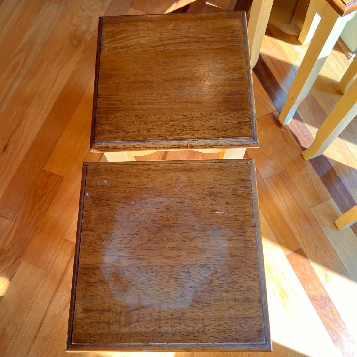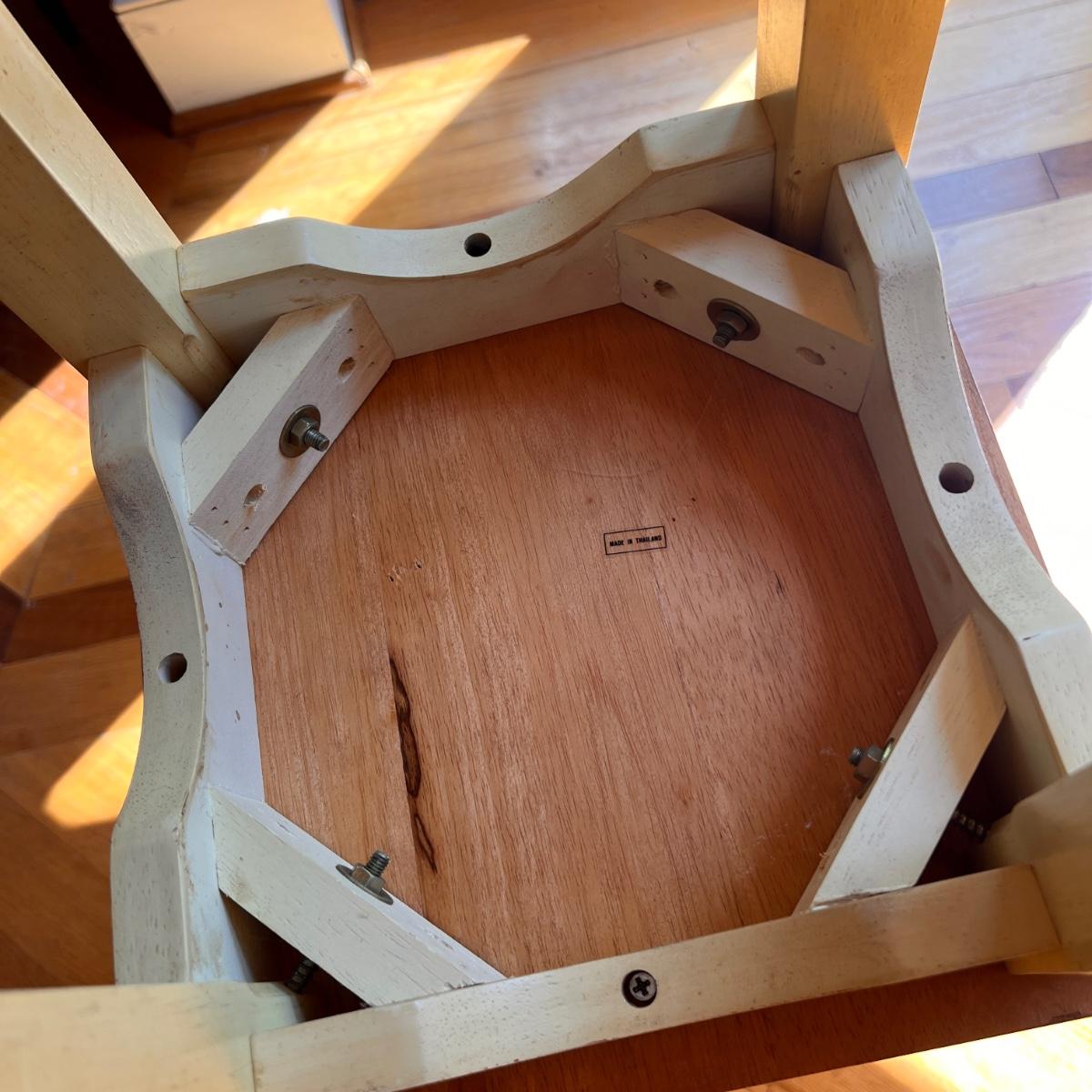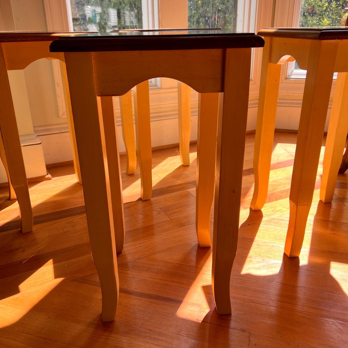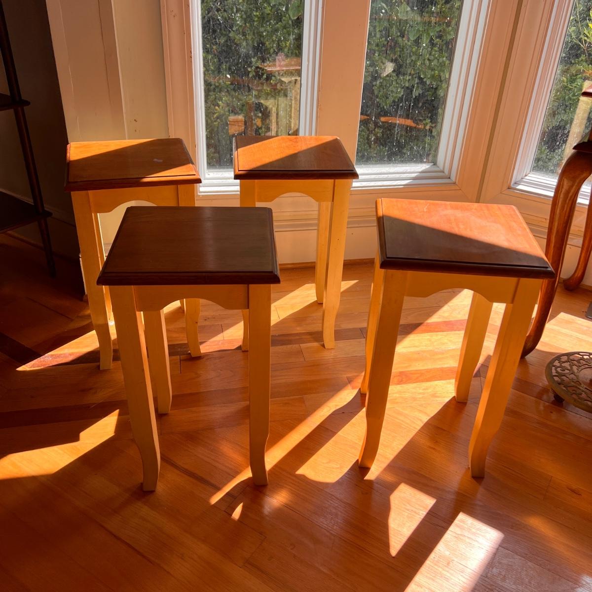 3 of the tops are in good used condition. One has a water stain. See all pics. Legs are butter yellow, color shown best in last picture.