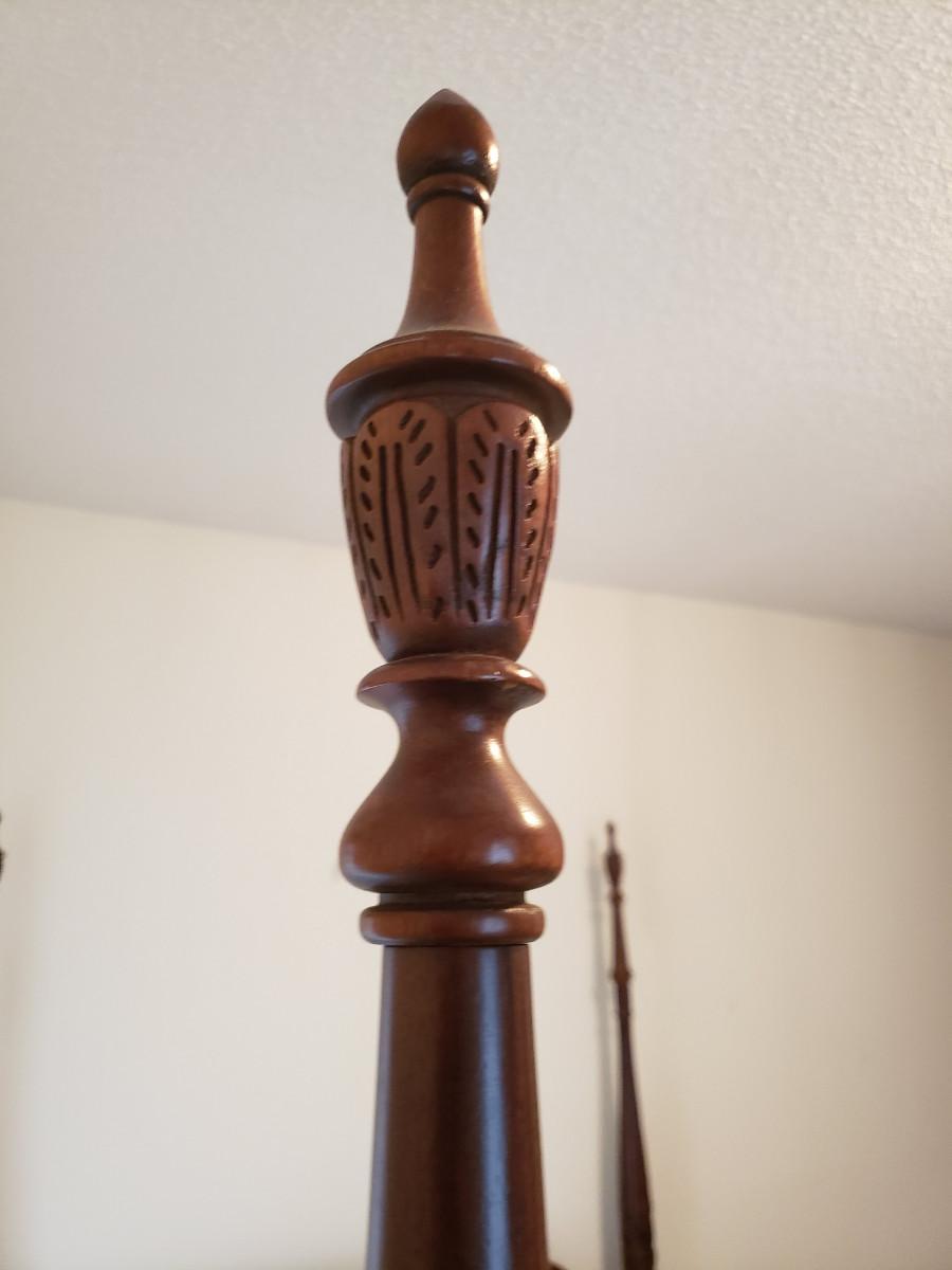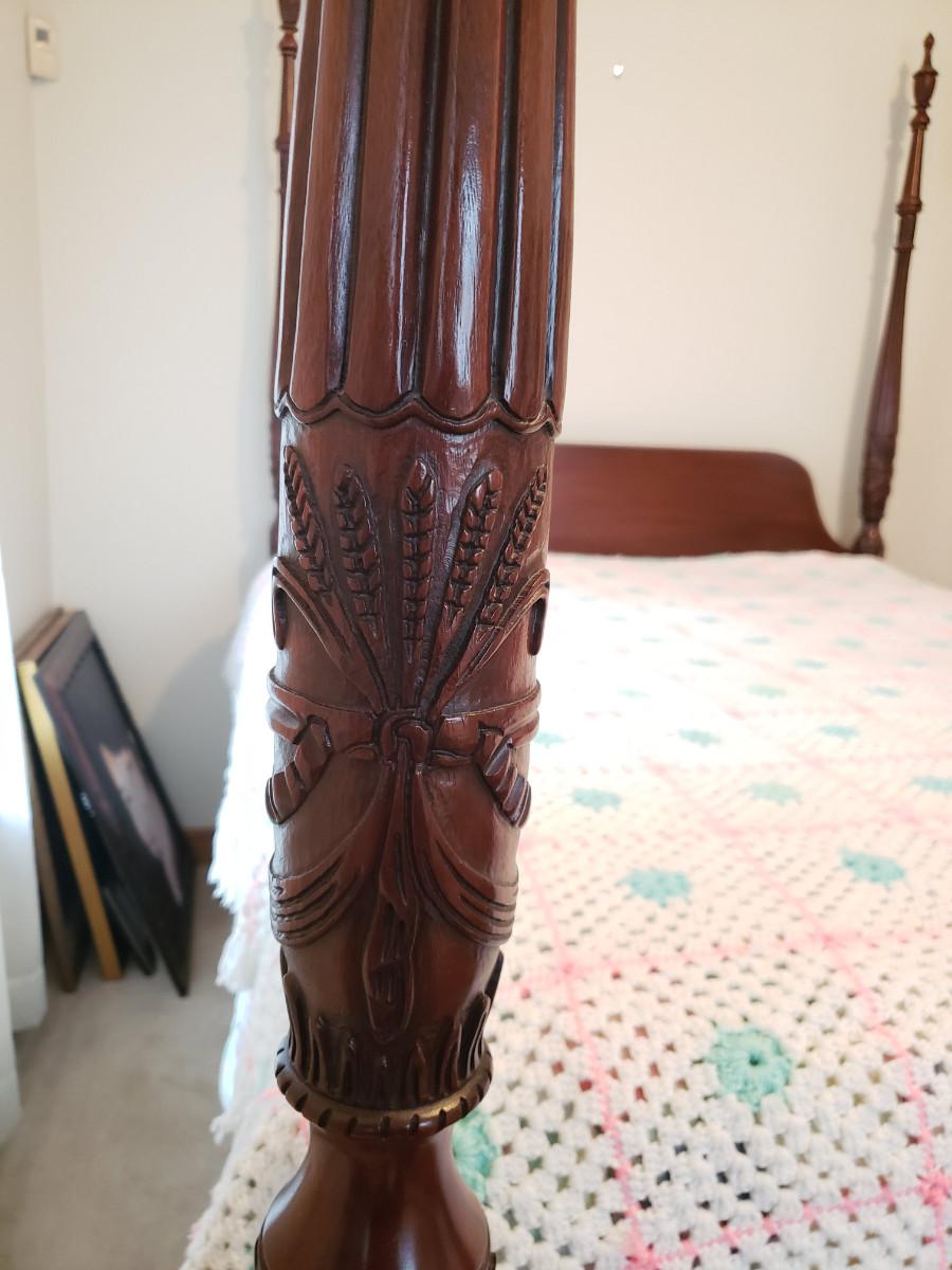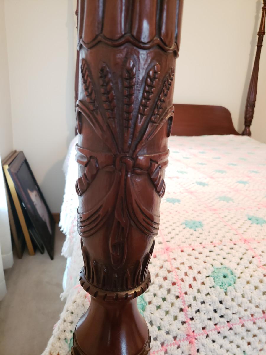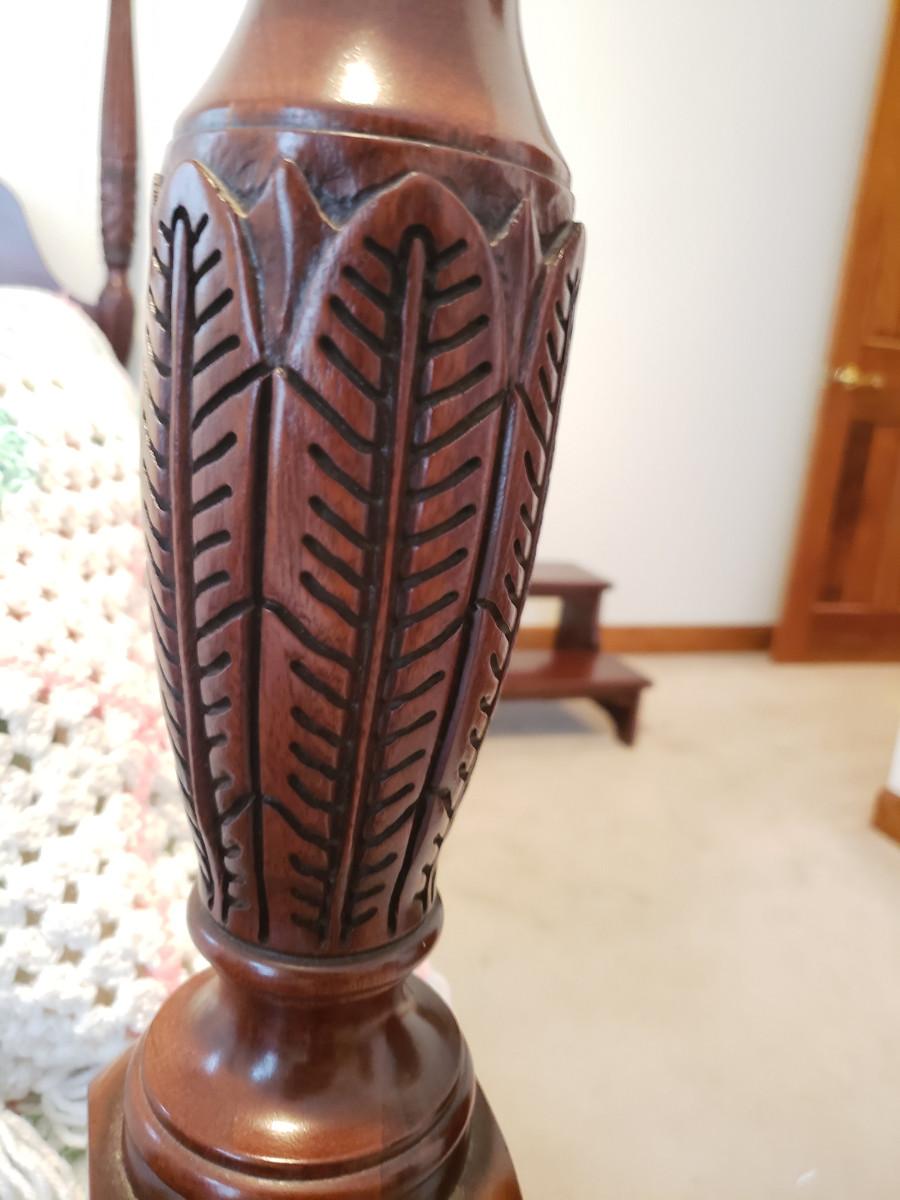 There are a lot of pictures as we wanted to display the intricate carving around the posts and the backboard. We believe this to be a queen size bed based on the size of the mattress.