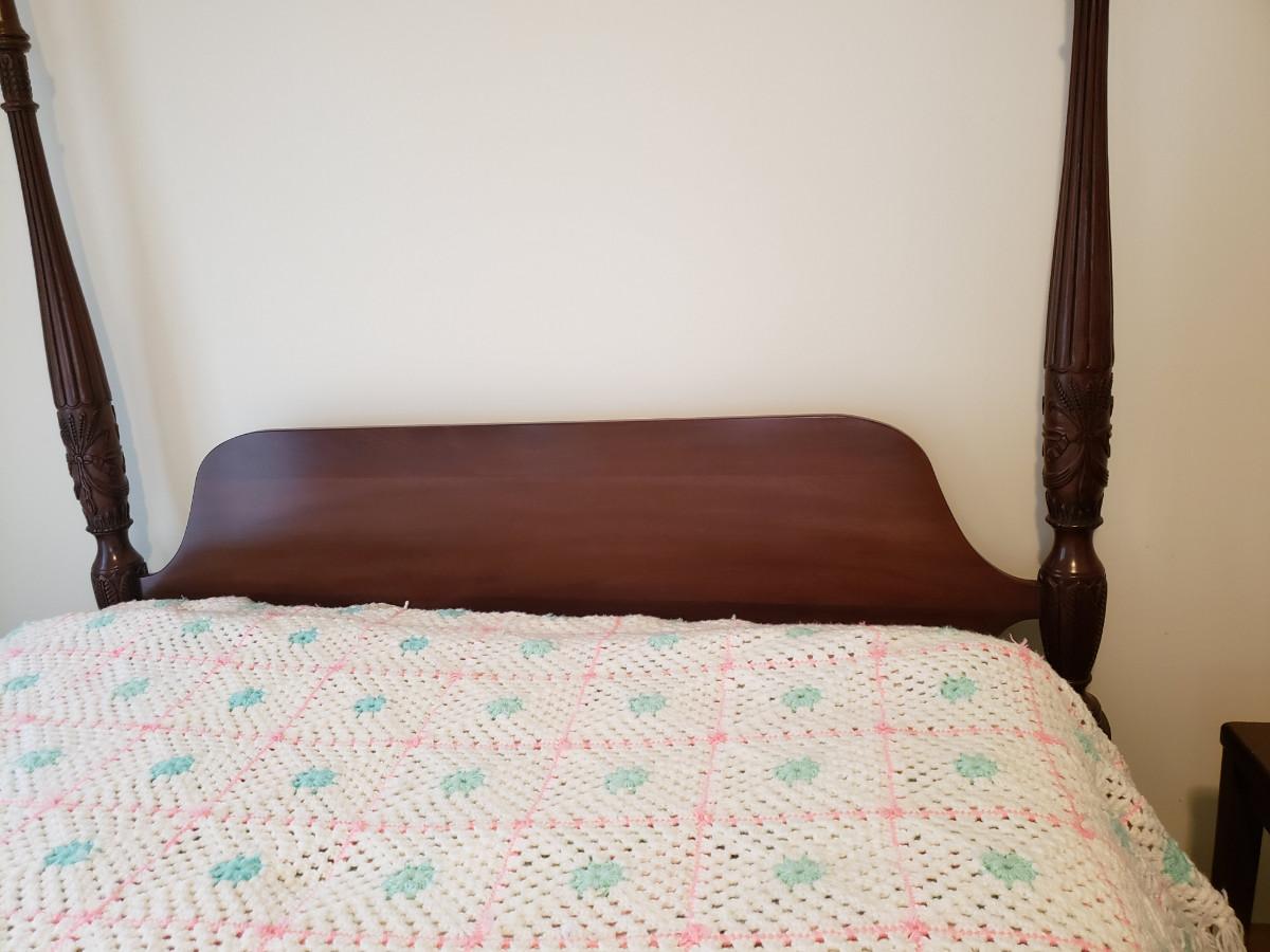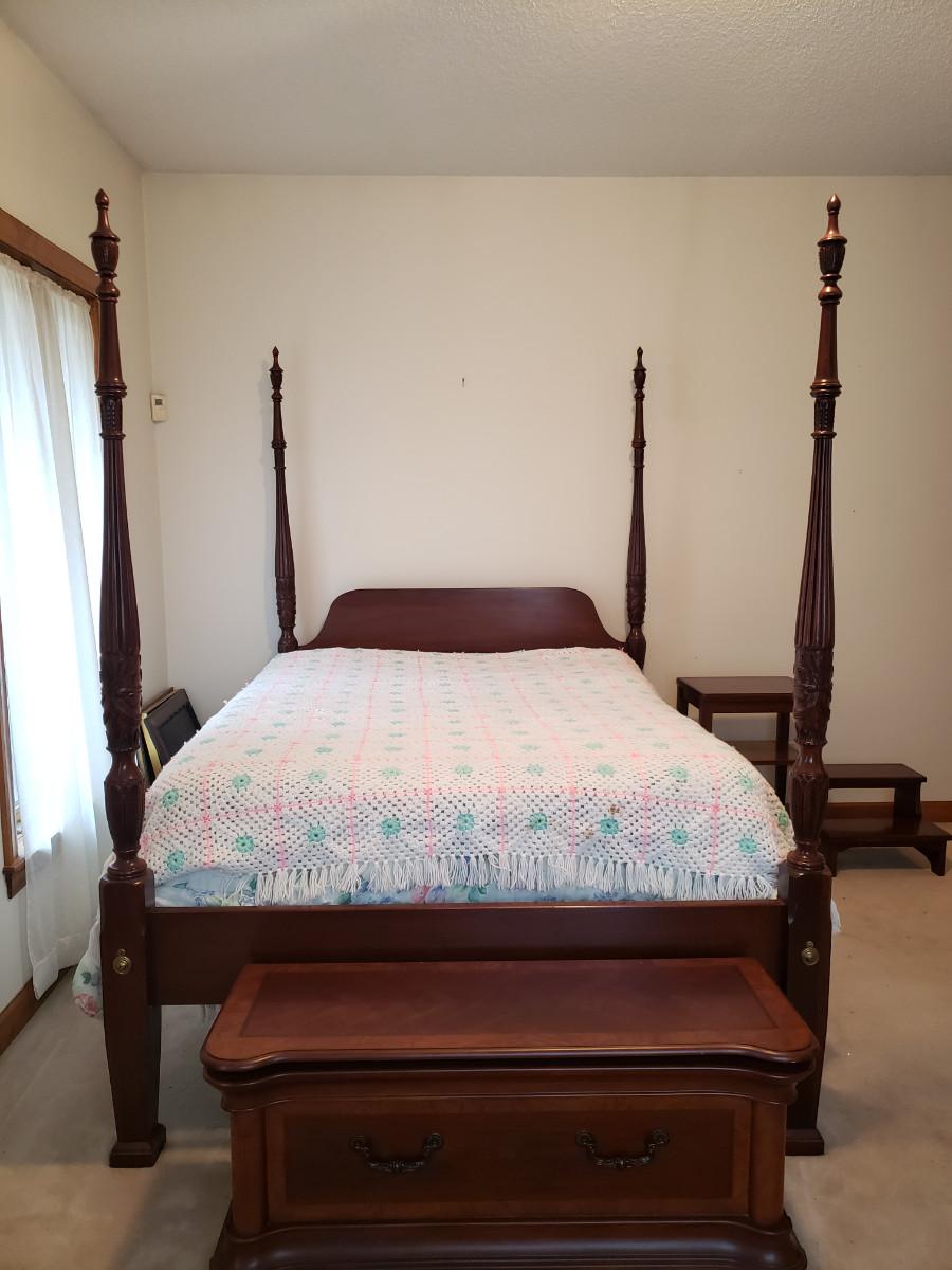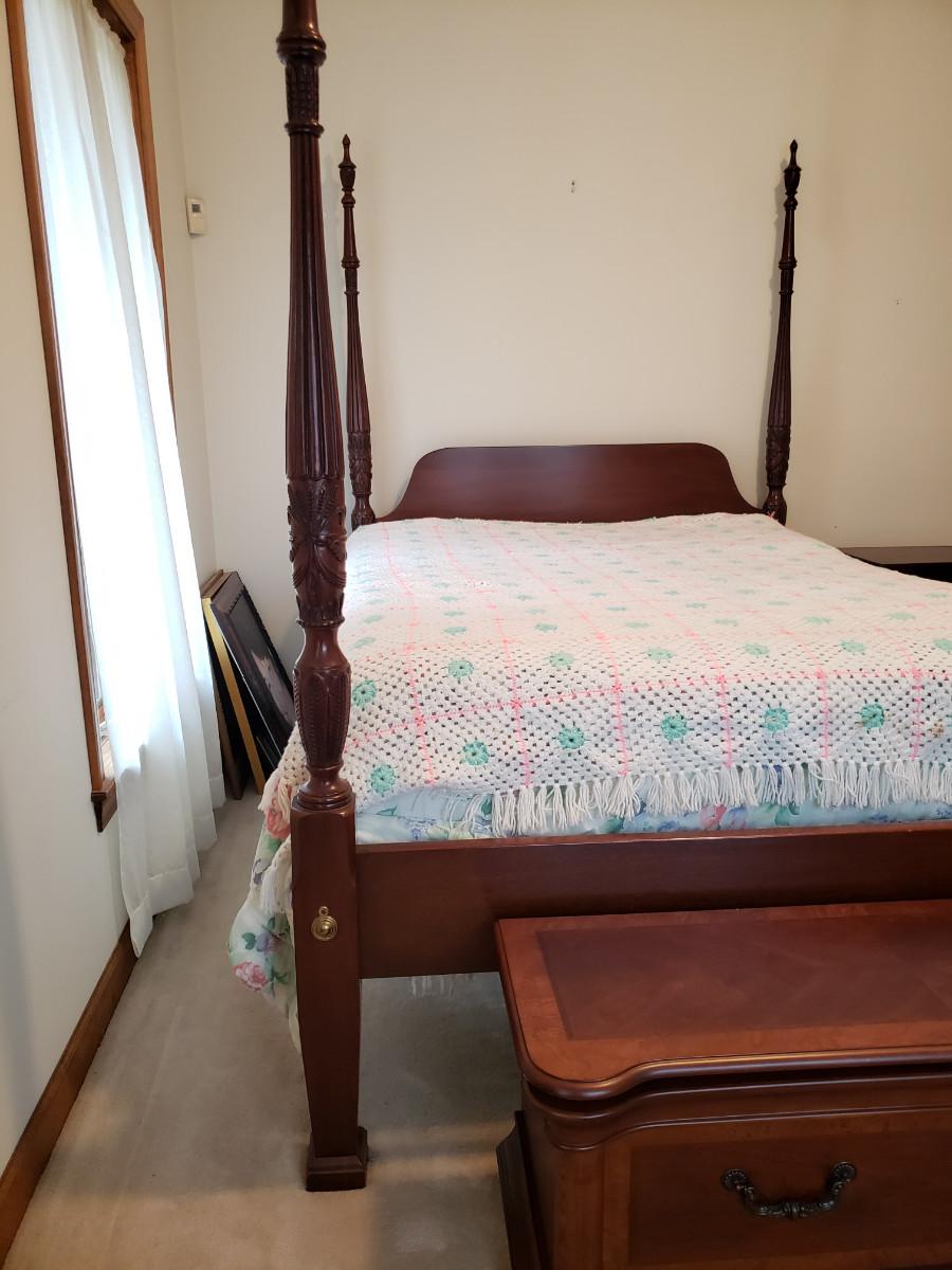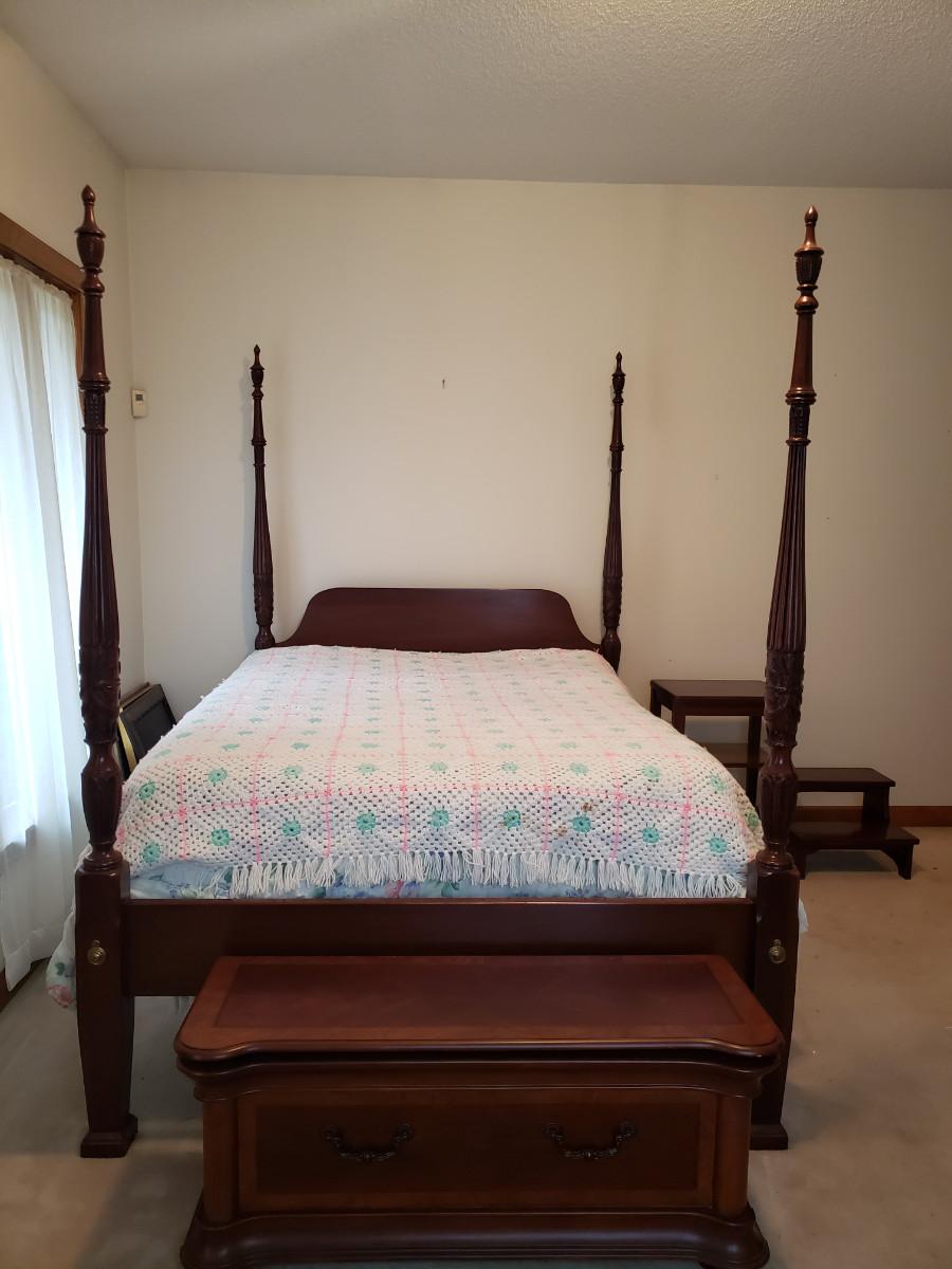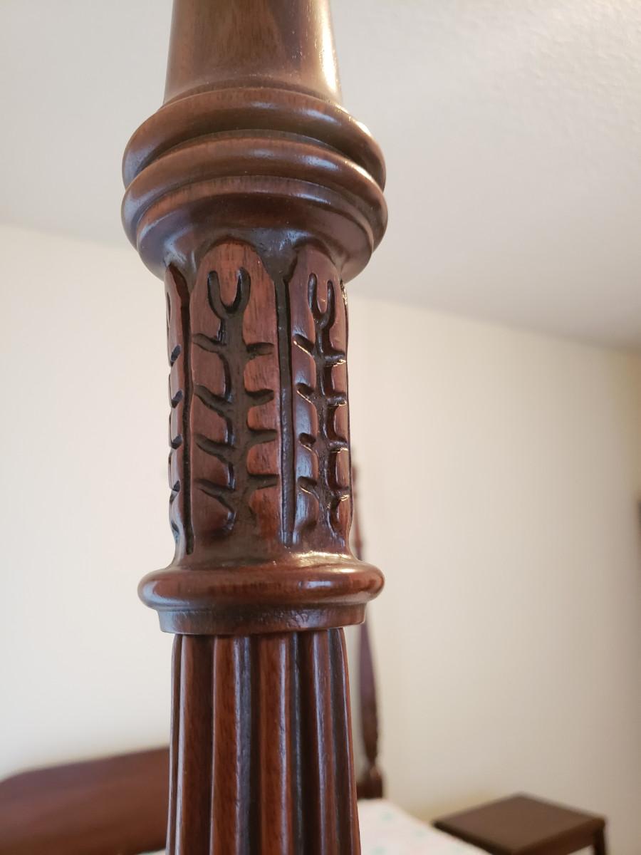 There are a lot of pictures as we wanted to display the intricate carving around the posts and the backboard. We believe this to be a queen size bed based on the size of the mattress.