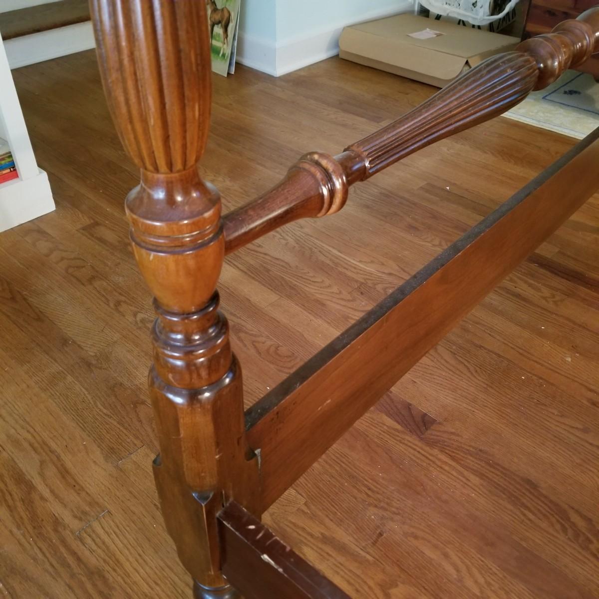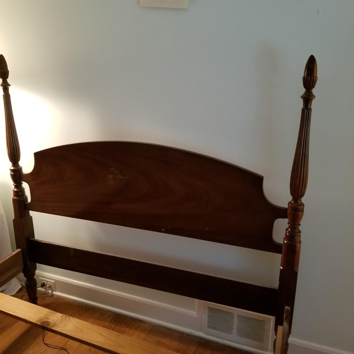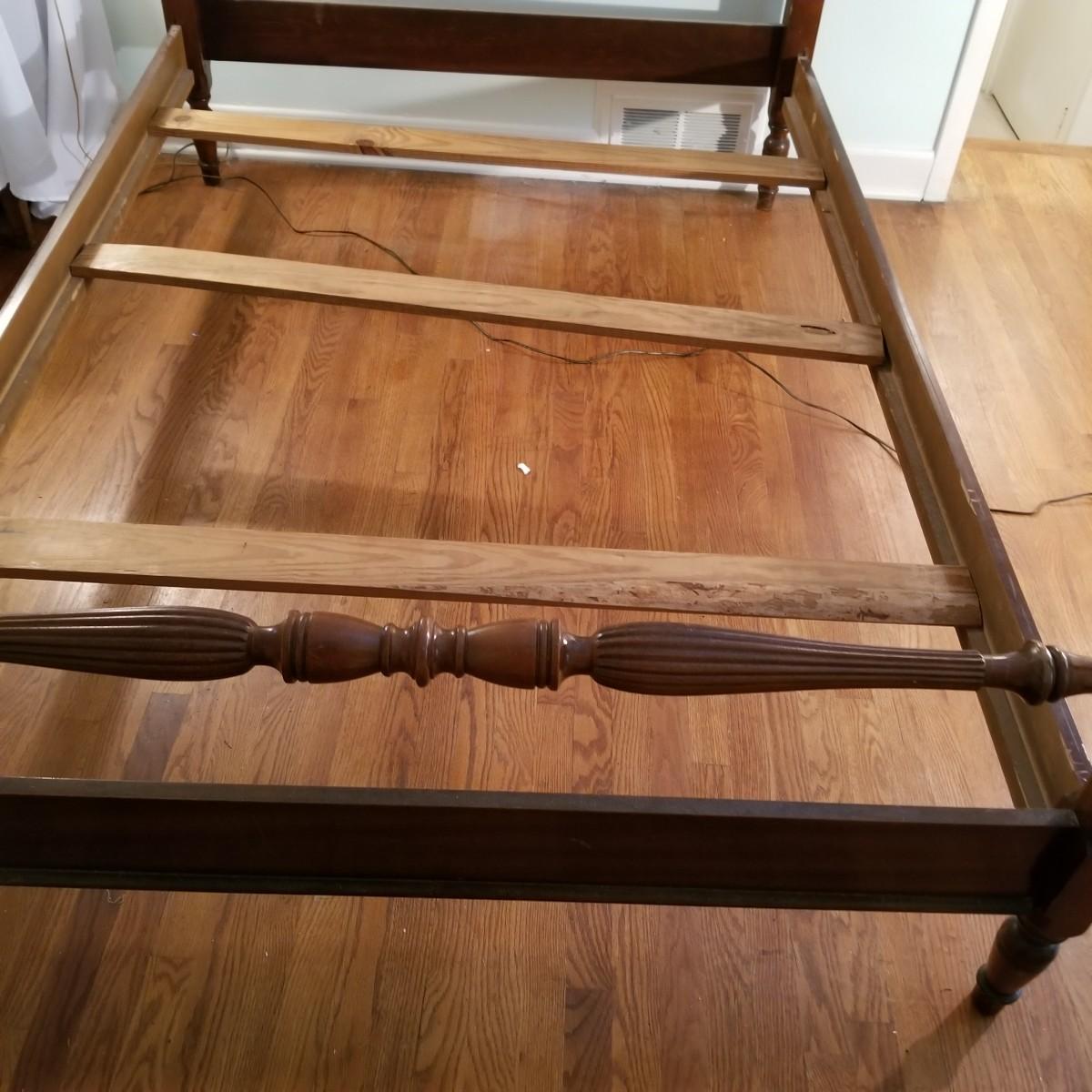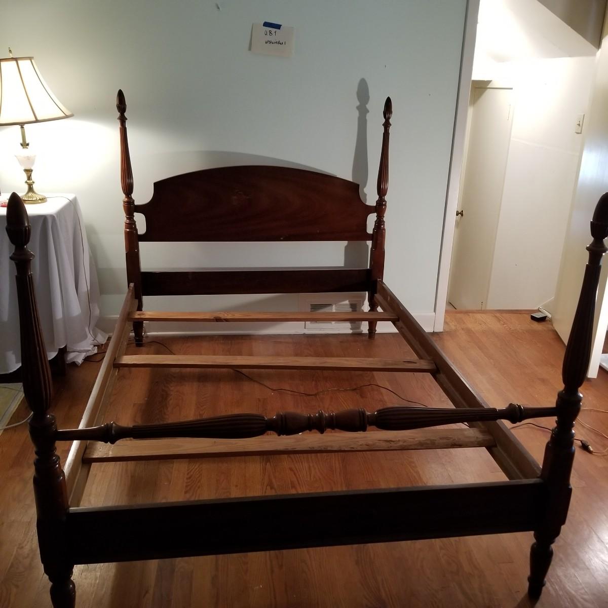 Full size Dixie brand wood bed frame with four reeded posts. Has side rails and slats. Frame measures 56" x 82", headboard is 54" h and footboard is 48" h. Frame is a mahogany color and in fair condition. Mattresscfoundatio height approximately 12".See photos for detail. Bed is broken down for transport, is on second floor. Local pickup only.