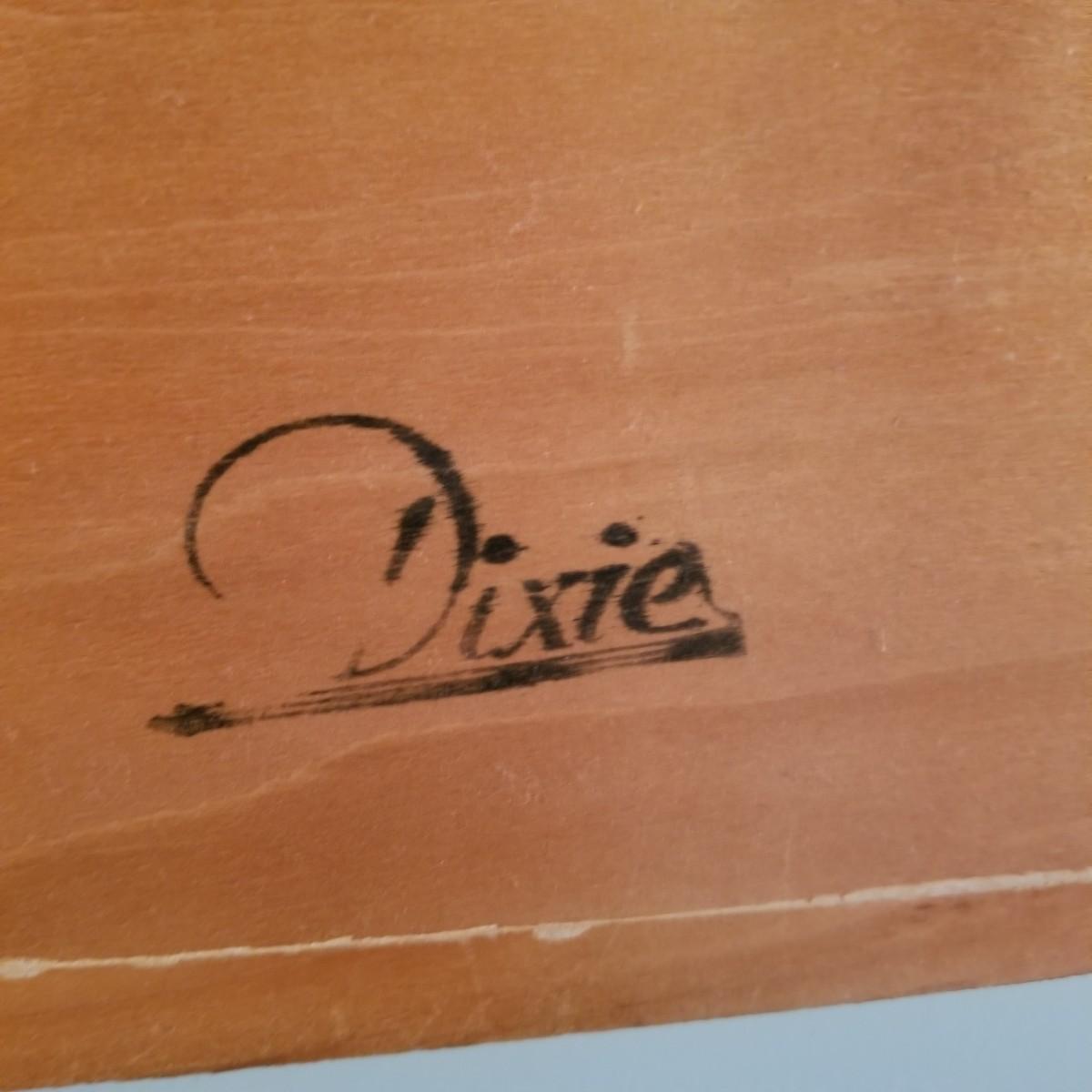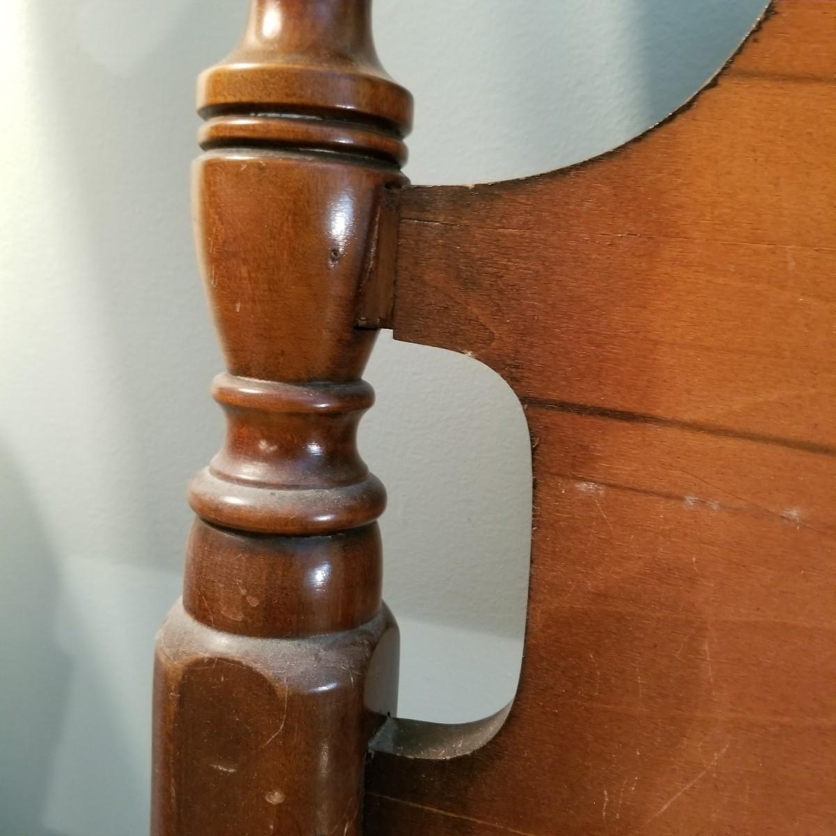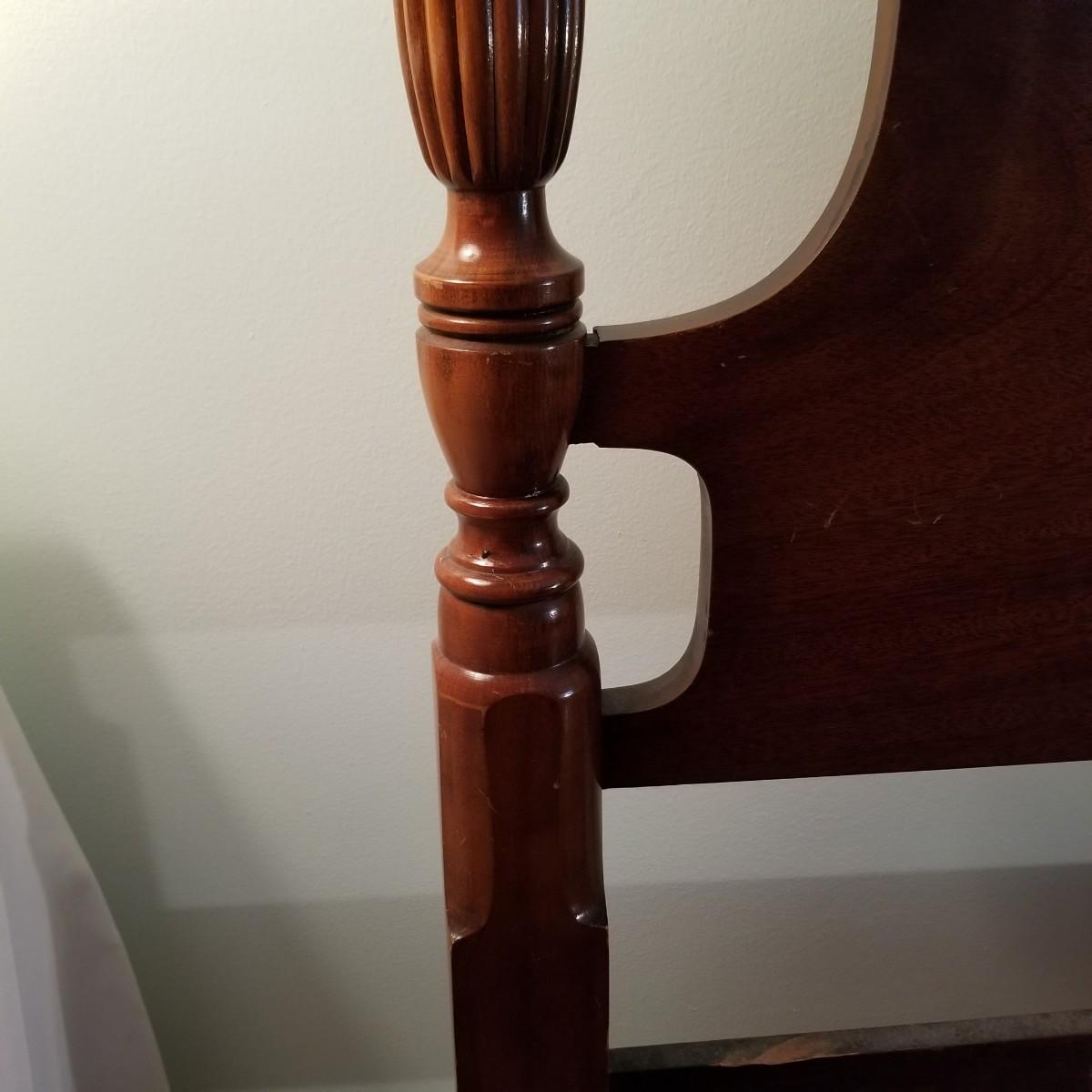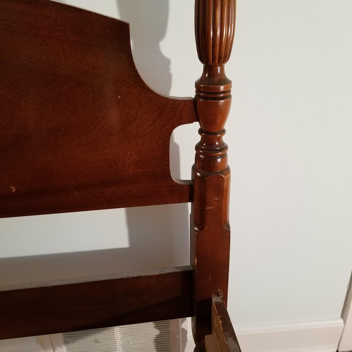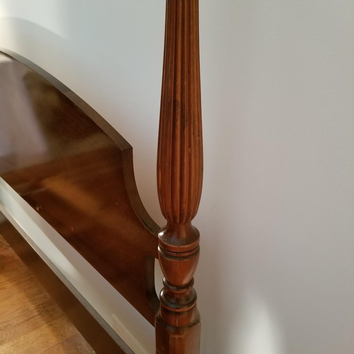 Full size Dixie brand wood bed frame with four reeded posts. Has side rails and slats. Frame measures 56" x 82", headboard is 54" h and footboard is 48" h. Frame is a mahogany color and in fair condition. Mattresscfoundatio height approximately 12".See photos for detail. Bed is broken down for transport, is on second floor. Local pickup only.