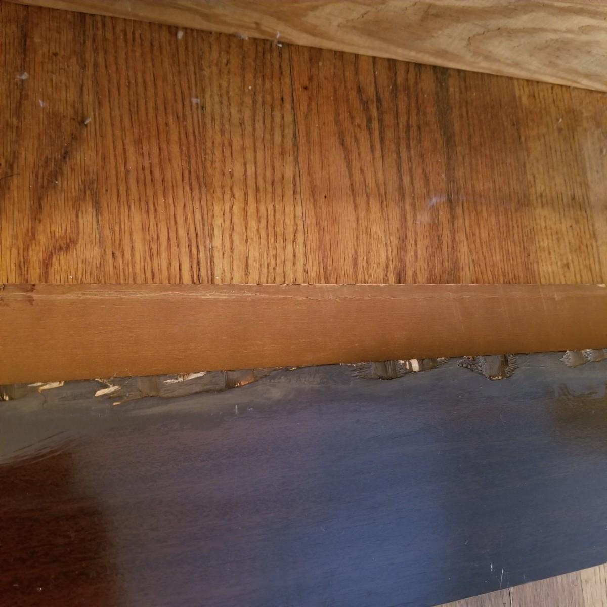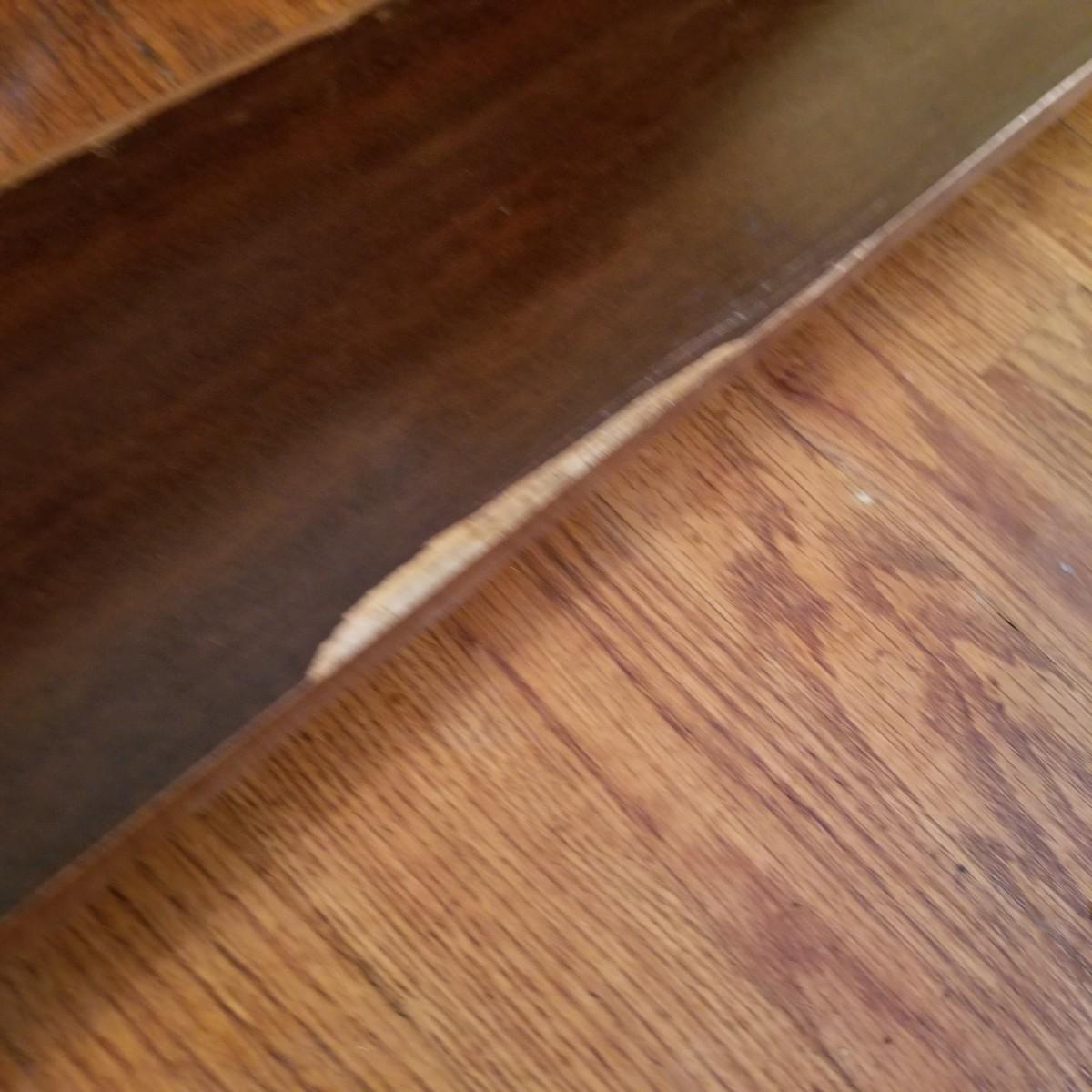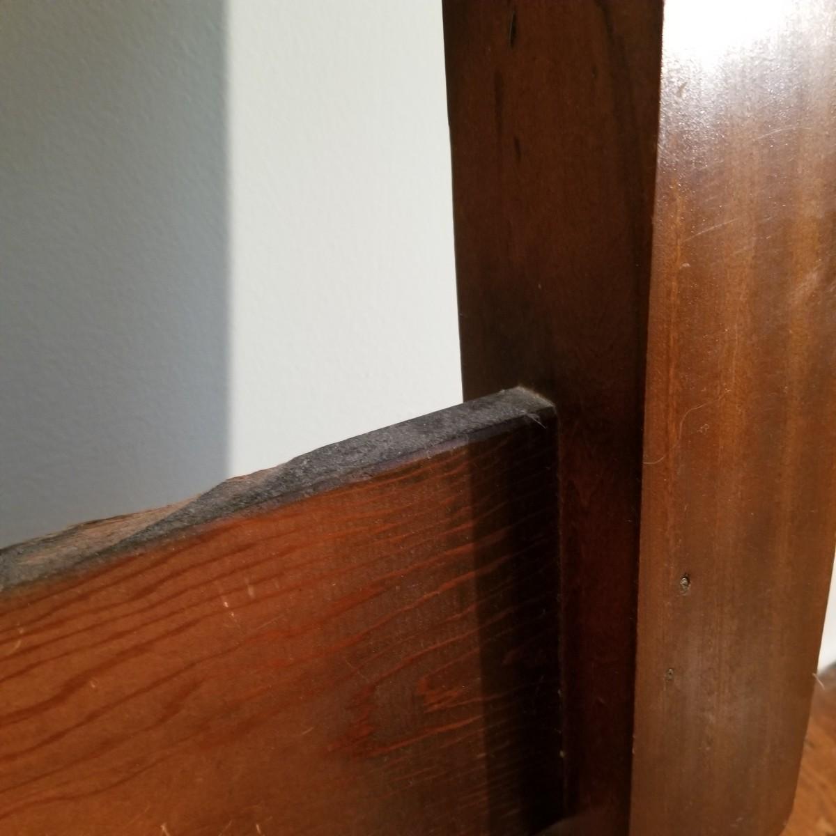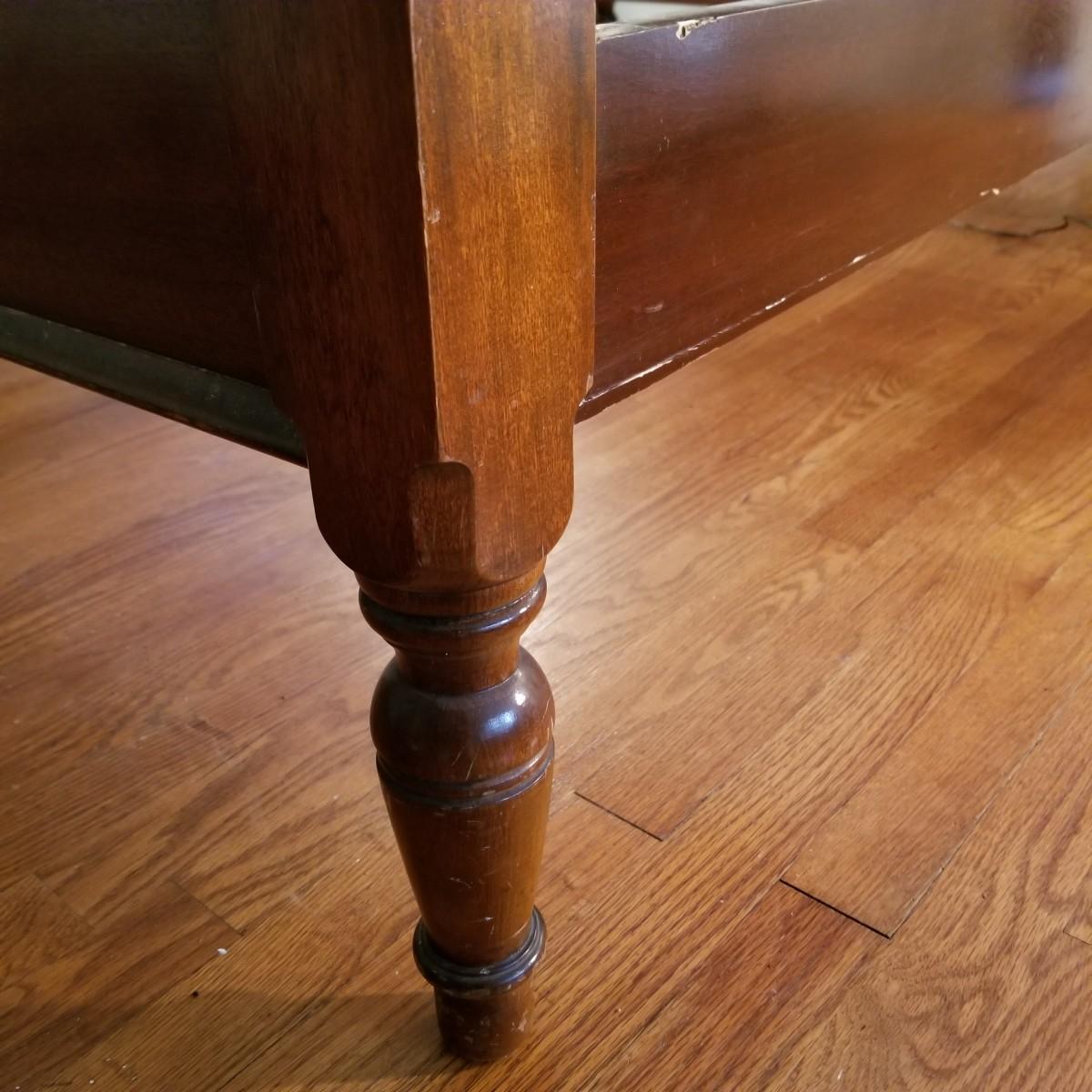 Full size Dixie brand wood bed frame with four reeded posts. Has side rails and slats. Frame measures 56" x 82", headboard is 54" h and footboard is 48" h. Frame is a mahogany color and in fair condition. Mattresscfoundatio height approximately 12".See photos for detail. Bed is broken down for transport, is on second floor. Local pickup only.